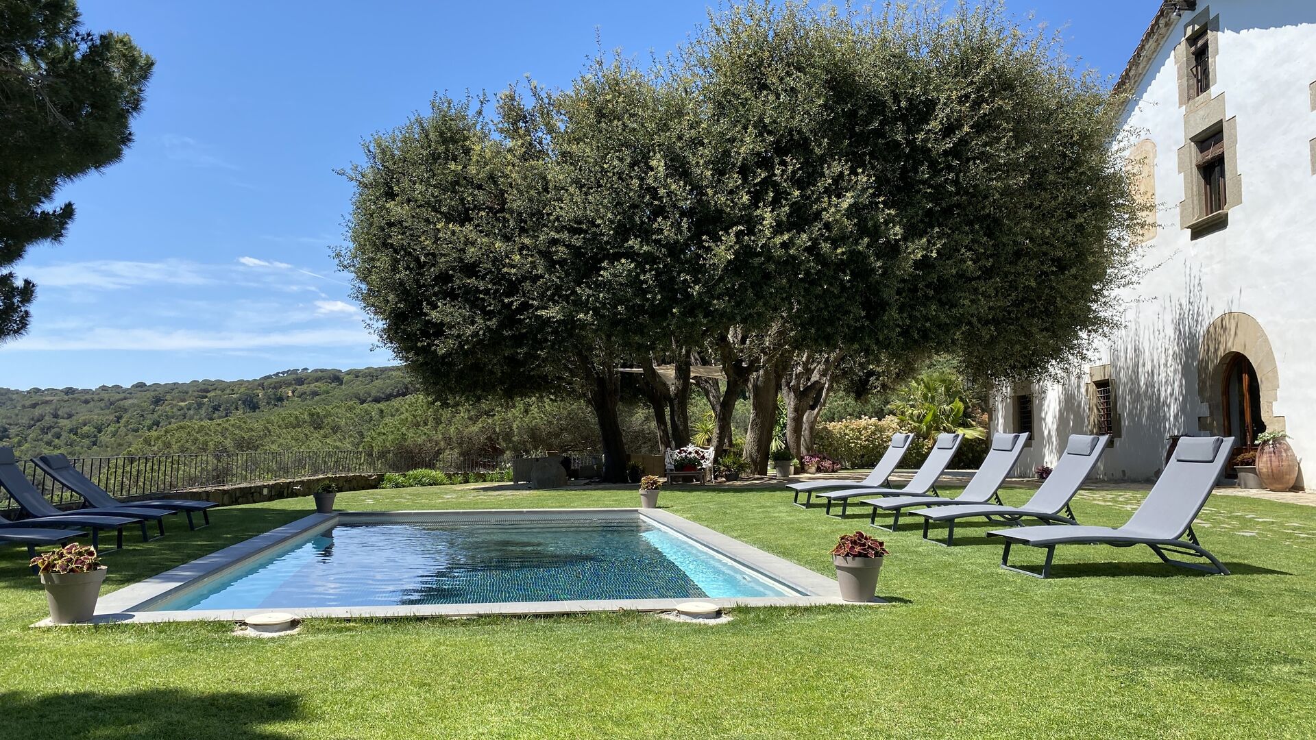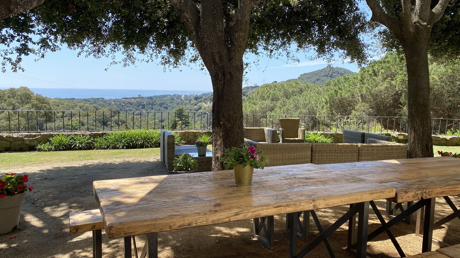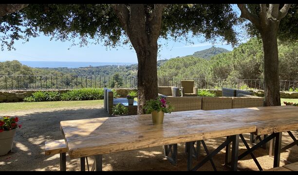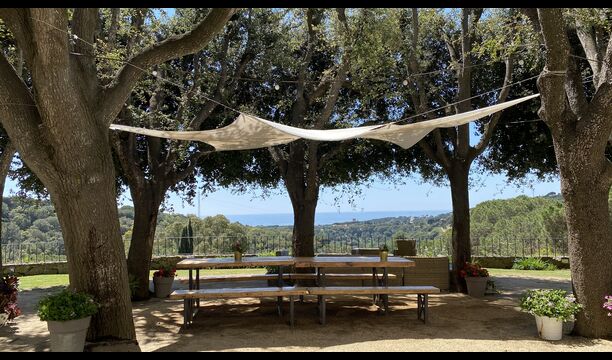 By the pool area you find a shady area with large dining table, which also shares the amazing view from the swimming pool. The perfect spot to enjoy outdoor meals or a drink with the entire holiday group, in the warm Catalan weather.