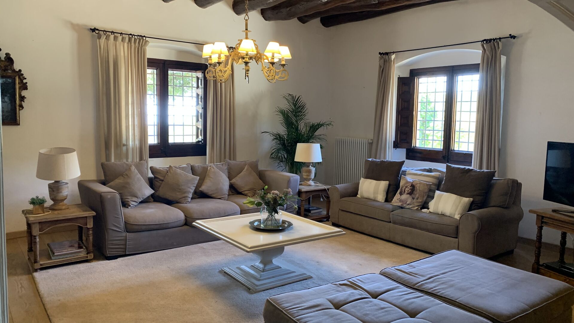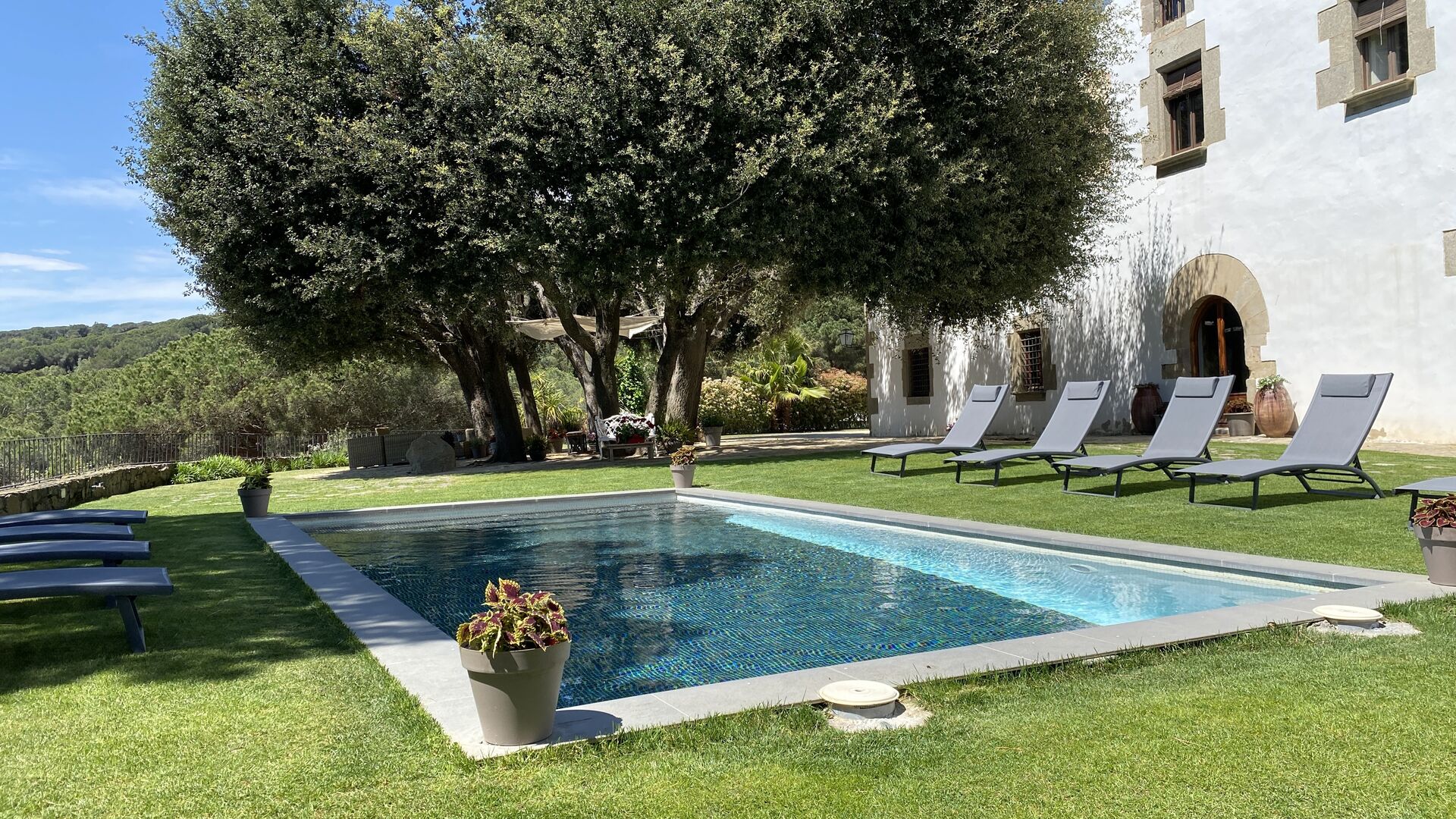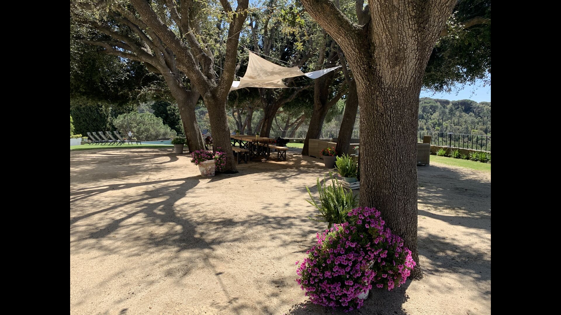 By the pool area you find a shady area with large dining table, which also shares the amazing view from the swimming pool. The perfect spot to enjoy outdoor meals or a drink with the entire holiday group, in the warm Catalan weather.