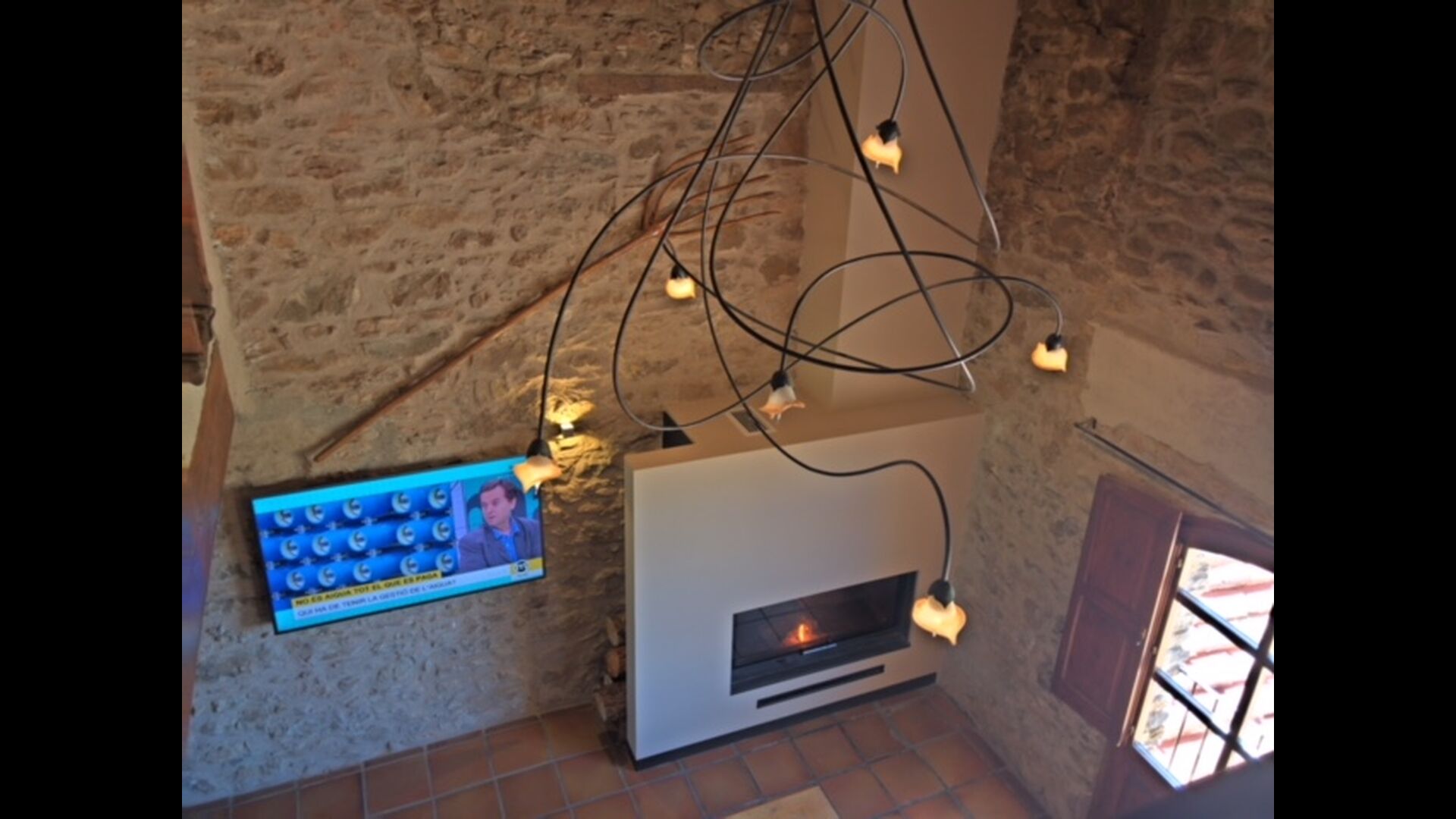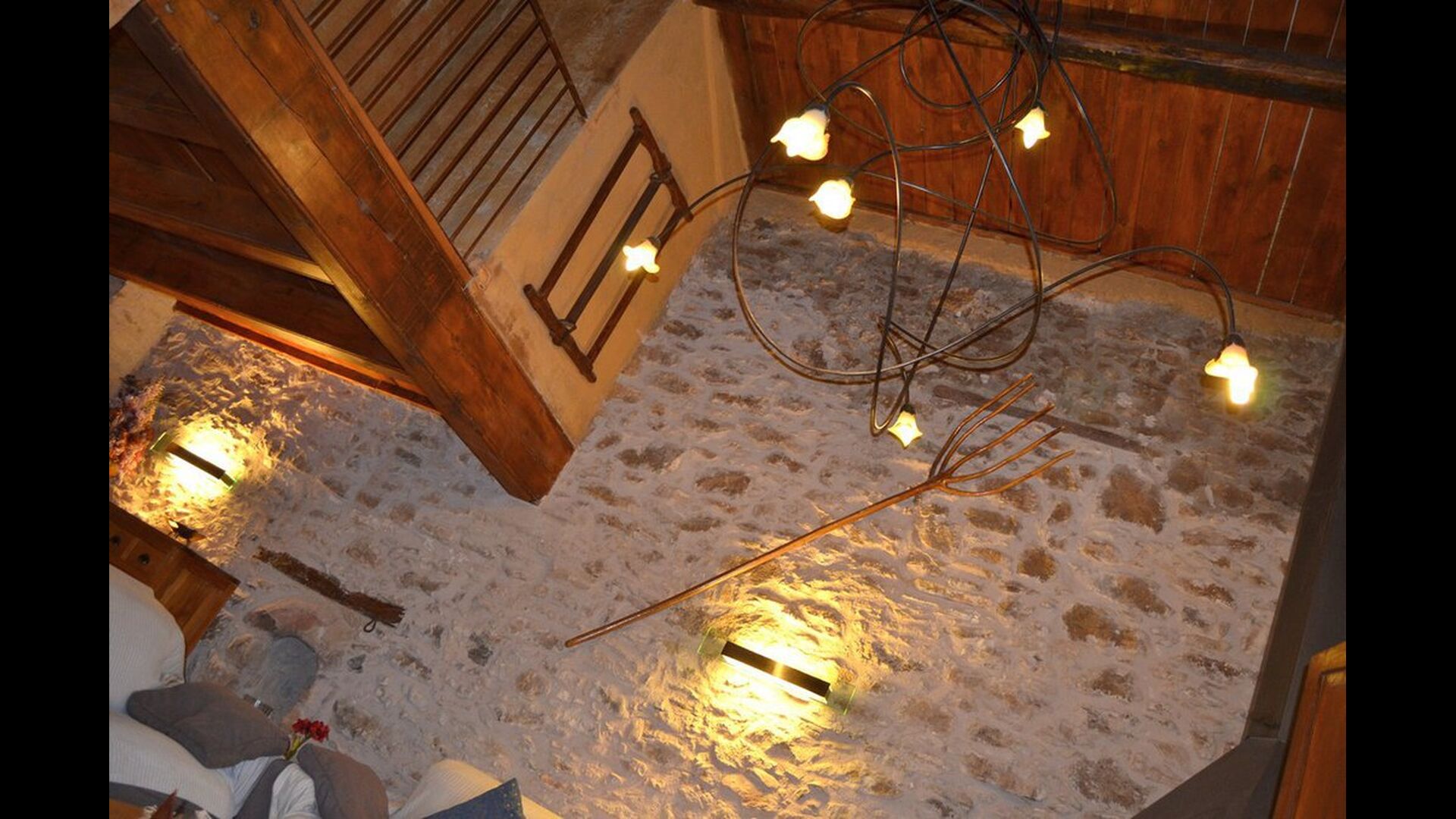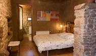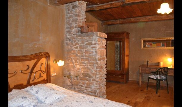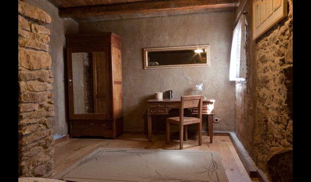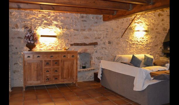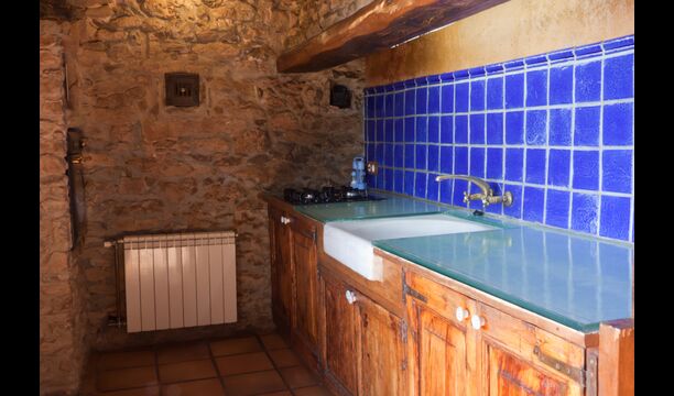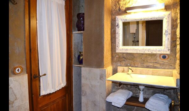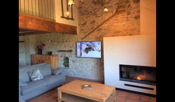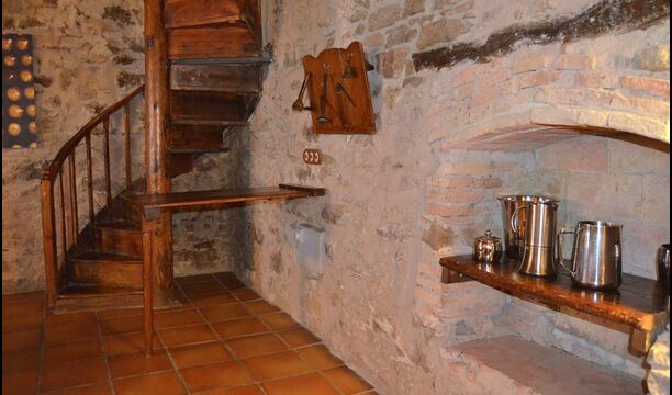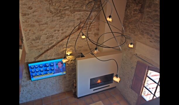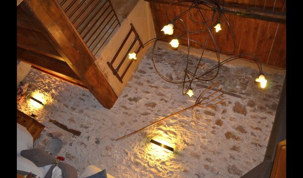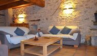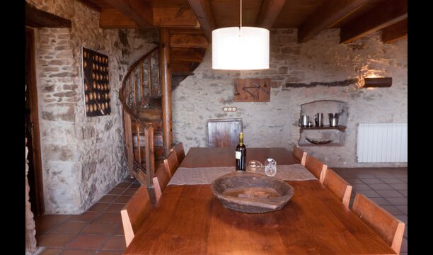 Furthermore this apartment is divided in two planes. Generally it is very authentic arranged and it is clear that there are respect for the old details and original materials. The rooms have high ceilings, giving, along with the pristine nature, a great sense of freedom and with that space to relax in. There is a large living room with nice sofas and a large dining room with a beautiful Catalan dining table. In addition there is a kitchen where you can find all the necessary utensils. The most amazing thing in this apartment is almost the breathtaking view, you can enjoy from the first floor’s private terrace. Here there can be, especially in the evening hours, experienced a great calmness that is unique to the mountains.