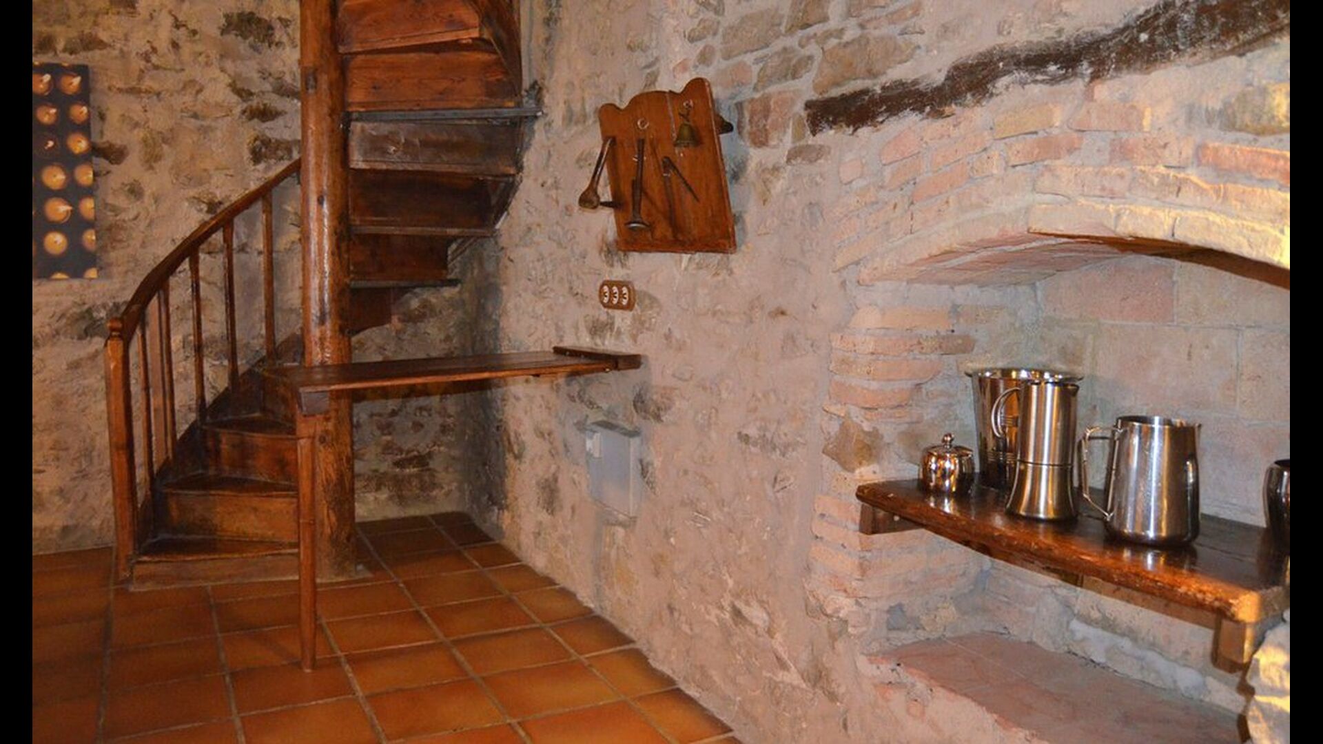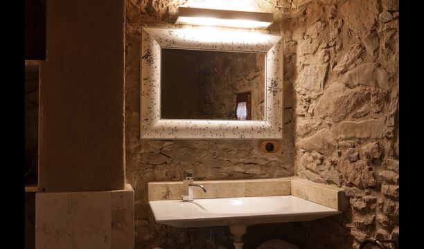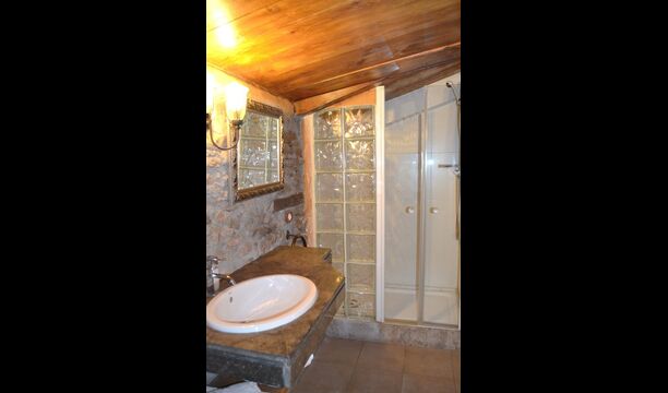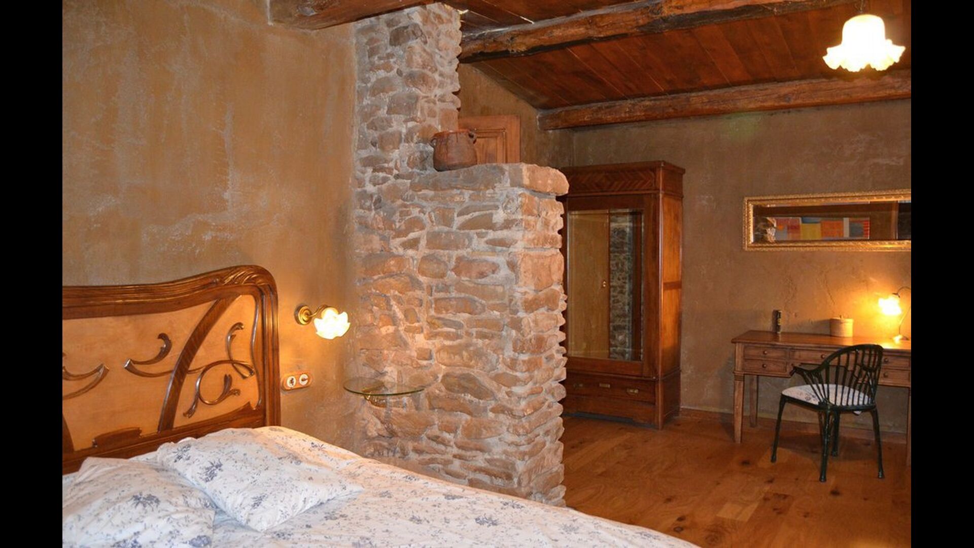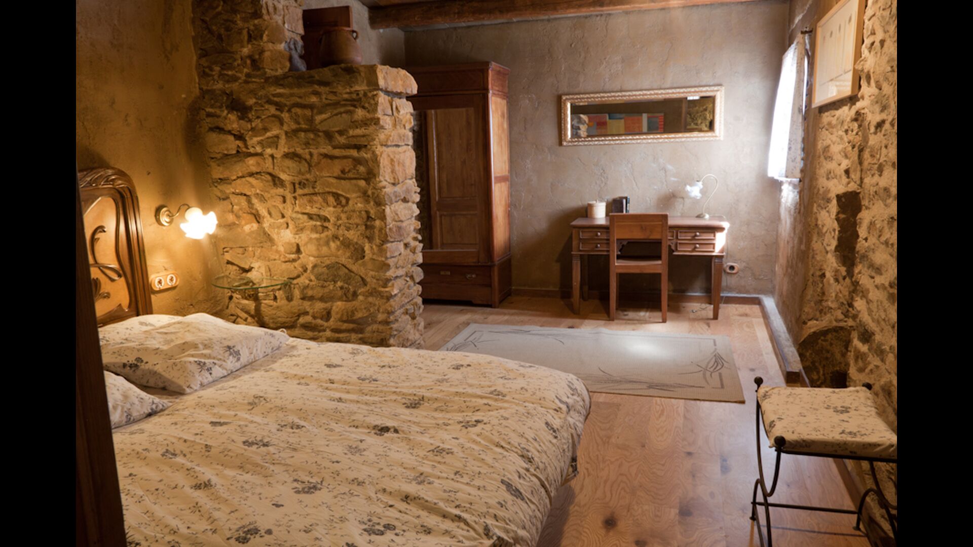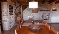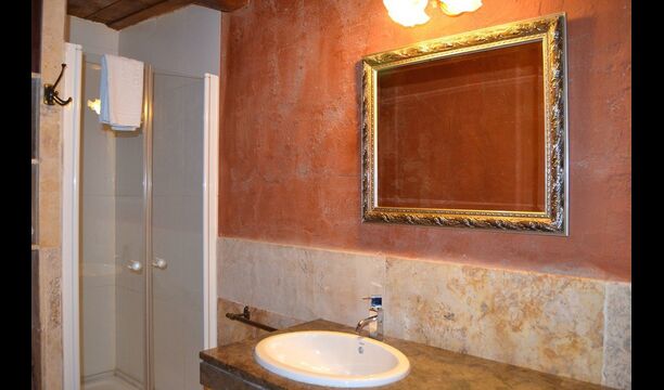 Furthermore this apartment is divided in two planes. Generally it is very authentic arranged and it is clear that there are respect for the old details and original materials. The rooms have high ceilings, giving, along with the pristine nature, a great sense of freedom and with that space to relax in. There is a large living room with nice sofas and a large dining room with a beautiful Catalan dining table. In addition there is a kitchen where you can find all the necessary utensils. The most amazing thing in this apartment is almost the breathtaking view, you can enjoy from the first floor’s private terrace. Here there can be, especially in the evening hours, experienced a great calmness that is unique to the mountains.