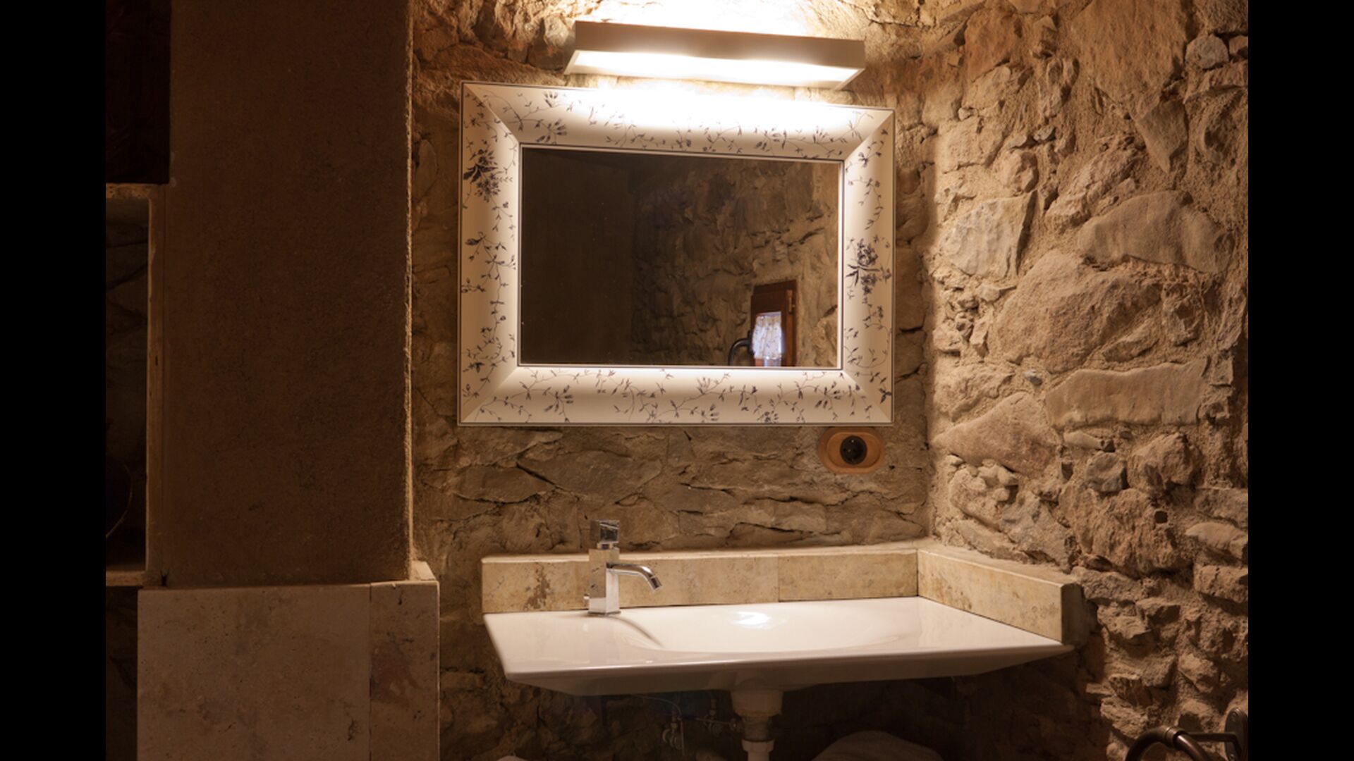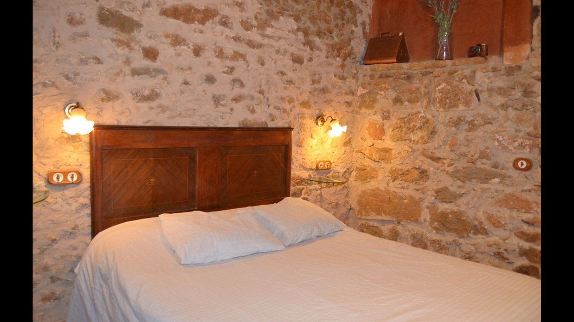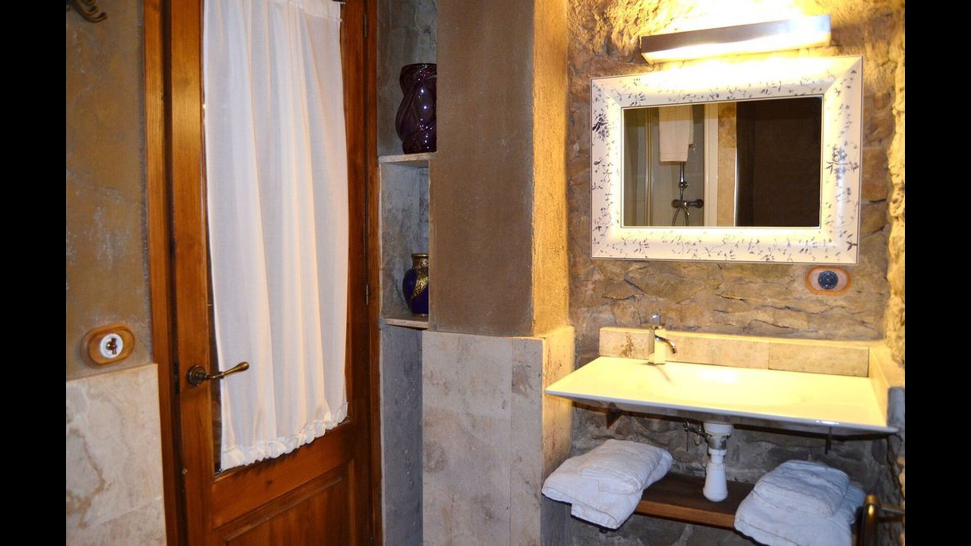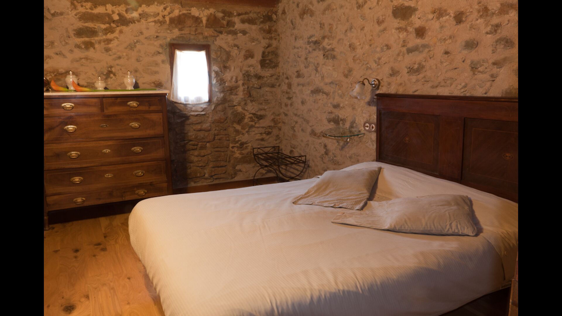 Furthermore this apartment is divided in two planes. Generally it is very authentic arranged and it is clear that there are respect for the old details and original materials. The rooms have high ceilings, giving, along with the pristine nature, a great sense of freedom and with that space to relax in. There is a large living room with nice sofas and a large dining room with a beautiful Catalan dining table. In addition there is a kitchen where you can find all the necessary utensils. The most amazing thing in this apartment is almost the breathtaking view, you can enjoy from the first floor’s private terrace. Here there can be, especially in the evening hours, experienced a great calmness that is unique to the mountains.