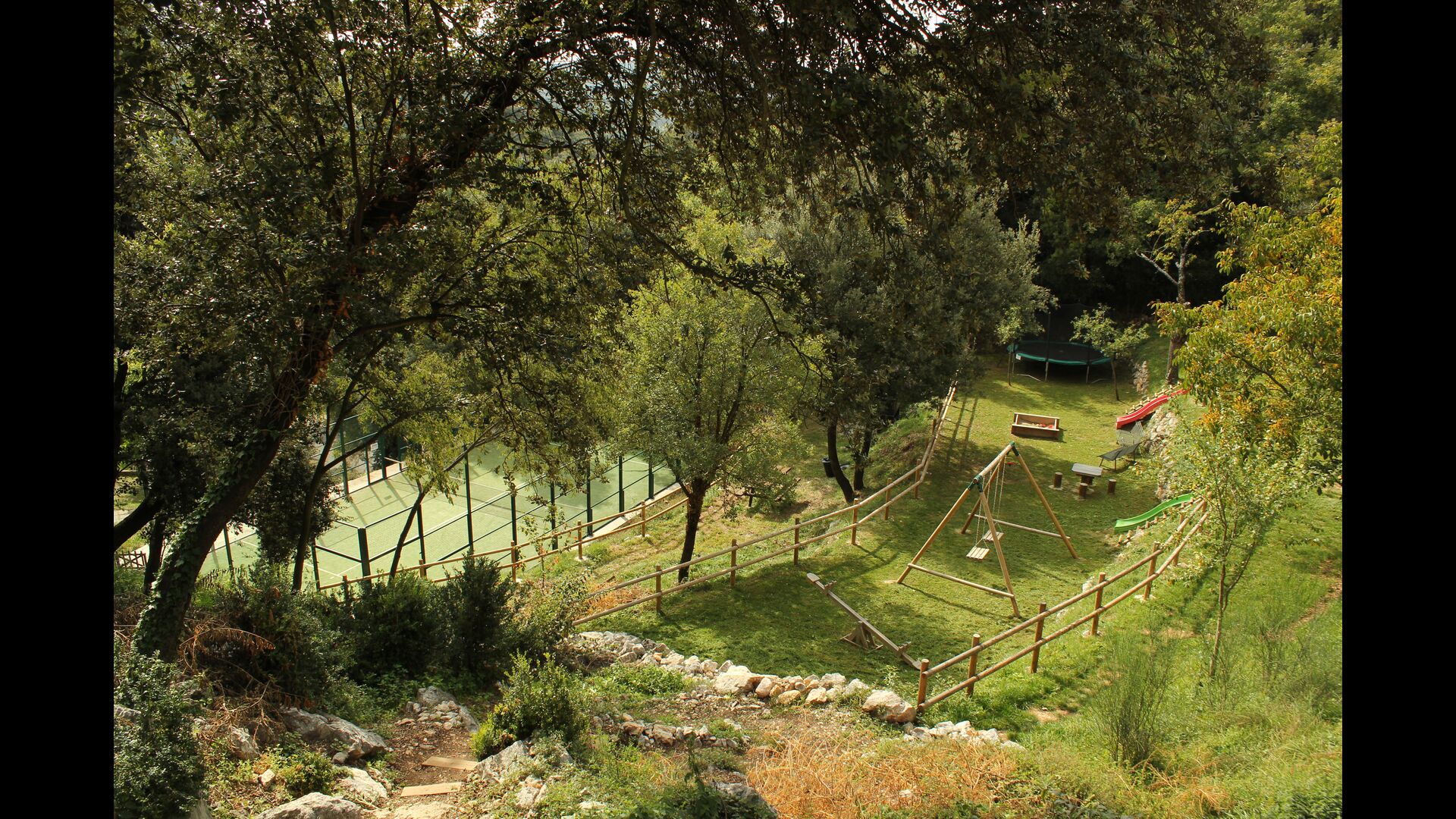 Vila Mas Vistador also has great views, due to the high location. The holiday home overlooks the small town, located at the foot of the property. The cozy town has two restaurants, a bakery, a local church, a large playground and a football pitch, and can be reached by foot within 2-3 minutes. The garden is divided into four different levels, one level with the tennis court, one with a children's playground, one with chill-out areas and last but not least the wonderful pool area. The green garden is incredibly beautiful and we imagine that you will spend many hours here.