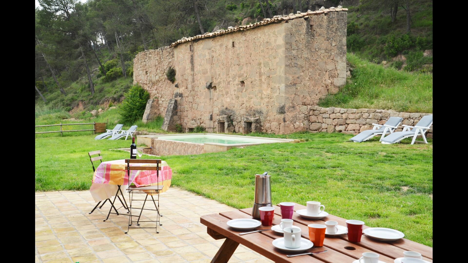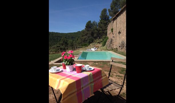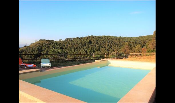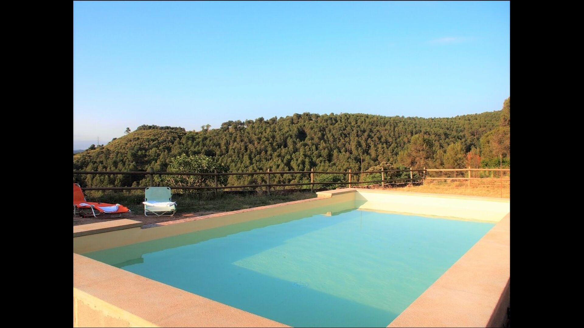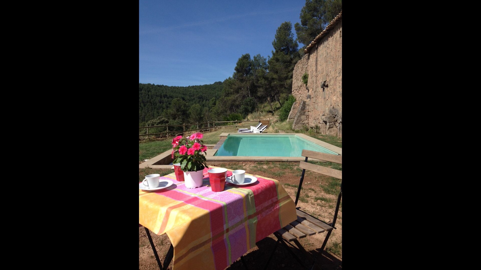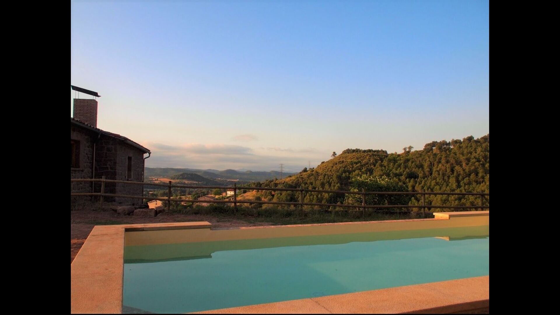 There is a large covered terrace on the right side of the house, just next to the pool. Here you will find the absolute musts when traveling to Catalonia: shade, BBQ, large outdoor table, a hammock and sun chairs. Right next to the terrace is the pool area which has a beautiful view looking over the valley. There are also sunchairs lined up on the side of the pool, where parents will be able to read a book and enjoy the sun, whilst watching over the children playing in the pool.