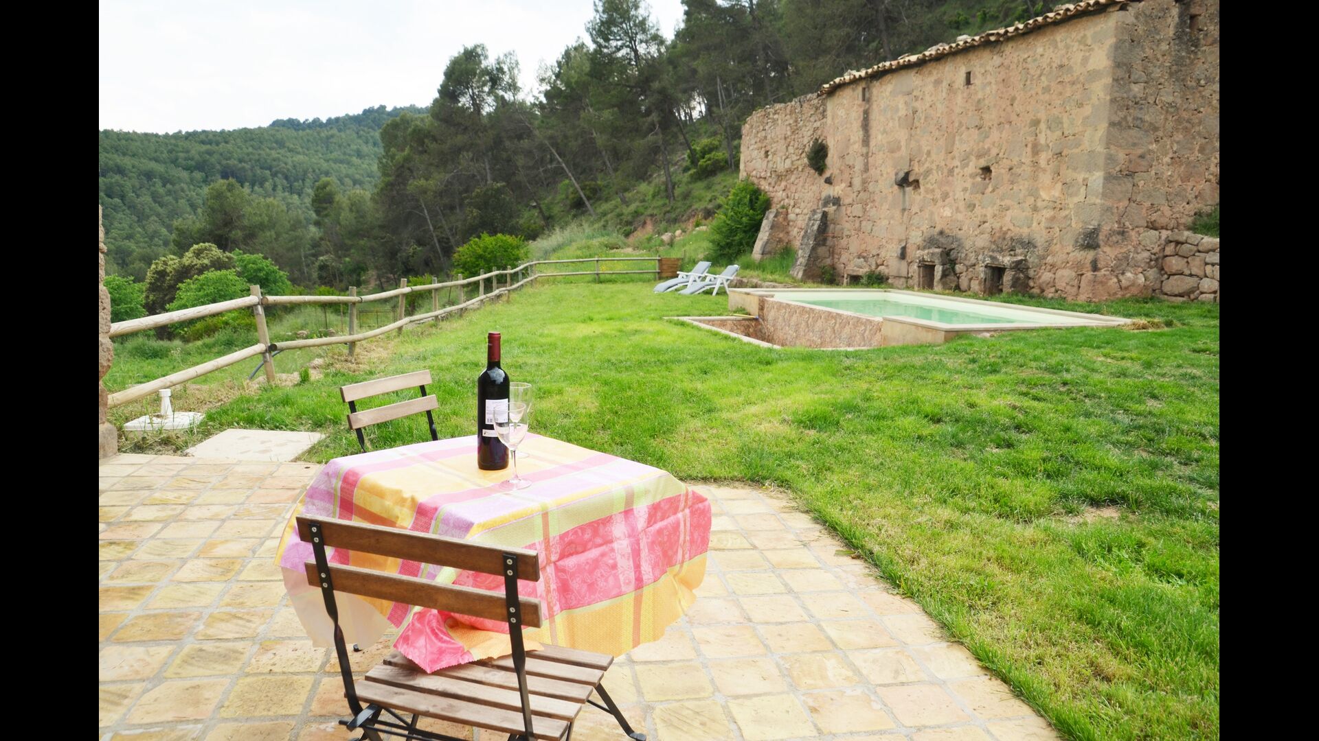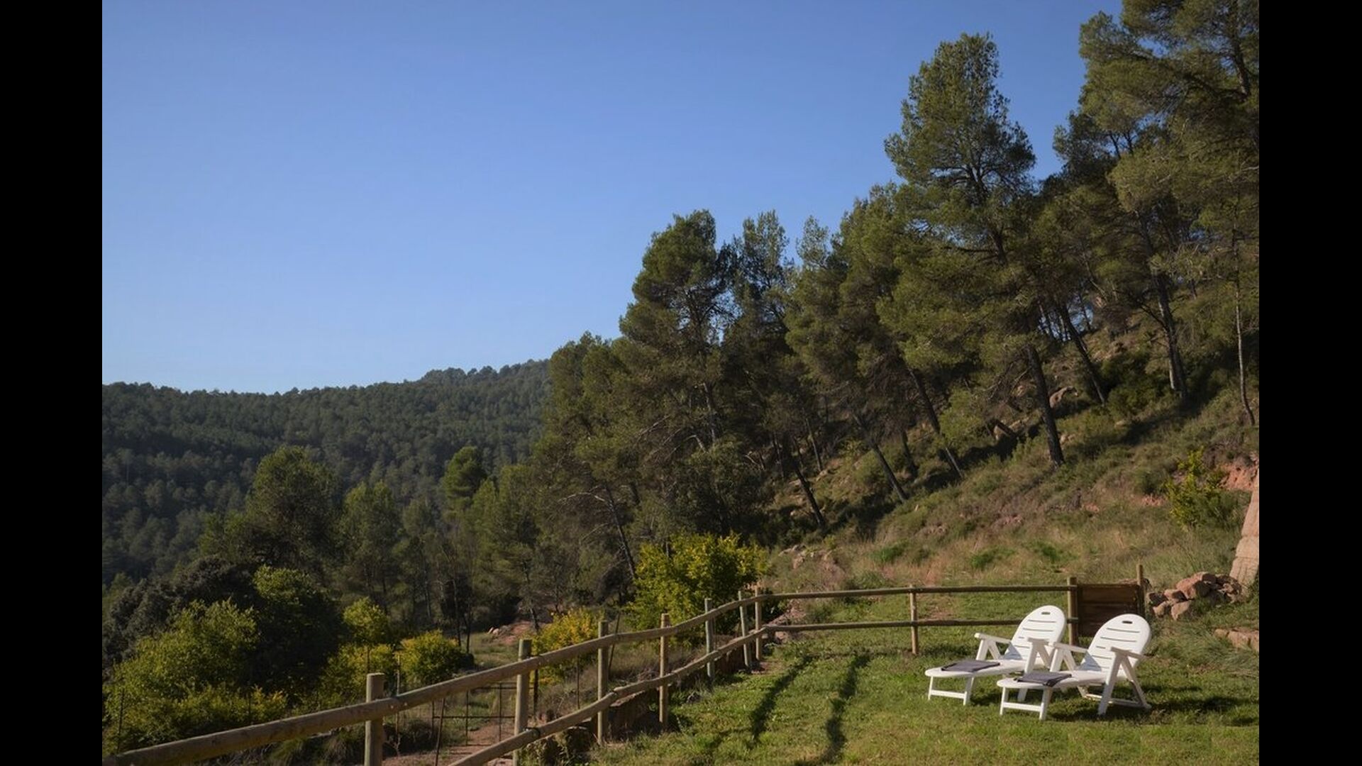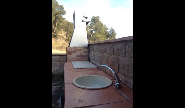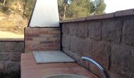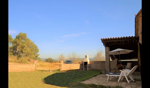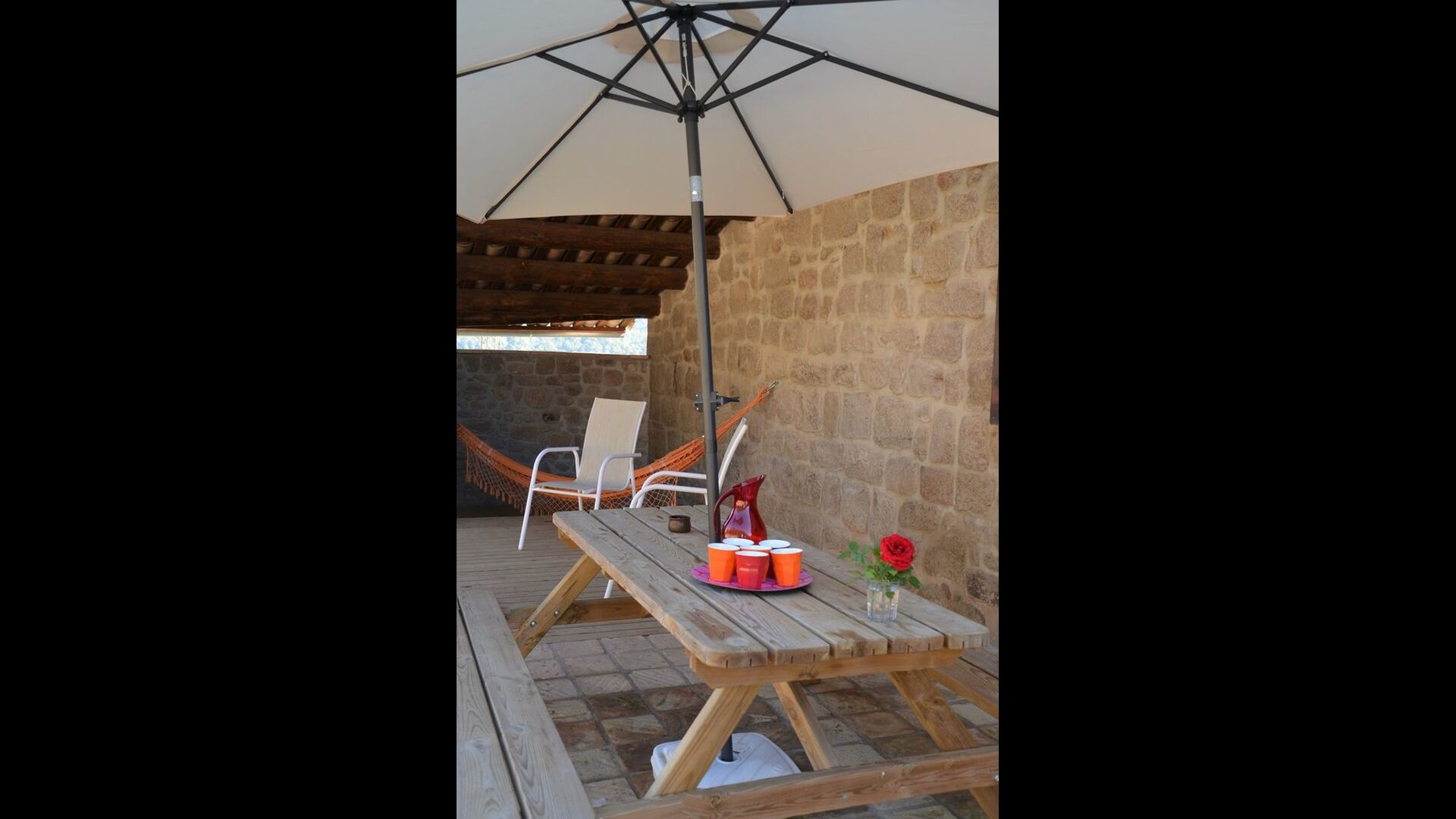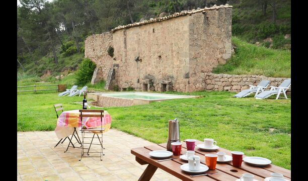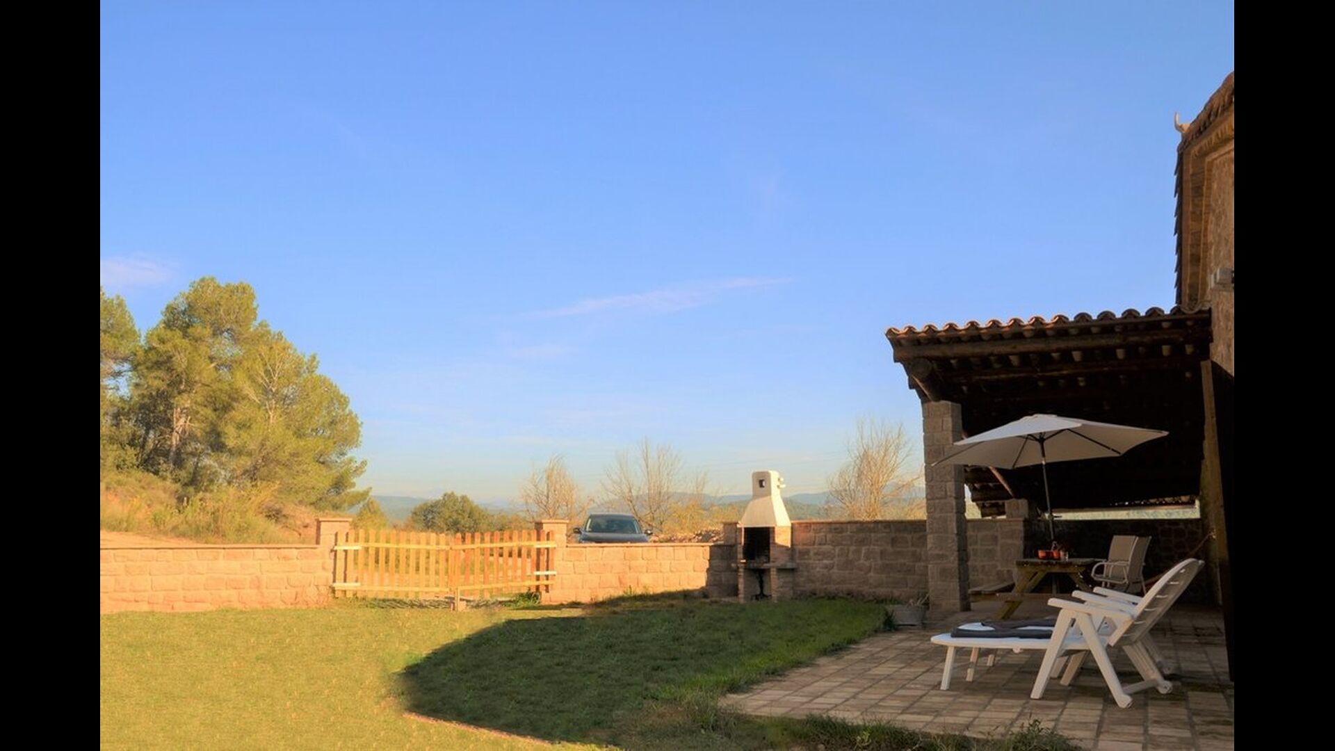 There is a large covered terrace on the right side of the house, just next to the pool. Here you will find the absolute musts when traveling to Catalonia: shade, BBQ, large outdoor table, a hammock and sun chairs. Right next to the terrace is the pool area which has a beautiful view looking over the valley. There are also sunchairs lined up on the side of the pool, where parents will be able to read a book and enjoy the sun, whilst watching over the children playing in the pool.