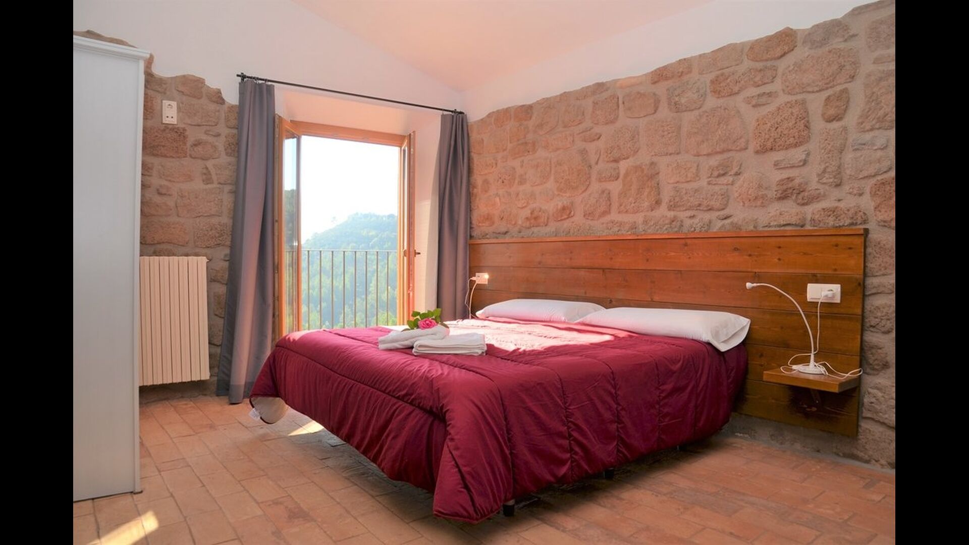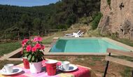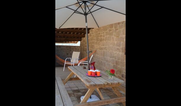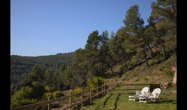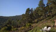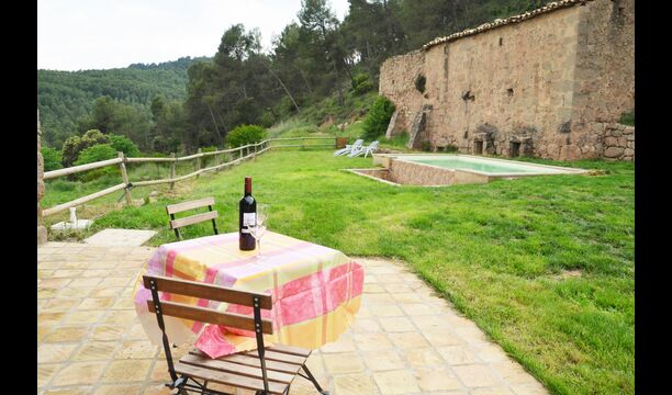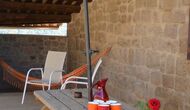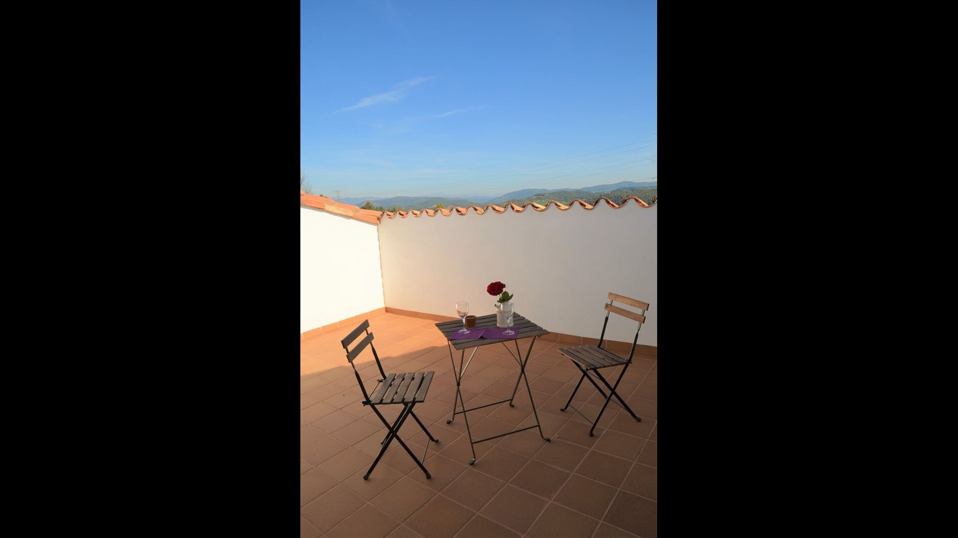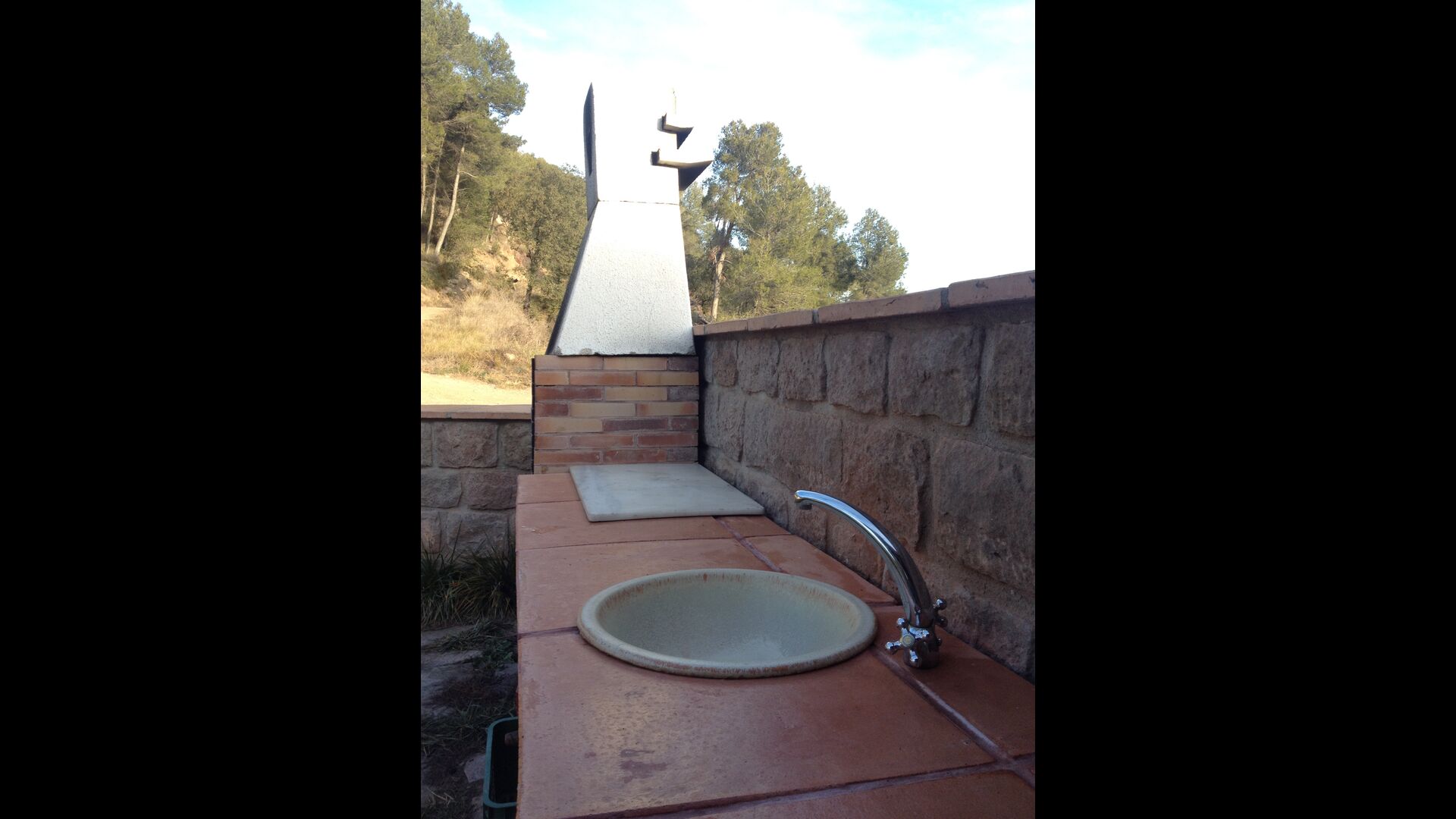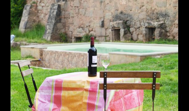There is a large covered terrace on the right side of the house, just next to the pool. Here you will find the absolute musts when traveling to Catalonia: shade, BBQ, large outdoor table, a hammock and sun chairs. Right next to the terrace is the pool area which has a beautiful view looking over the valley. There are also sunchairs lined up on the side of the pool, where parents will be able to read a book and enjoy the sun, whilst watching over the children playing in the pool.