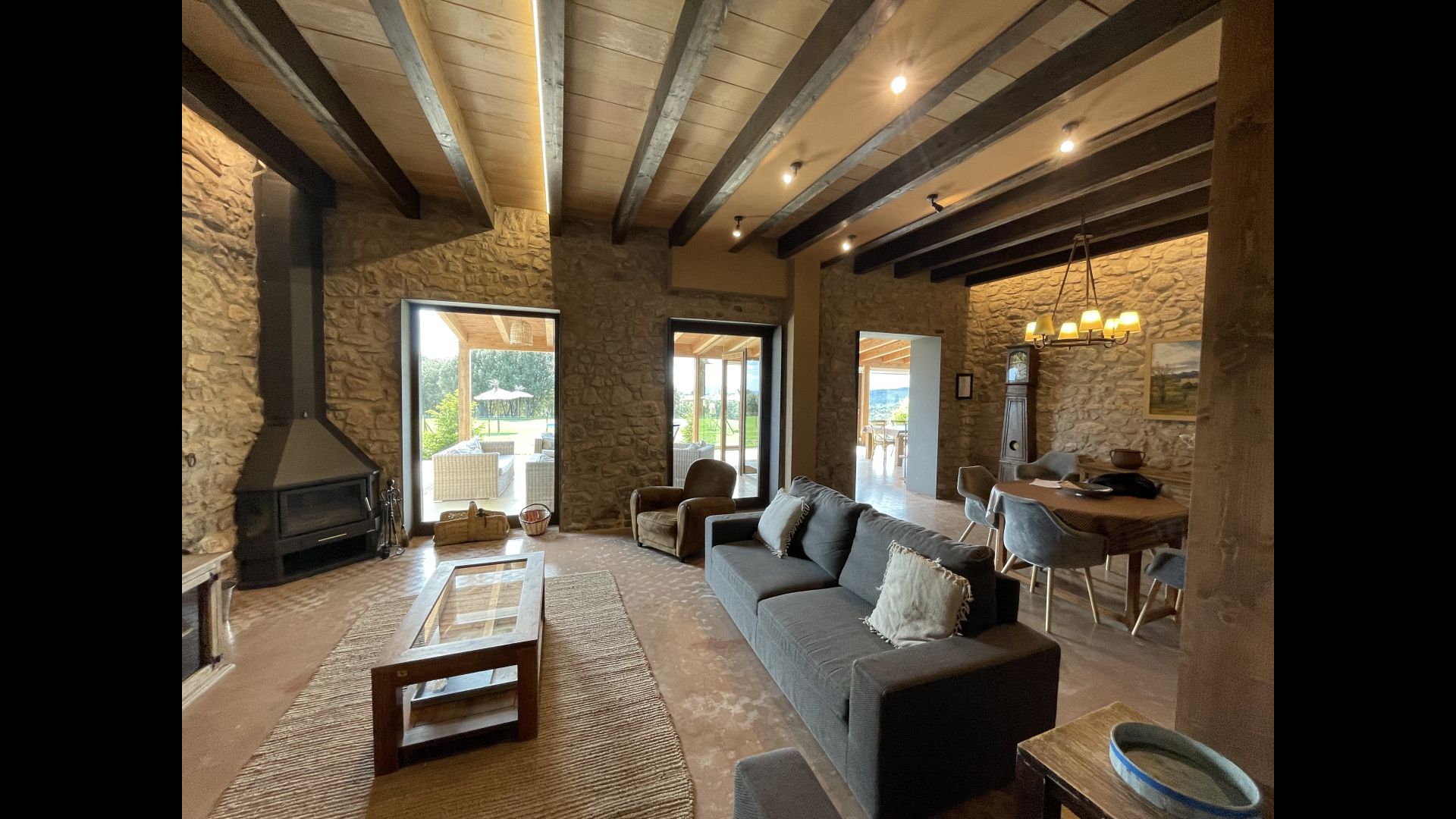 A spectacular house designed for large groups who want to enjoy a luxurious vacation, full of details from the original construction, framed in wooden furniture and warm fabrics. It has great views over the mountains of the Pre-pyrenees. It is located a little over 1 hour from Barcelona and Girona. On the 185-hectare land, 2 nearby houses are rented, totally separate and independent. Each with their own terrace and adjacent land. The pool, football field and volleyball field are shared by the 3 houses.