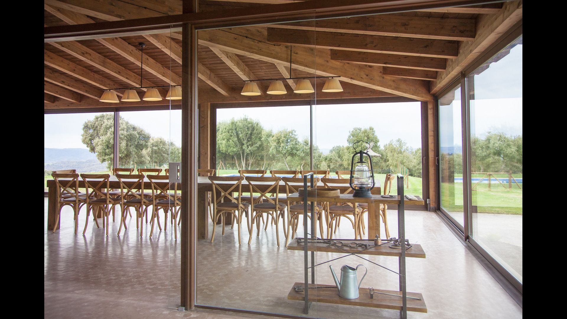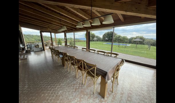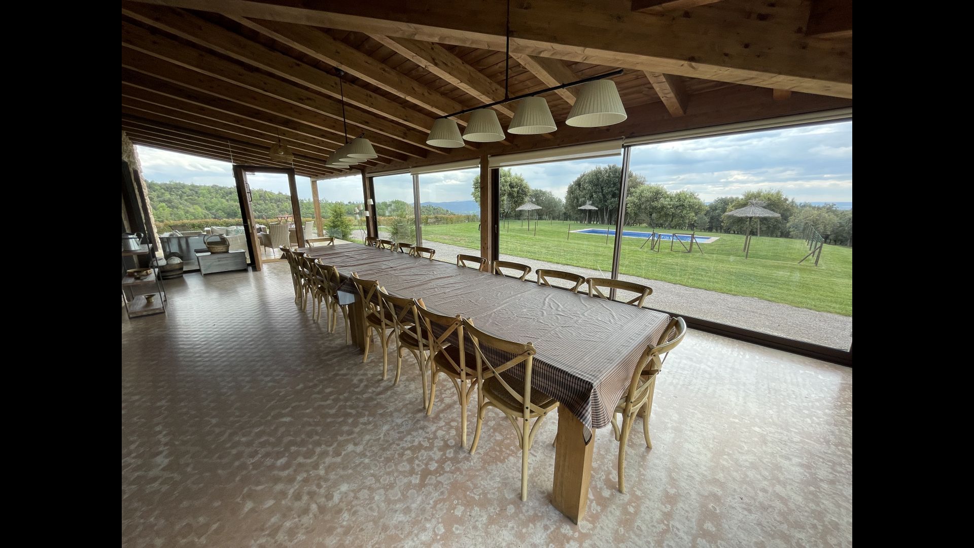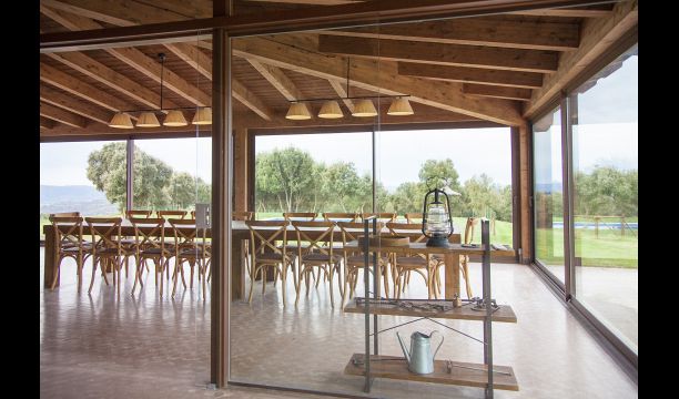 On the ground floor there is a porch located in front of the pool and with spectacular views of the mountains. From here, you can go into the dining room, which has views of the garden through the large windows.