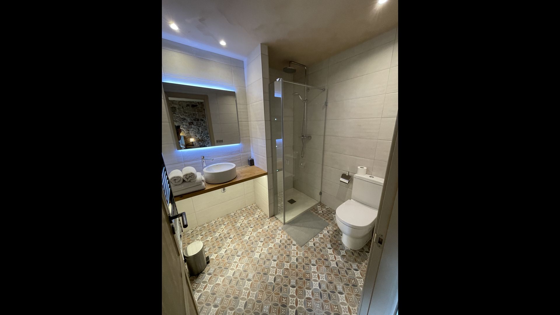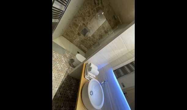To the right of the hallway are four of the five beautiful bedrooms in Can de Mateo. The four bedrooms are all doubles, three of which have bath ensuite. One of the rooms has direct access to the terrace. This floor also contains a further bathroom which is shared with the last bedroom on the top floor of the house.