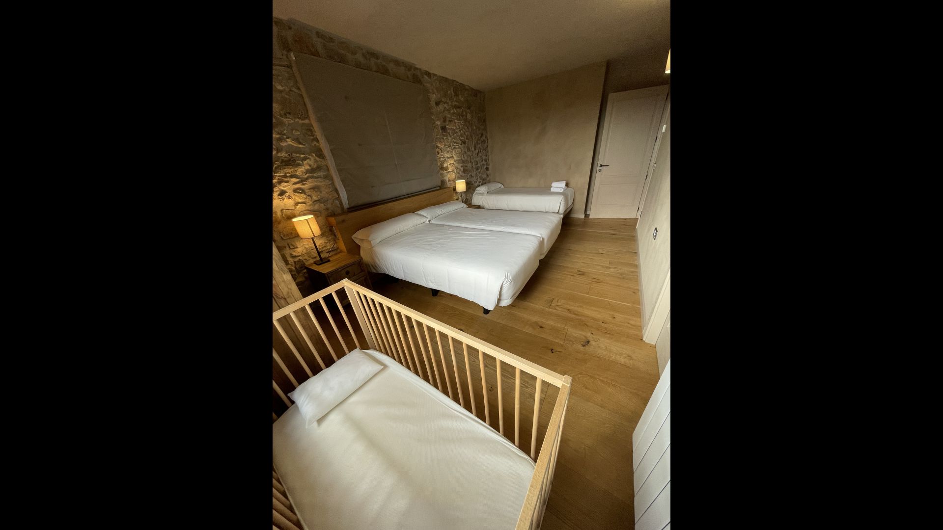 On the first floor you'll find 6 large double rooms with views of the nature, all with private bathrooms. On the second floor we find 2 more double rooms, and 2 quadruple rooms (with two single beds and a double bed, separated by a door). These also have all exterior windows and a private full bathroom.