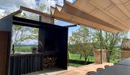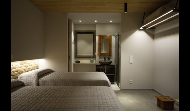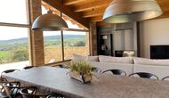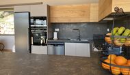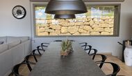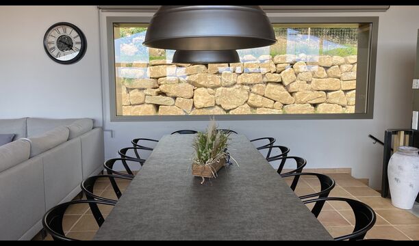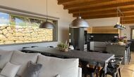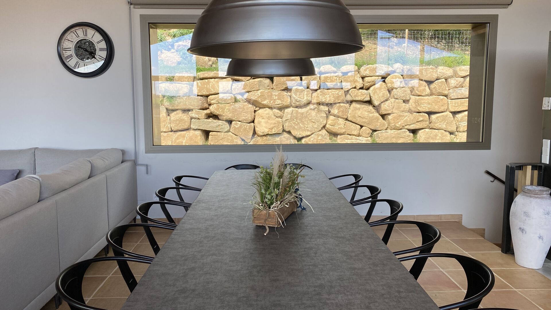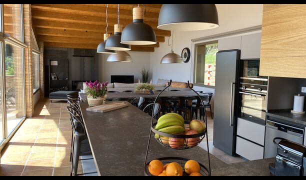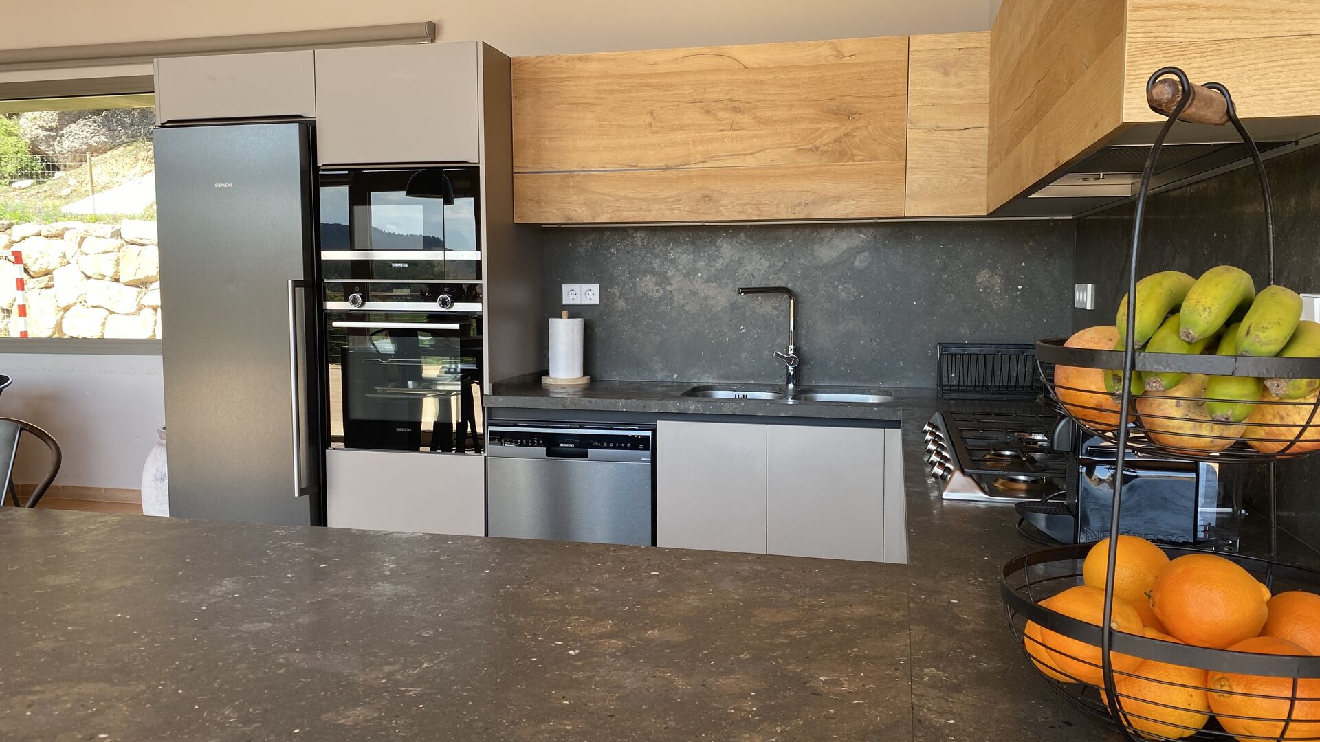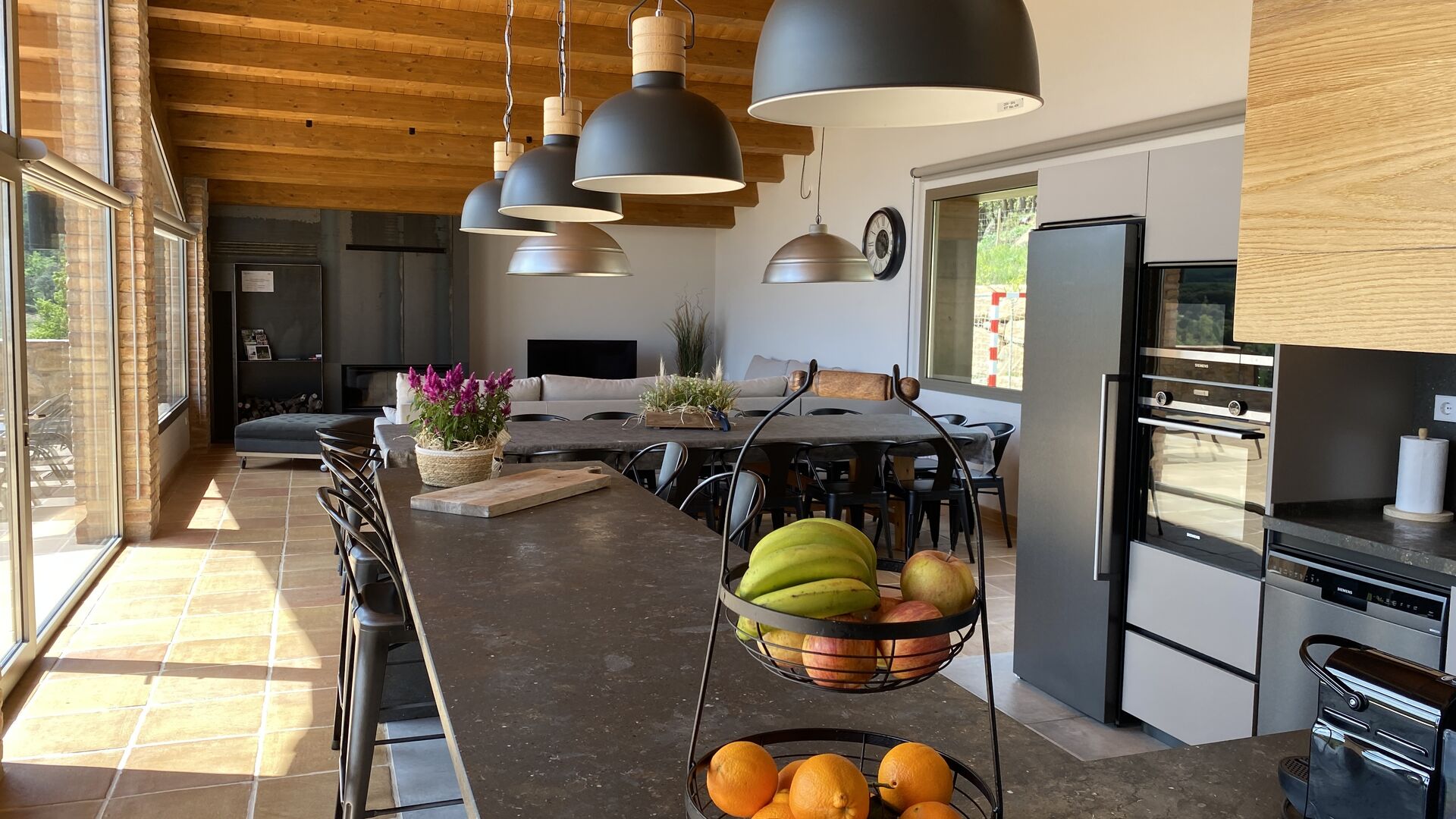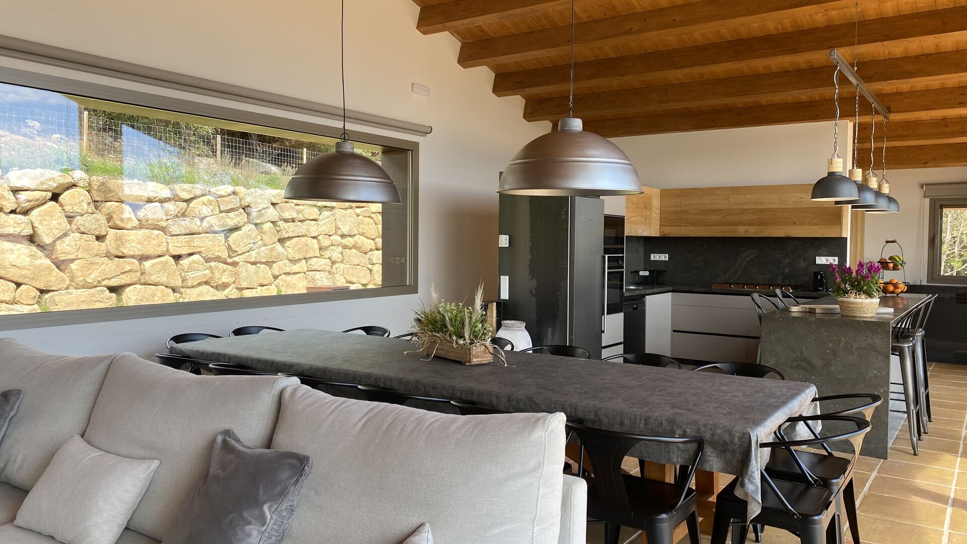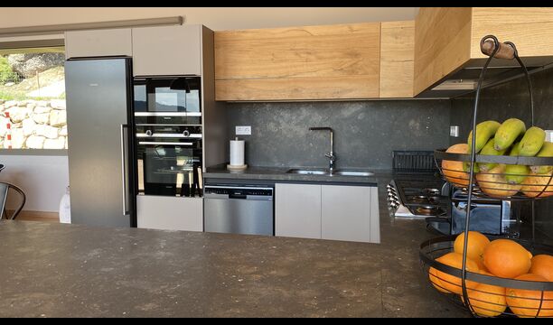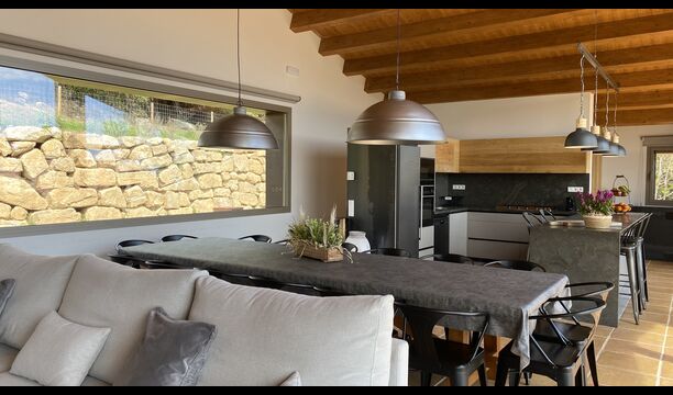 The house can accommodate 15 guests. On the top floor, you will find the large open kitchen and living space with a fireplace. This is truly a wonderful setting for cooking and enjoying meals, with panoramic views and direct access to the main terrace. You will also find a BBQ on the large terrace, so it is also possible to do your cooking outside.