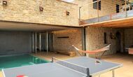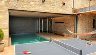 On the middle floor you will find two double rooms of 1.5 x 2m; one triple and two doubles, with single beds of 1.05 x 2m. All with interior bathrooms. On this floor you will also find the heated indoor / outdoor swimmingpool, which is designed such that it works like an outdoor pool during the summer, but in winter the walls can be closed and the heater is turned on. This allows for the pool to be used all year round! There is also a table tennis and table football along with an outdoor terrace.