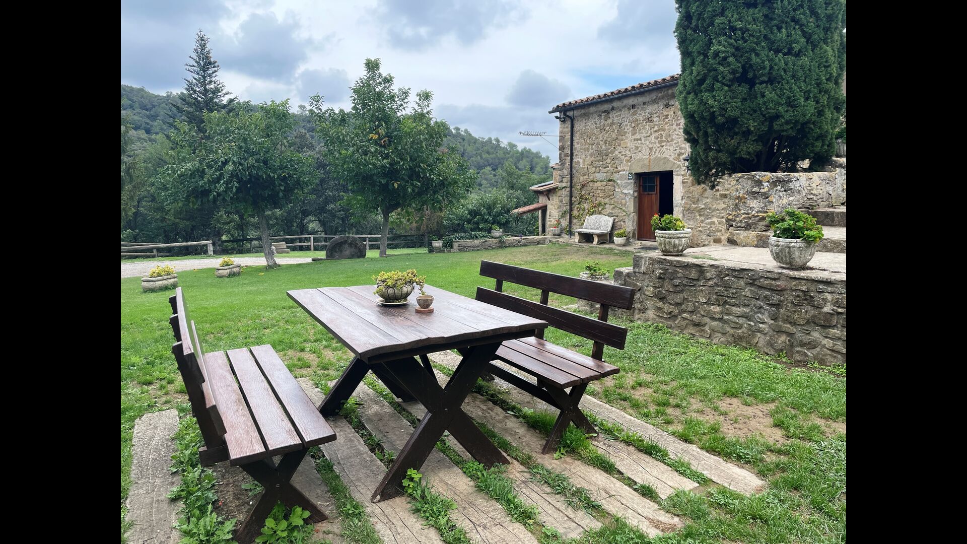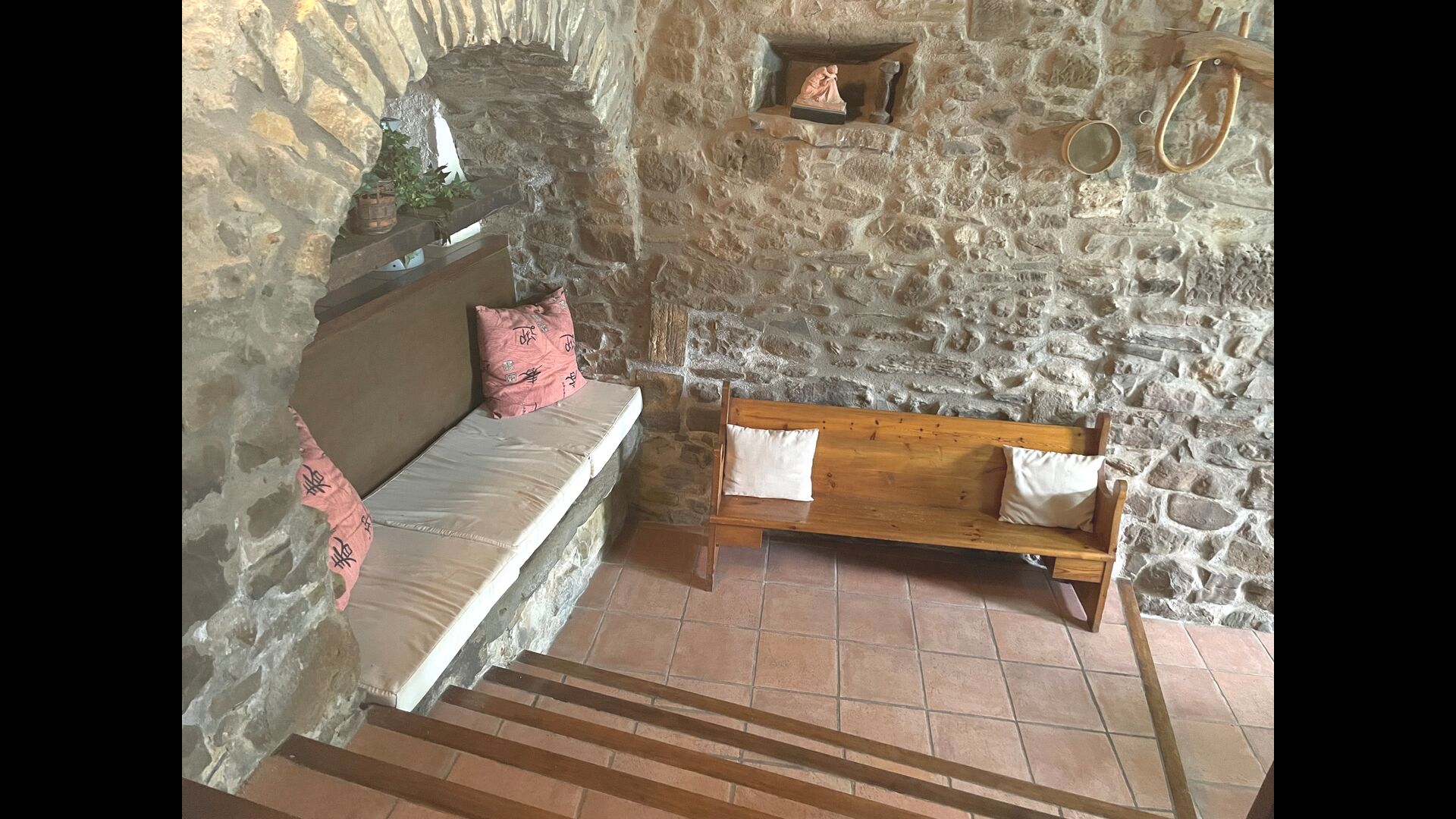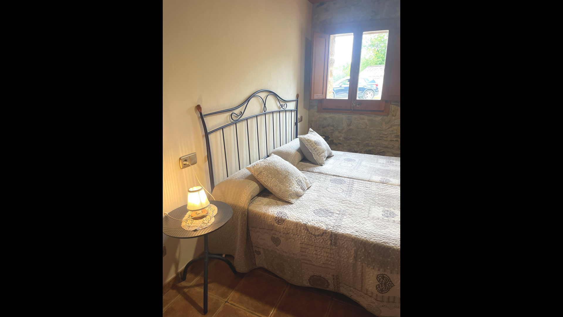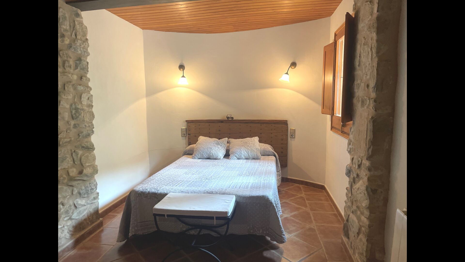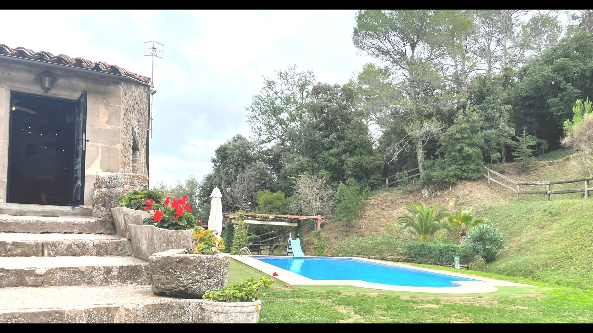 Are you looking for a completely secluded place but still not too far from a nice town with restaurants, Masia Sol de Marlant might be the place. Staying on a mountain of course requires arriving by a mountain road, but the road is fine and only the last part without pavement, so you can arrive without problems. The reward is stunning! What a natural place surrounded by nature and with views to the valley below. The energy source is sun cells, adding to the natural and sustainable feeling.