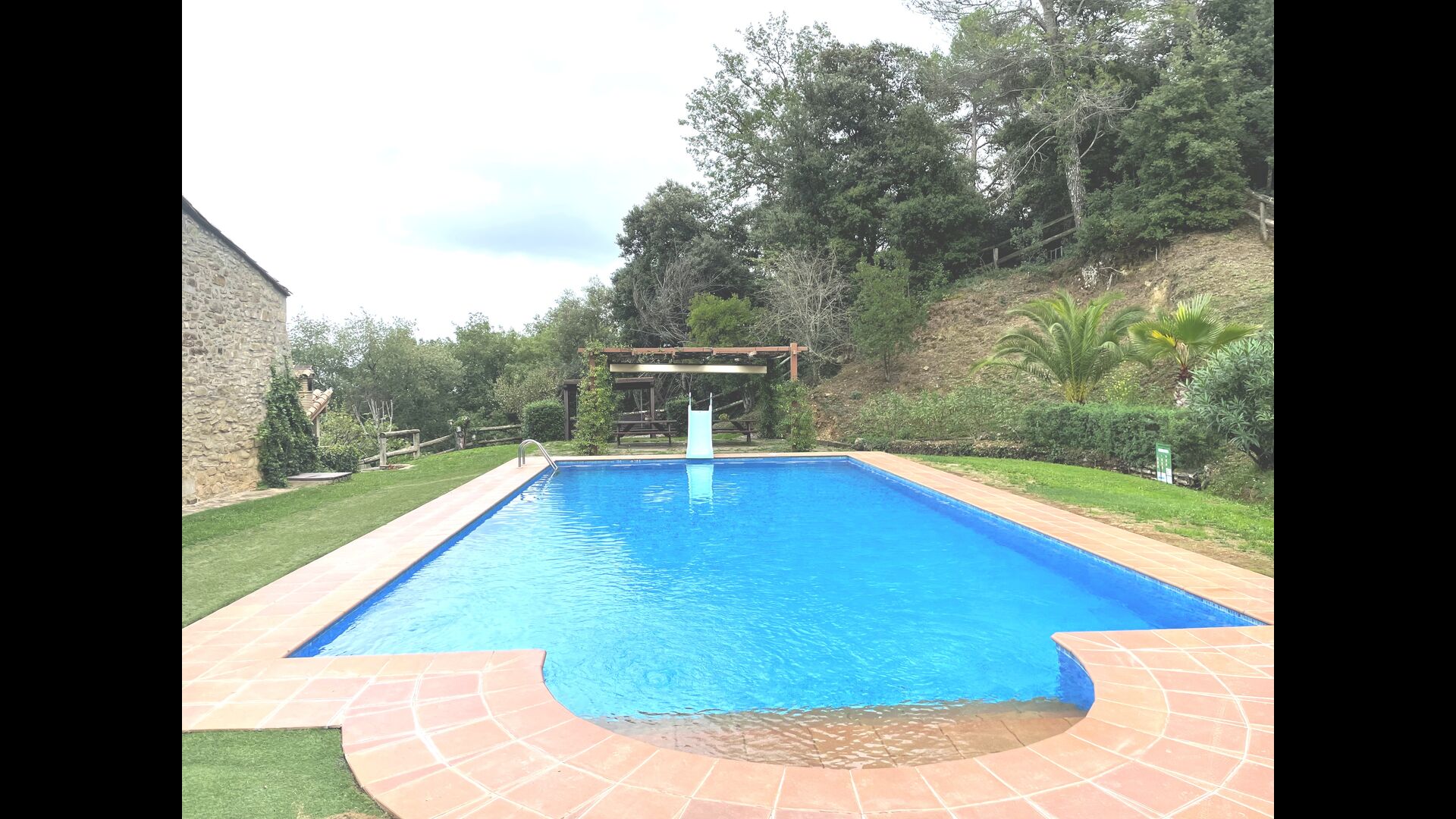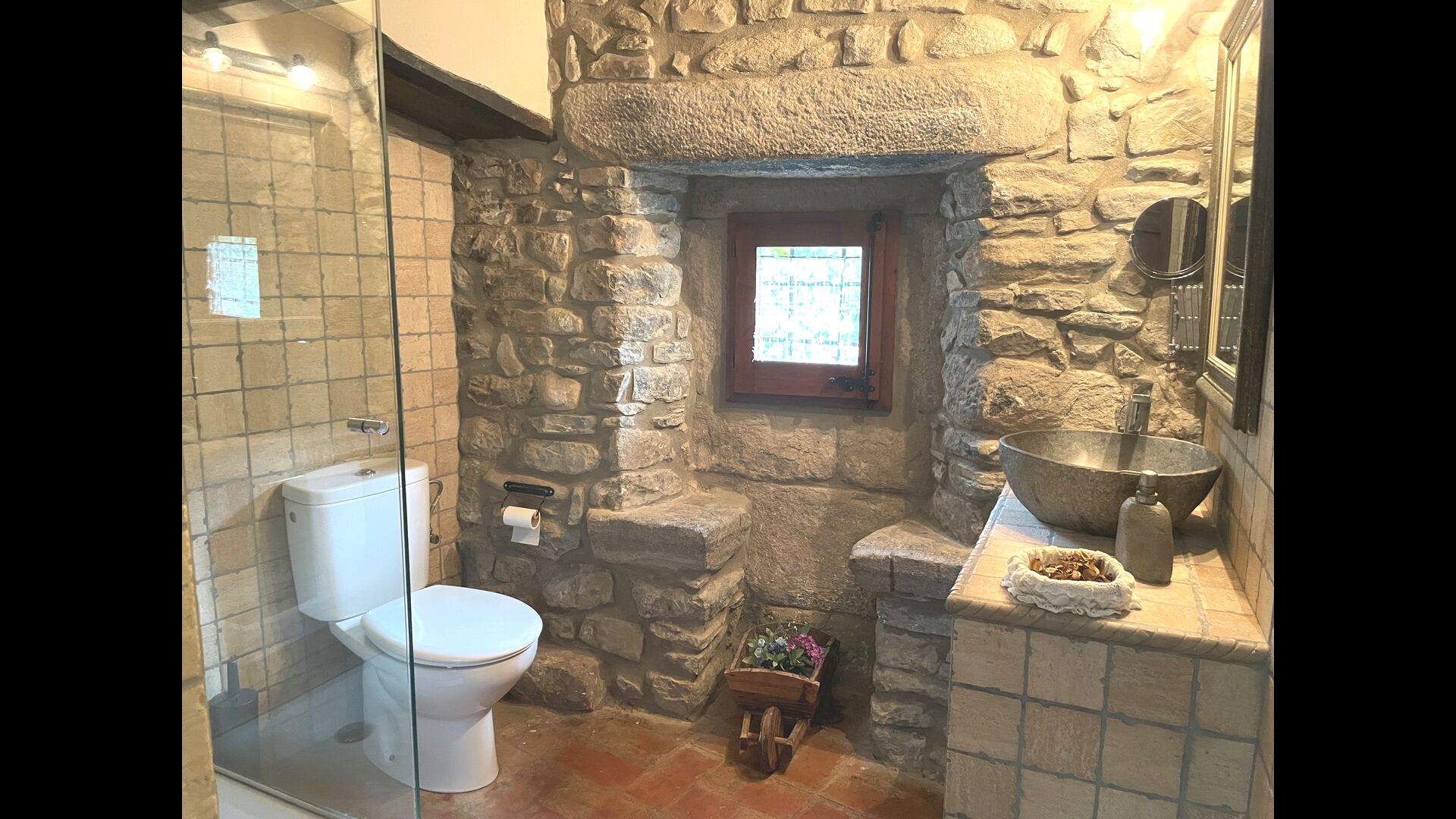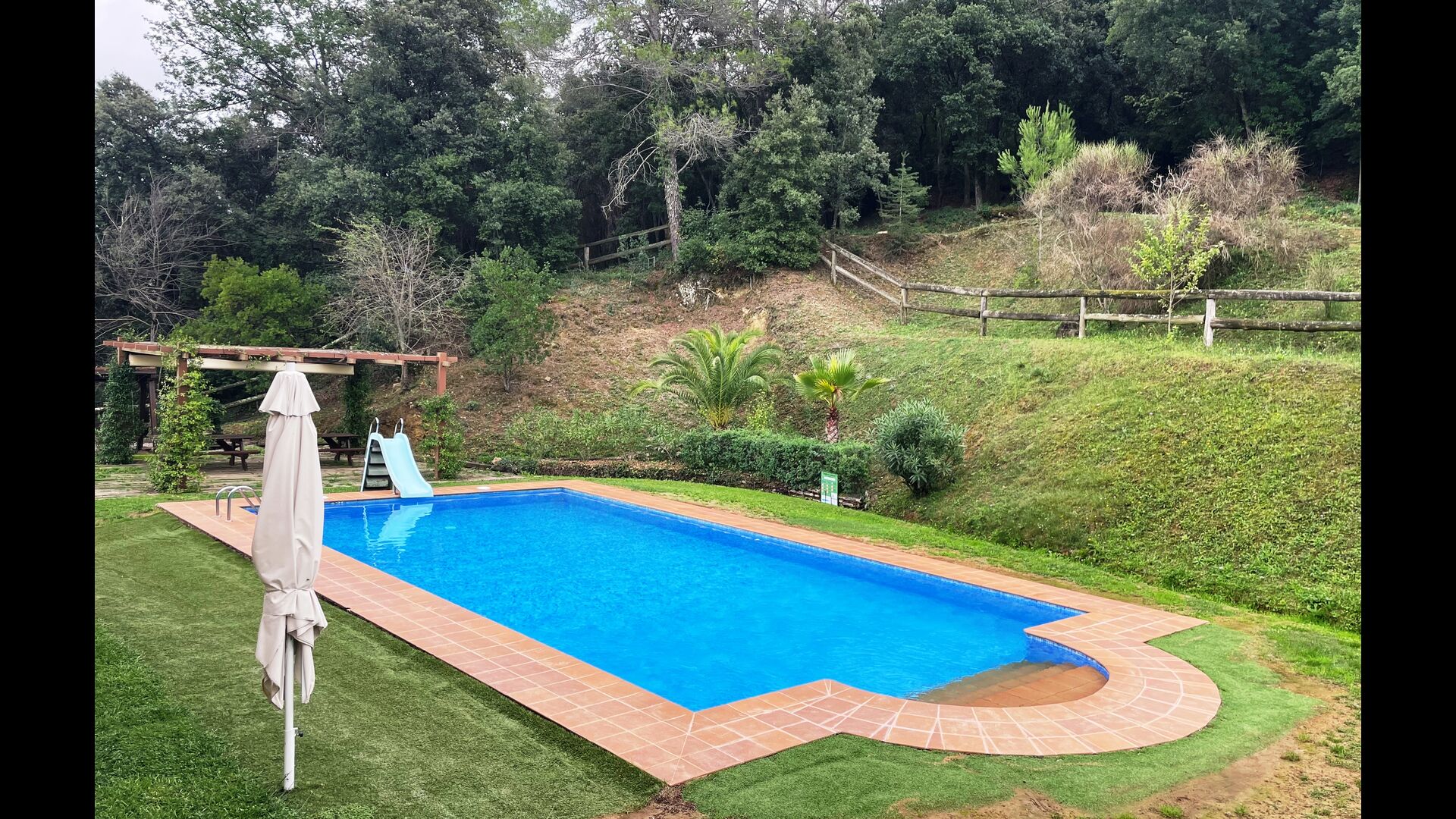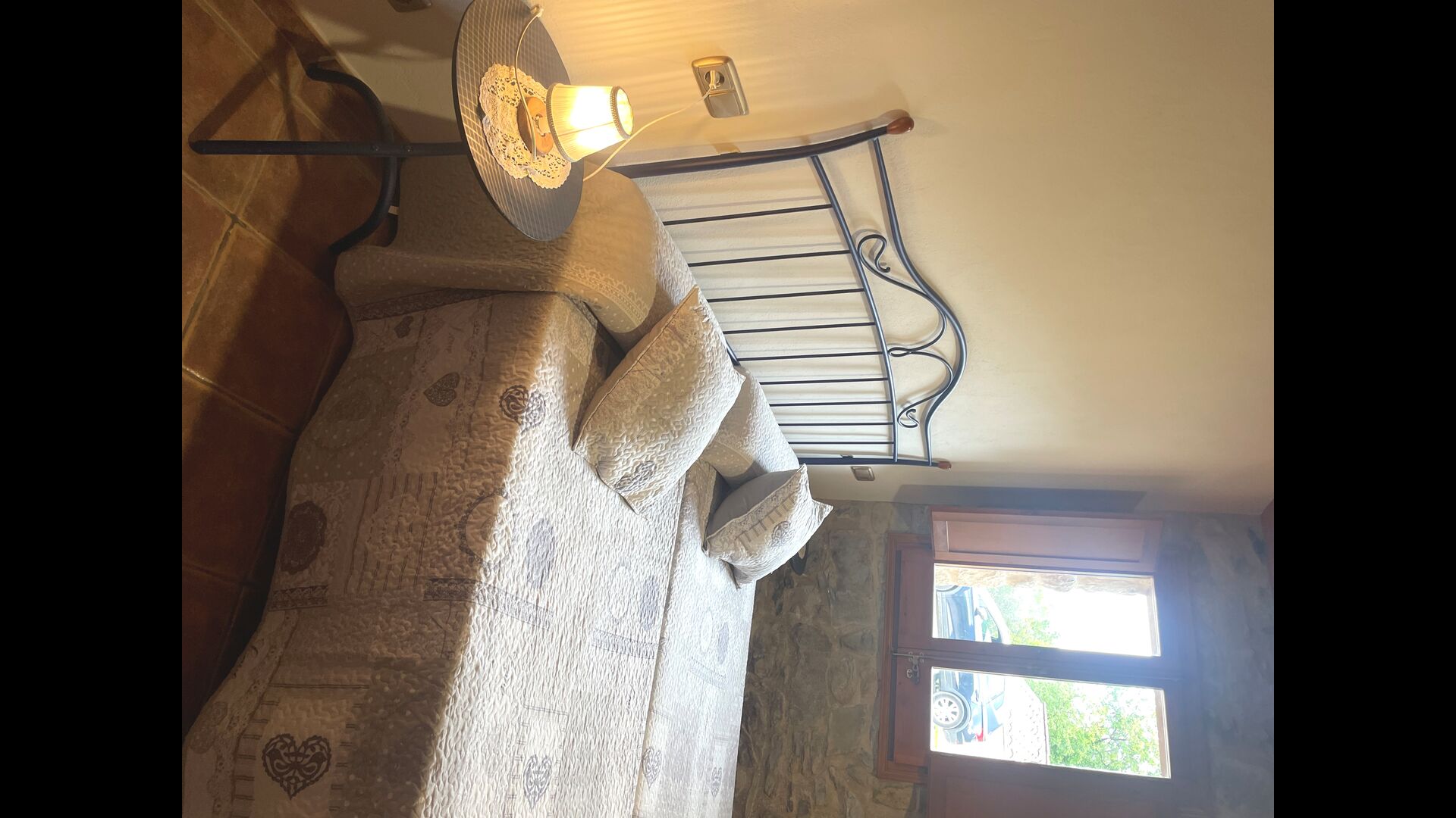 Are you looking for a completely secluded place but still not too far from a nice town with restaurants, Masia Sol de Marlant might be the place. Staying on a mountain of course requires arriving by a mountain road, but the road is fine and only the last part without pavement, so you can arrive without problems. The reward is stunning! What a natural place surrounded by nature and with views to the valley below. The energy source is sun cells, adding to the natural and sustainable feeling.