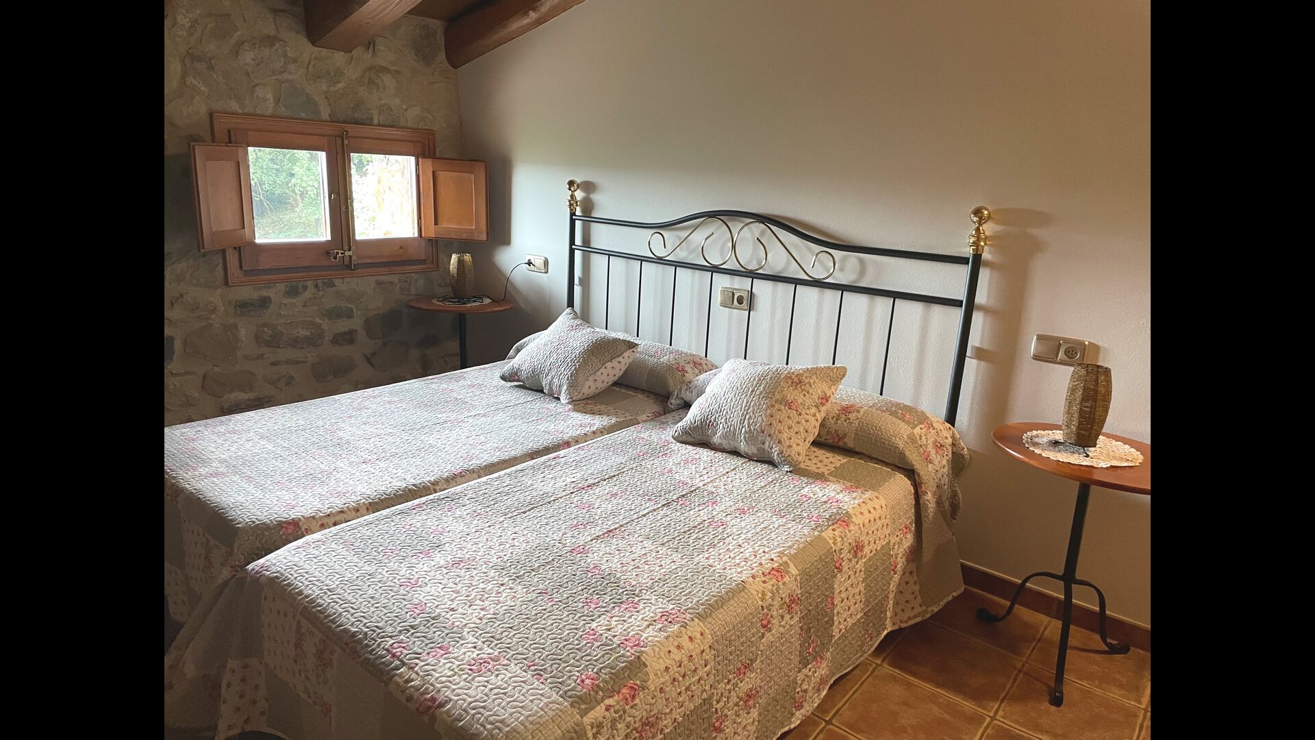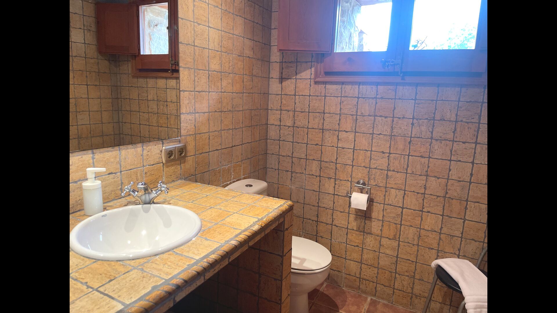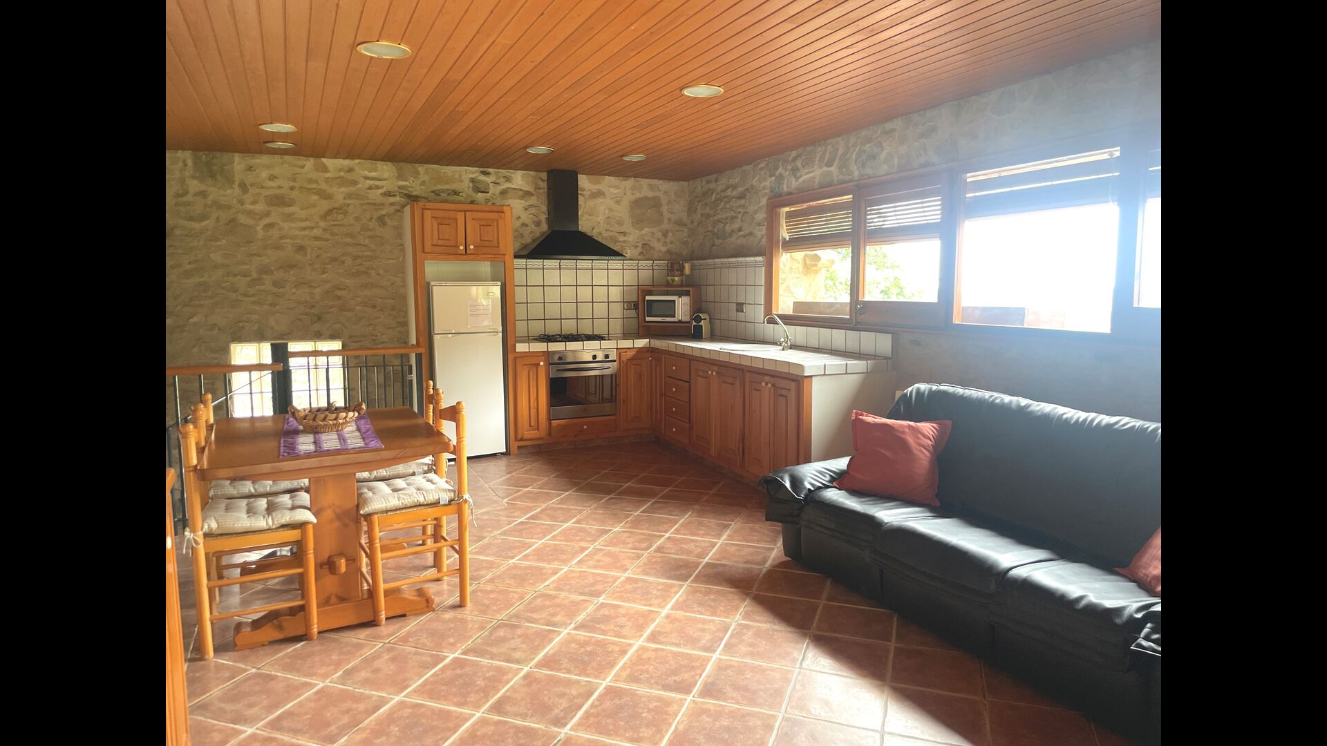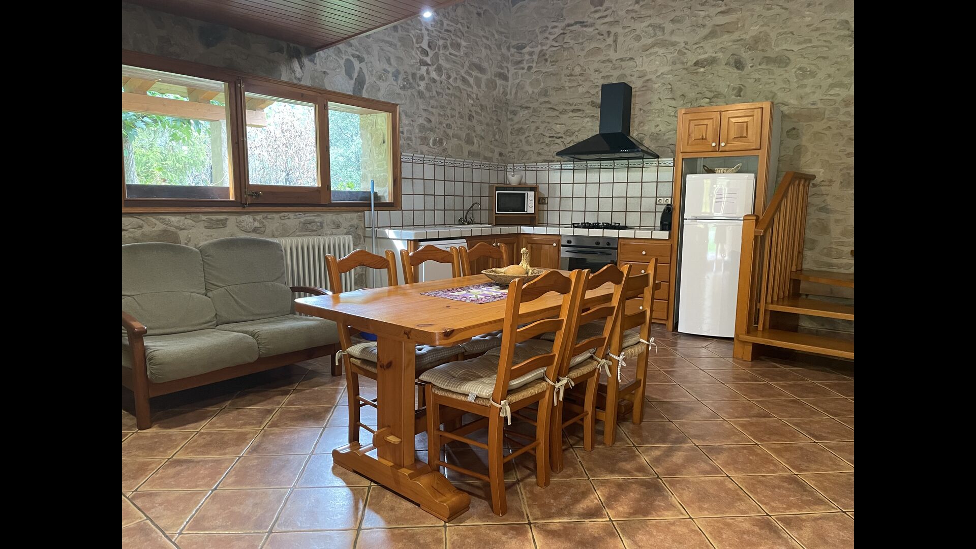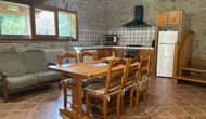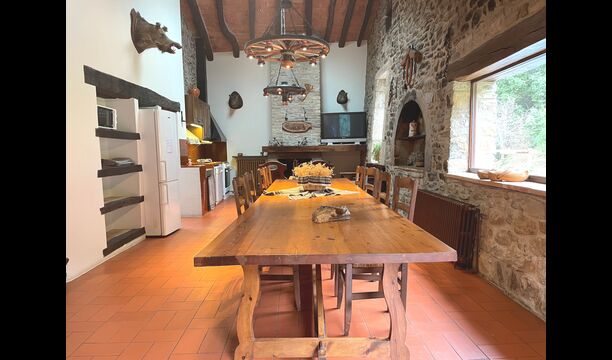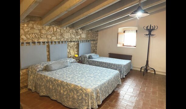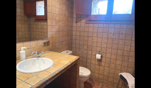 The Soler II apartment is connected with the Soler I as well as with the game room, and it also has an exit directly to the garden. Here you find two big bedrooms, each with 2 double beds, and then a double room with double bed. These three bedrooms share 2 bathrooms. Also, there is a nice rustic common room with dining area, kitchen and sitting area.