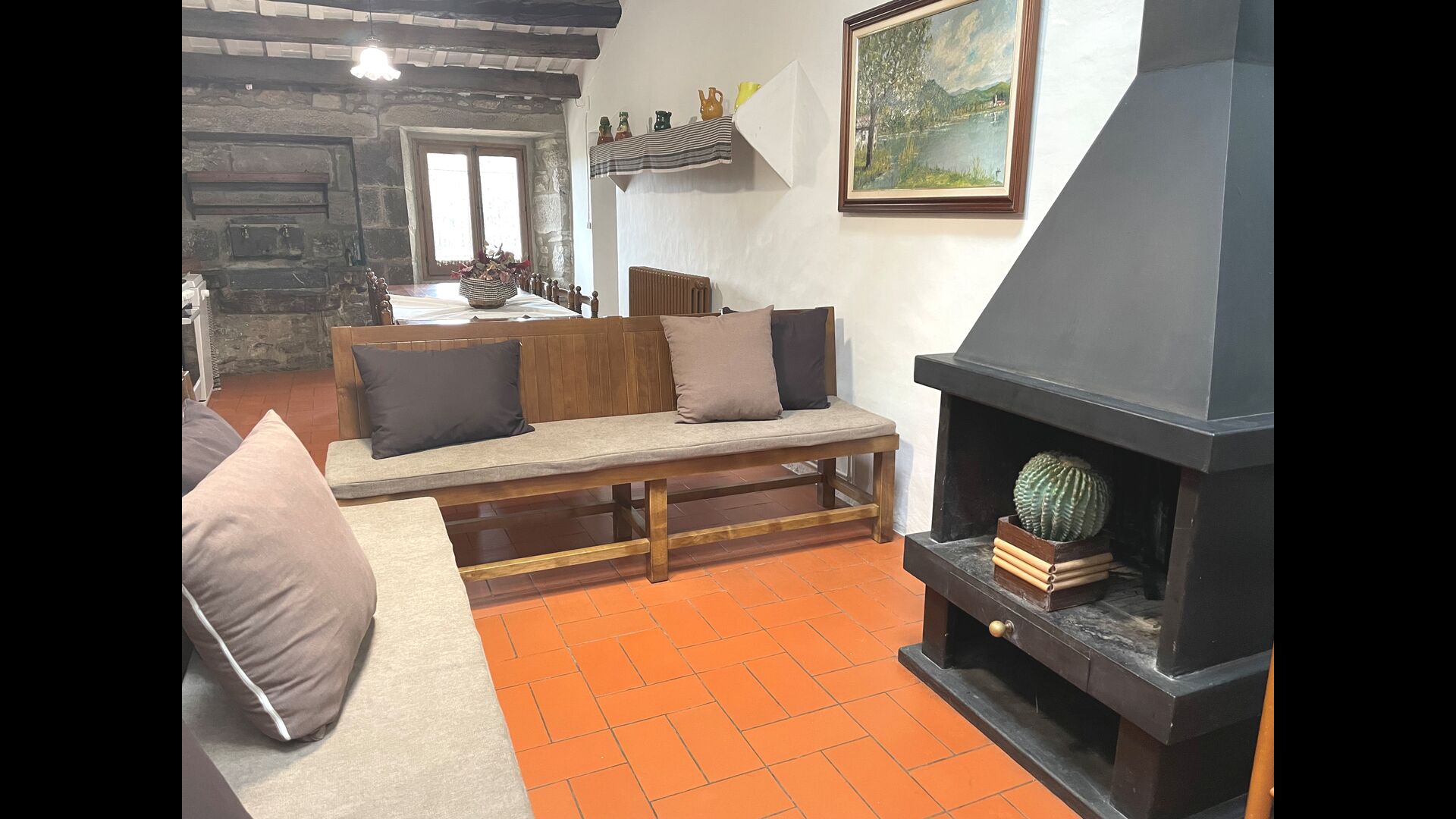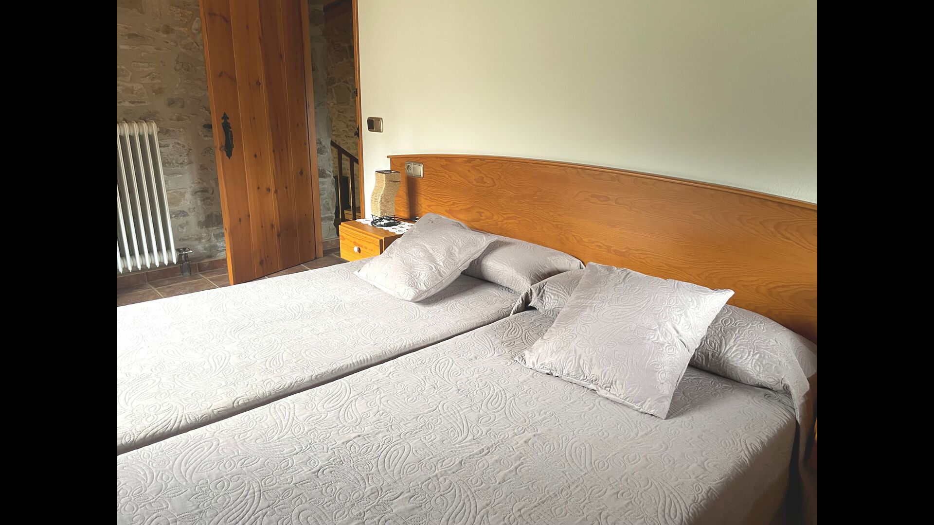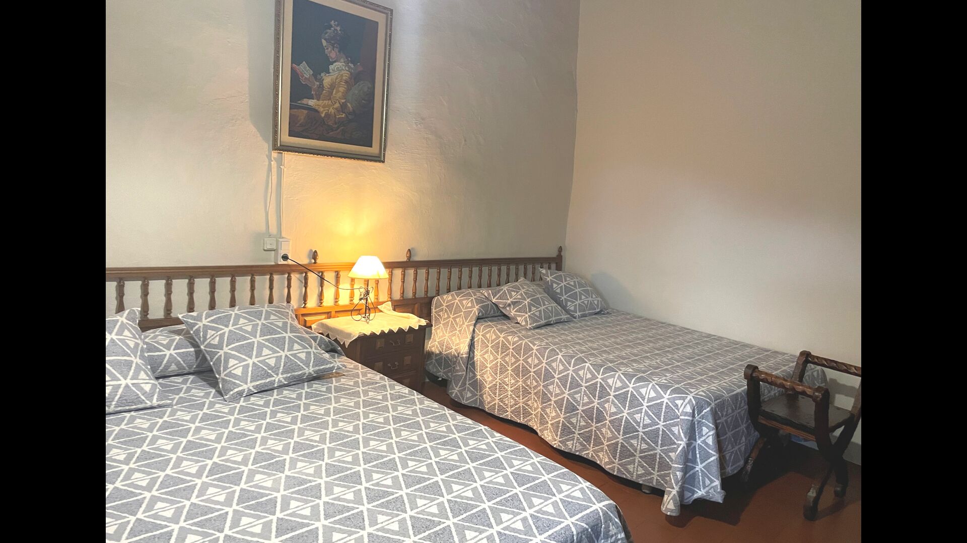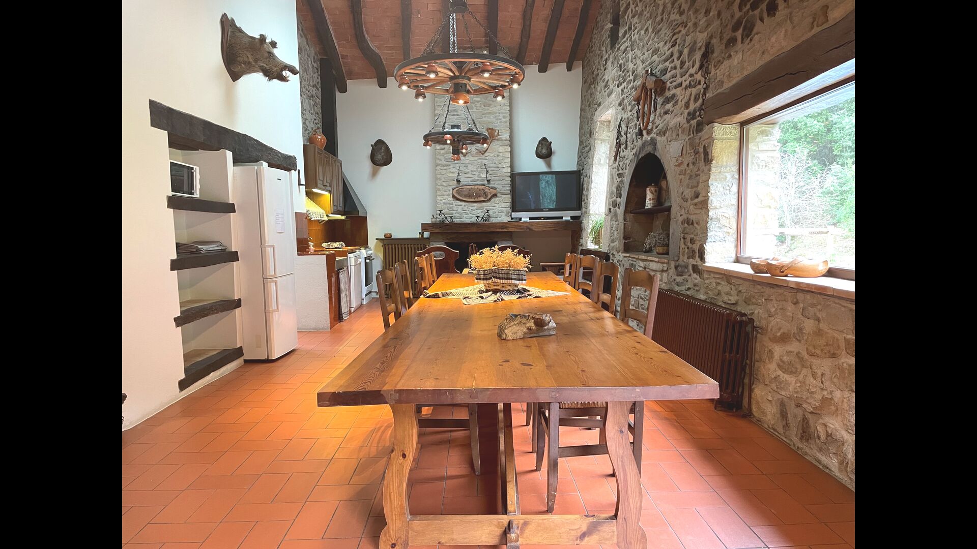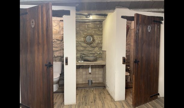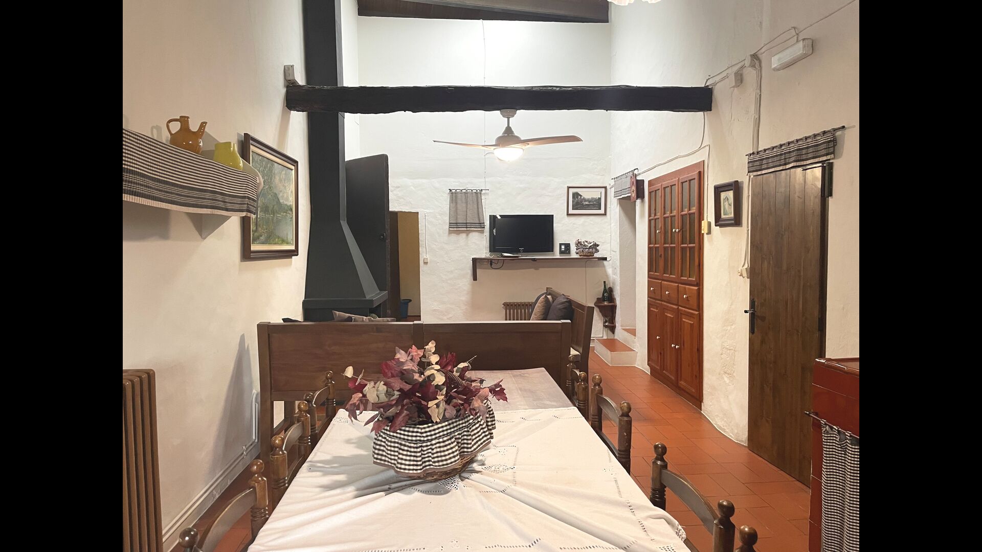 The Soler II apartment is connected with the Soler I as well as with the game room, and it also has an exit directly to the garden. Here you find two big bedrooms, each with 2 double beds, and then a double room with double bed. These three bedrooms share 2 bathrooms. Also, there is a nice rustic common room with dining area, kitchen and sitting area.