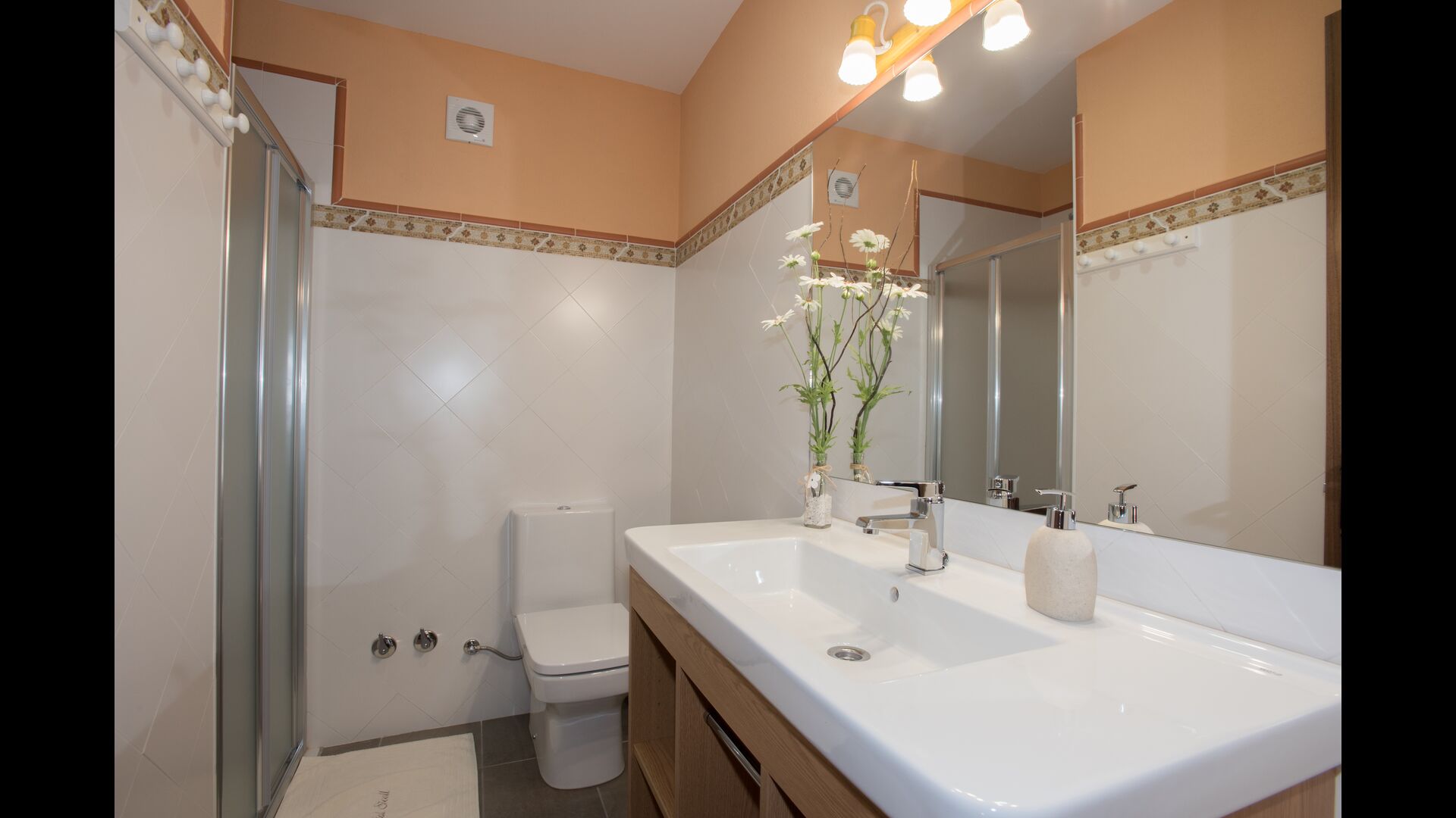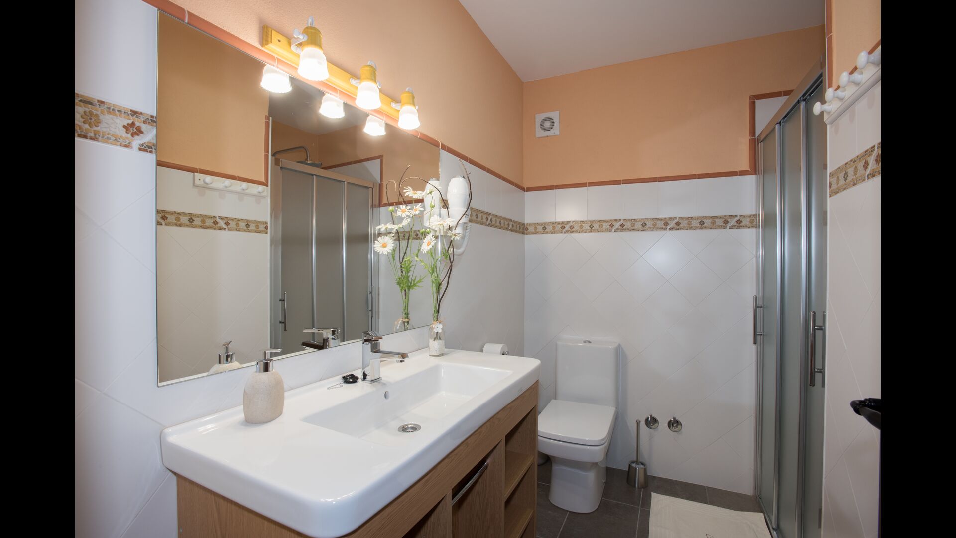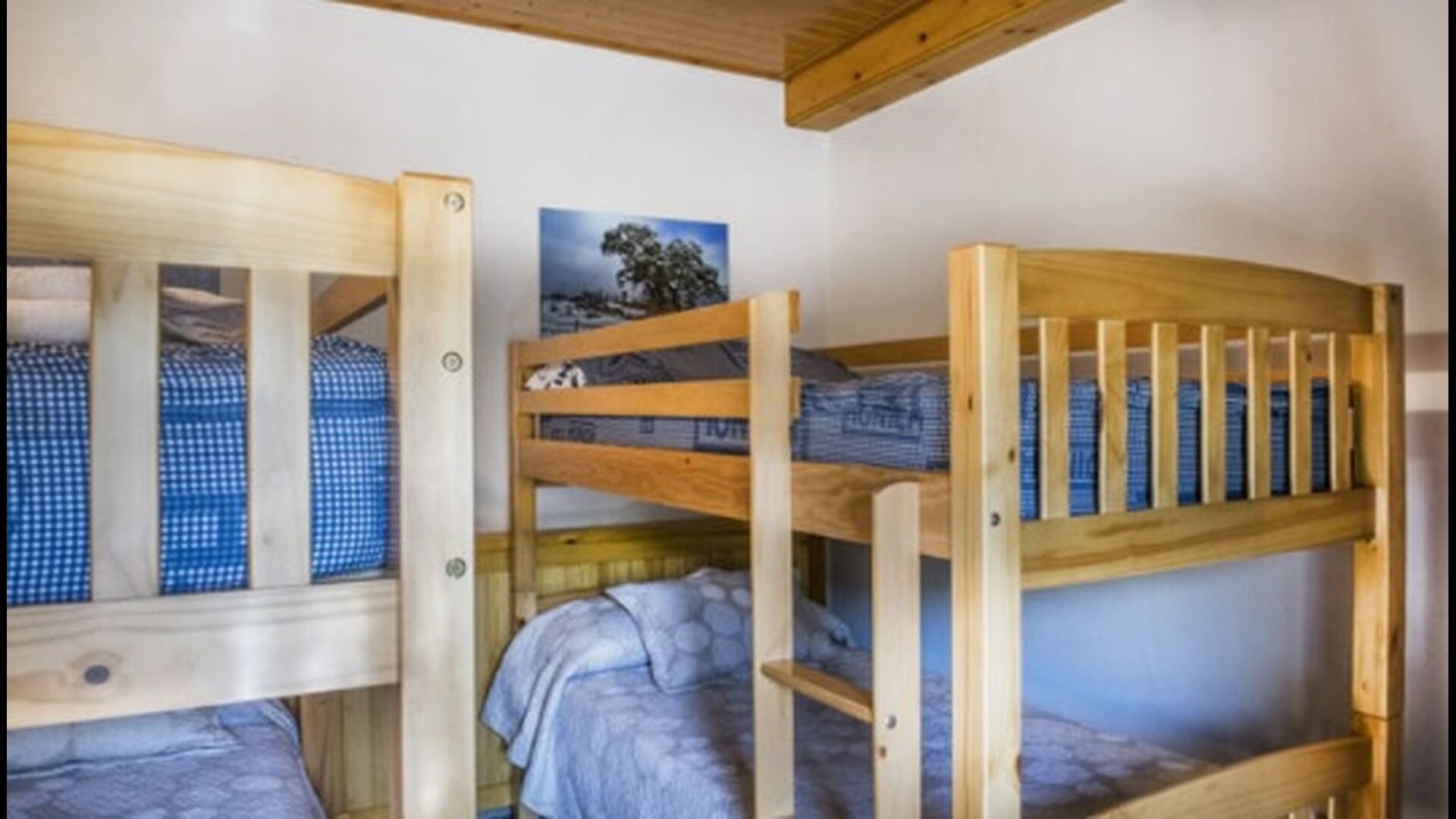 Upstairs, you find the additional 4 bedrooms, which are equipped to be able to host 3 families as there are 2 triple rooms and 1 double room and finally, the fourth bedroom has been converted into a children’s room with two bunk beds. There are two bathrooms on this floor also, making it three in total. As one tend to be a bit hot, there is air conditioning in that room.