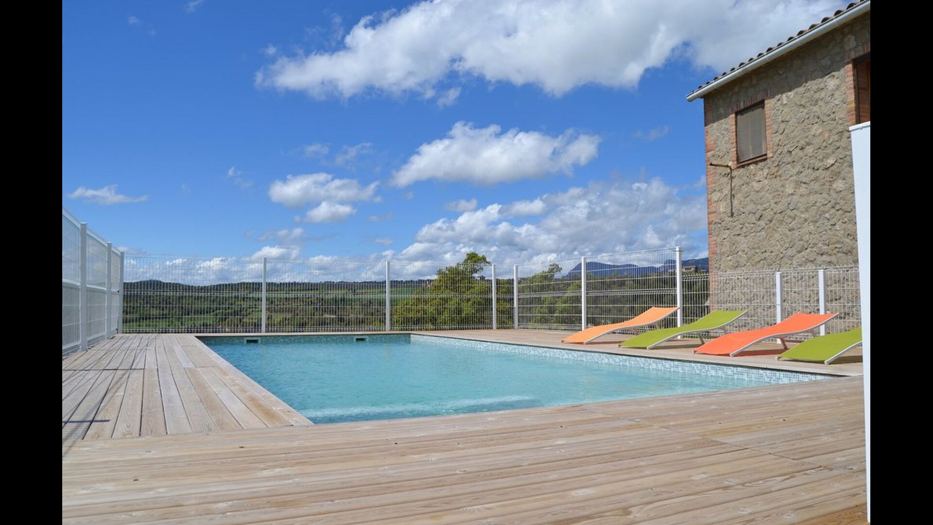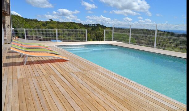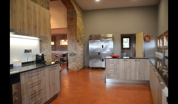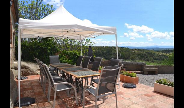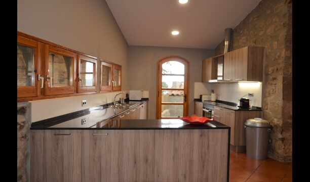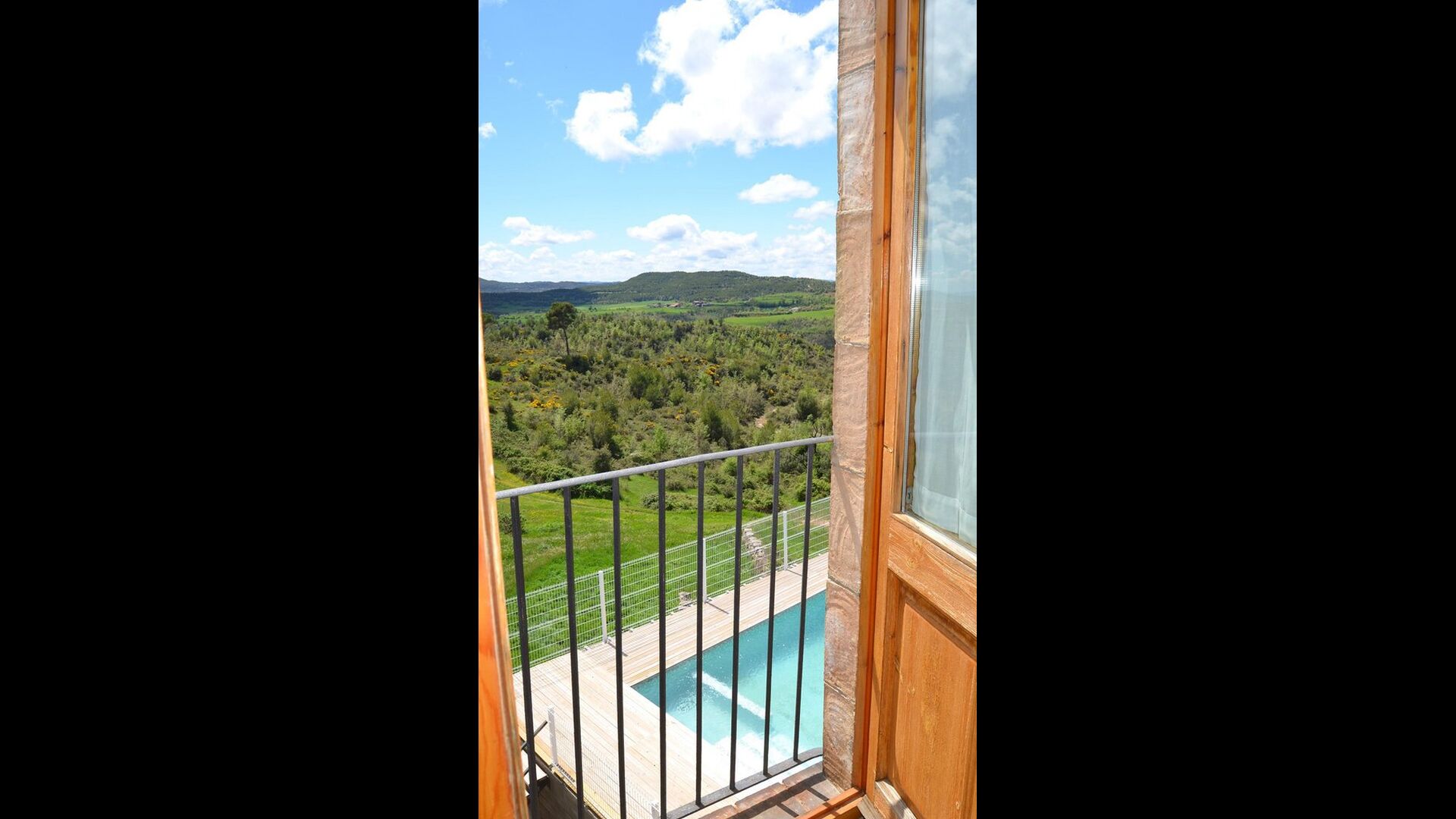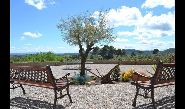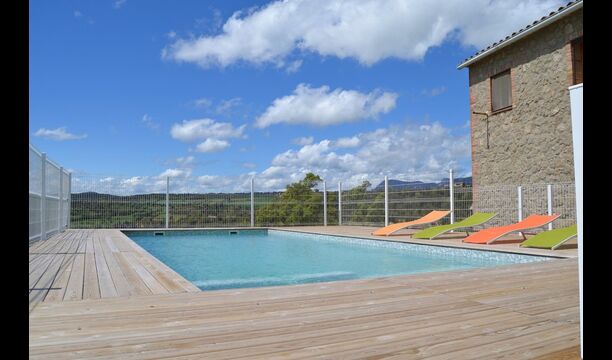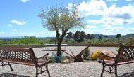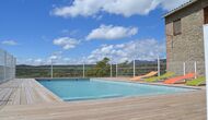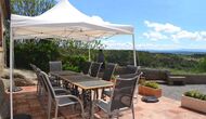 Outside this hall, there is a very nice terrace with parasols, where you can eat in open air and enjoy the sunset over the valley with a cup of coffee or a glass of wine or cava. There is also direct access to the very nice pool area with swimming pool and sun loungers and the same excellent view. The swimming pool is fenced for the protection of small children.