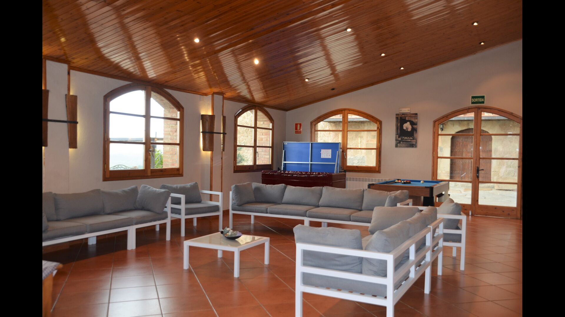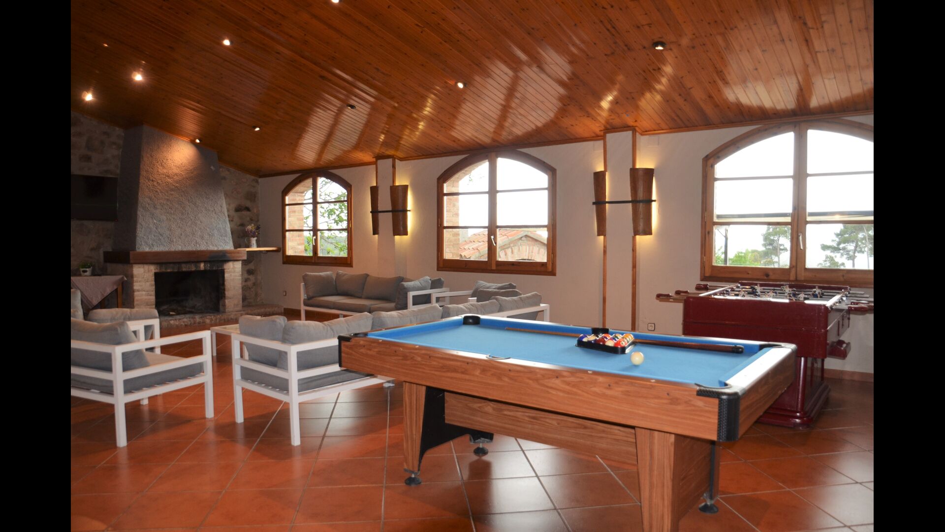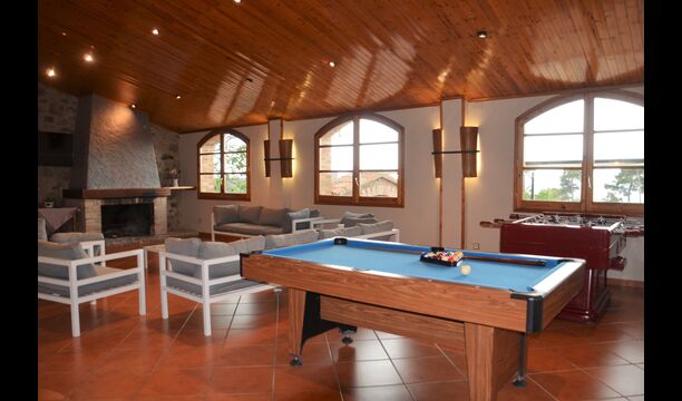The big quality of the house is the very big hall next to the house, where you have sofas, fireplace and a TV, a big dining area and an extra fridge. Furthermore billiards and a table tennis and – very convenient - two bathrooms