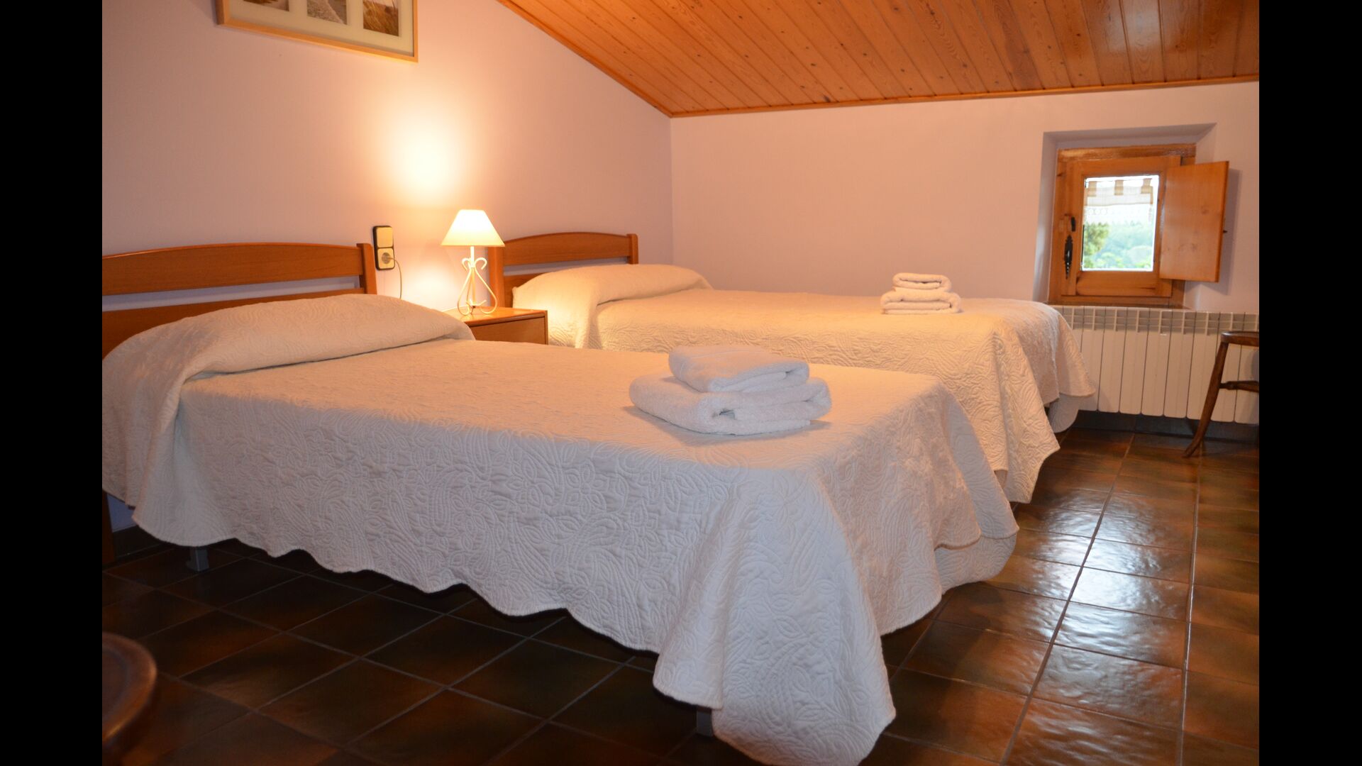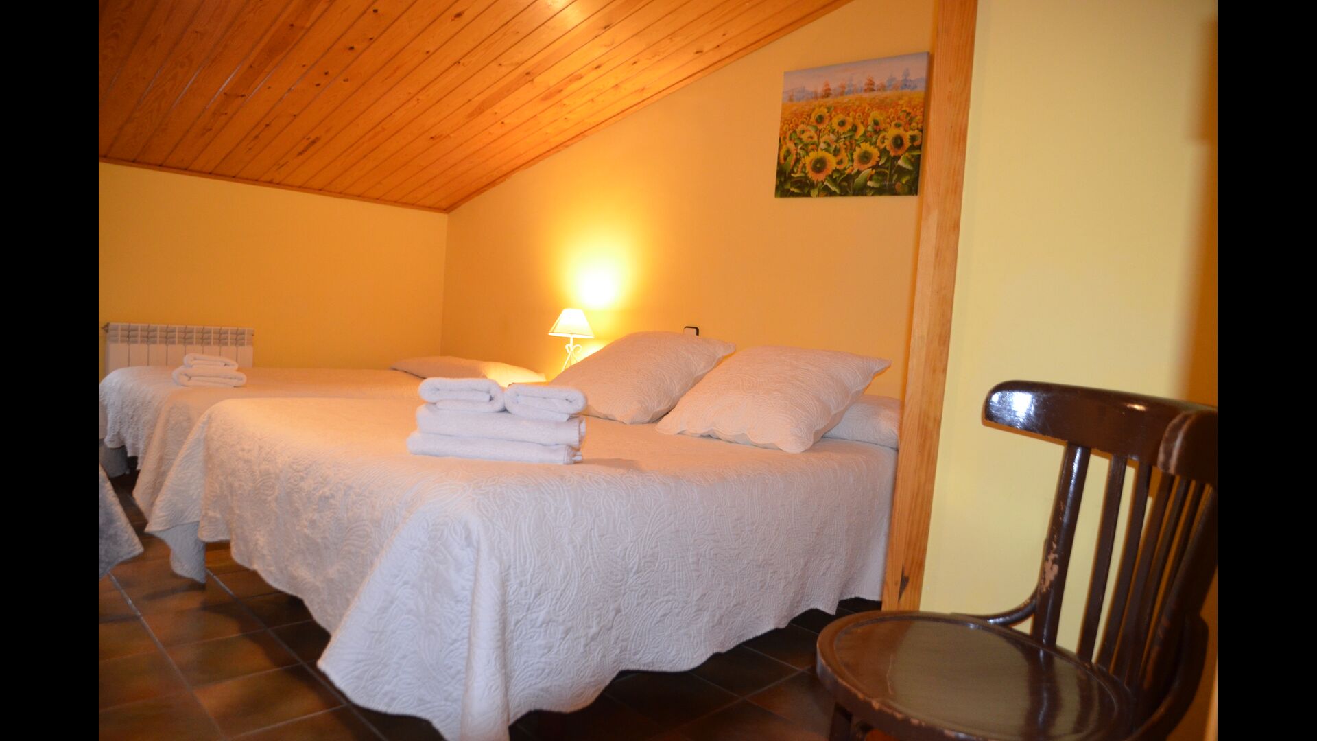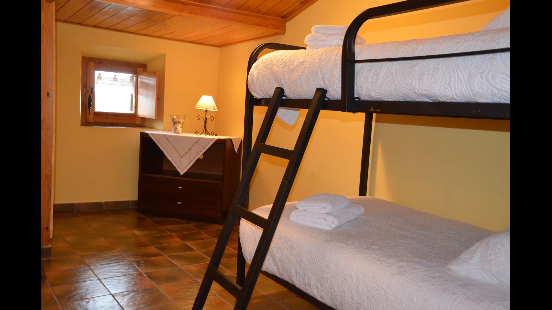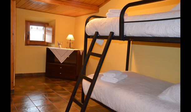 On the first floor, which can also be entered directly from the parking area because of the difference in levels, there is a big common room with dining area and a big industrial kitchen. These facilities are mostly used in the off-season. Also, there is a big double room with bathroom and if necessary room for an extra bed.