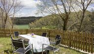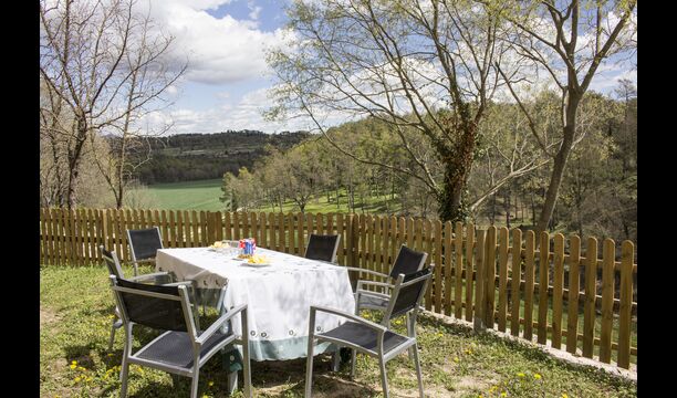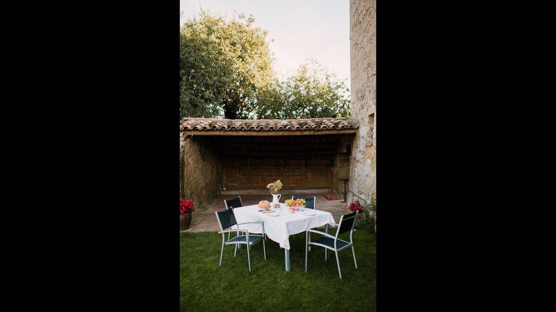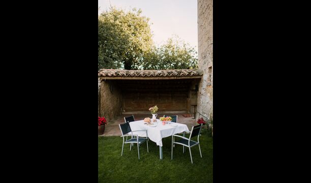 Around the corner, there is a covered terrace with a big table for dining and a barbecue. On the other side of the house, you find the swimming pool and a garden with lawn. There is a direct door from the house to the garden, so you will not have to walk around the house. From the beach chairs you have an excellent view over the fields and with the Pyrenees in the background. The entrance to the pool area is closed by a gate to protect small children.
