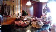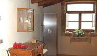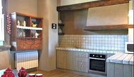 If you walk the stairs to the first floor, you are met by the other four double bedrooms. These are placed on each side of the open kitchen with dining table. The kitchen has among others a fridge, a freezer, a dishwasher, a microwave, and even a flat screen TV at the dining table. There are also small Catalan things in the kitchen as tea sets and jugs.