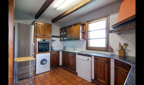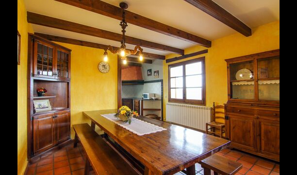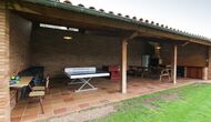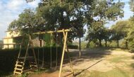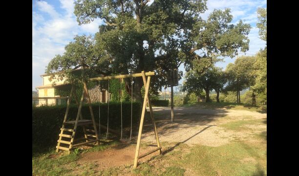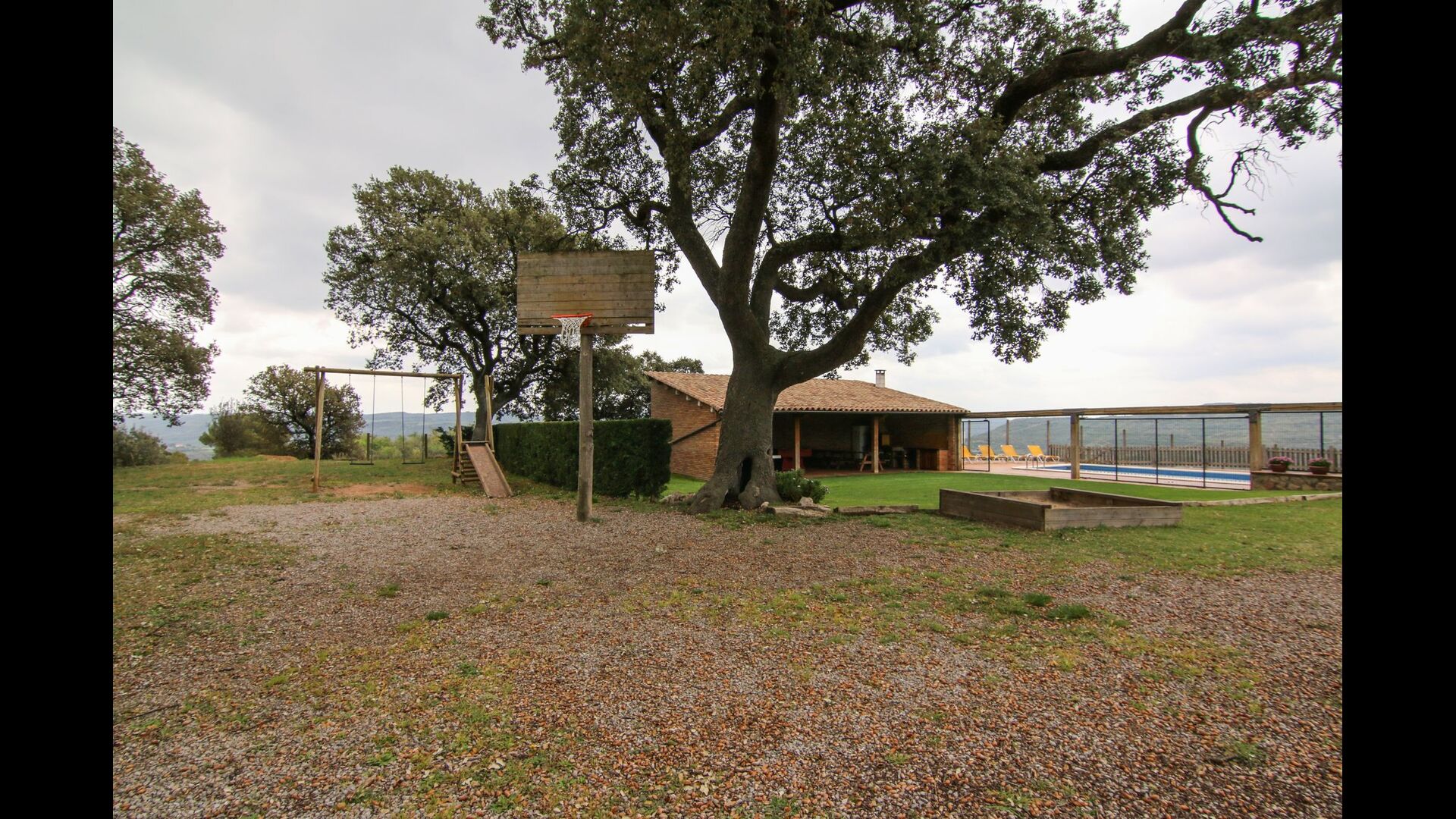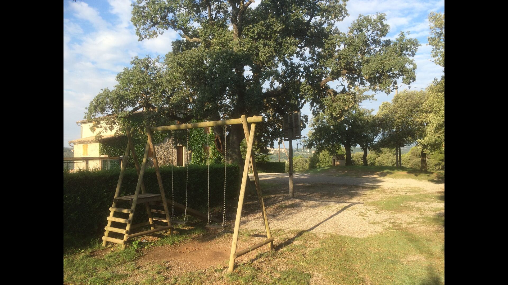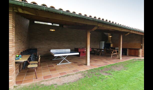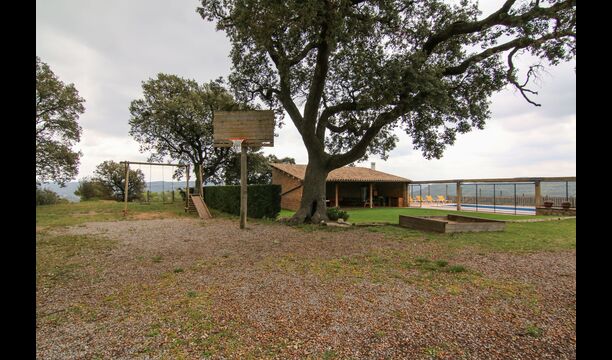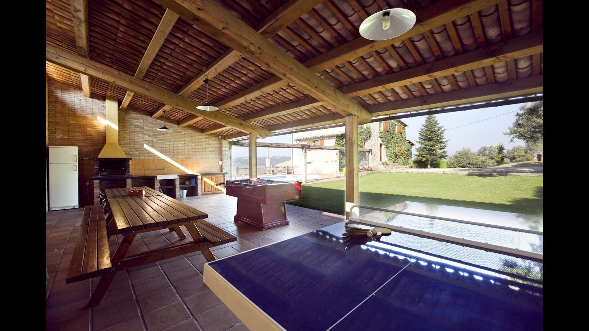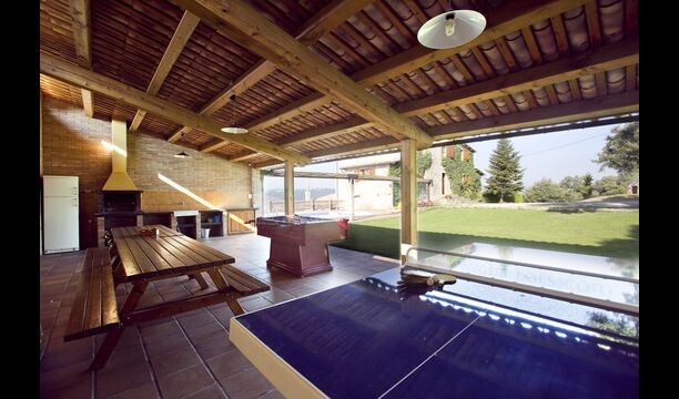The outdoor areas are very fine, as there is a large swimming pool with sun loungers and a covered terrace with outdoor kitchen right next to. The pool can especially be enjoyed in the daytime, when the Catalan heat can be supplemented with a dive in the refreshing water. It is also fenced, which is a very nice when you have young children on holiday. The covered terrace has a sink, BBQ grills, firewood and tools - Here you can cook homemade food. It can then be enjoyed at the very long and beautiful wooden table next to. There are plenty of facilities in the garden: Swings, a basketball, table tennis, table football and plenty of space. Moreover, the old and large oak trees that grow around give many shady corners where you really can relax.