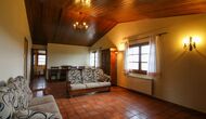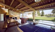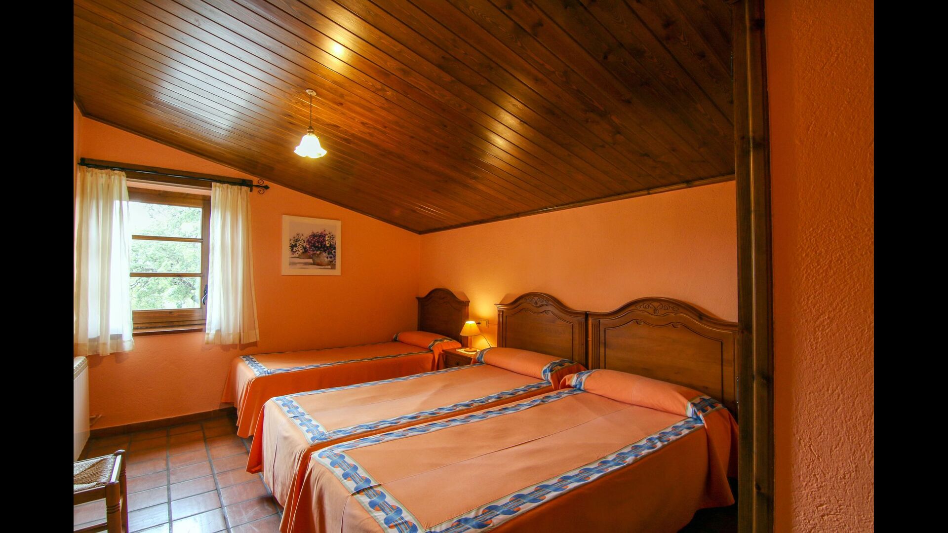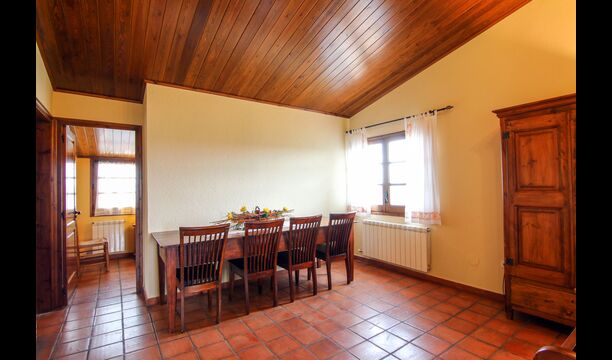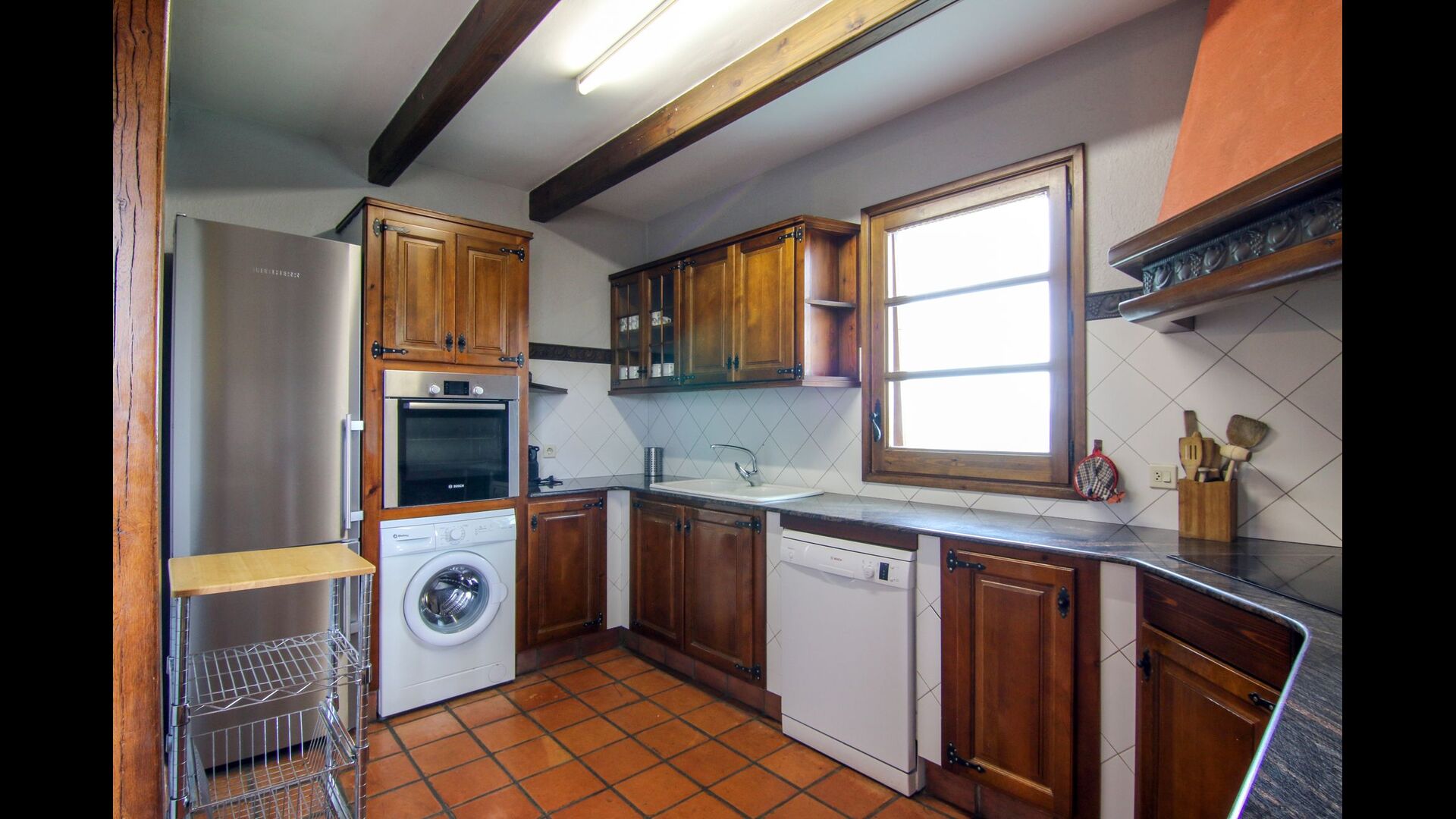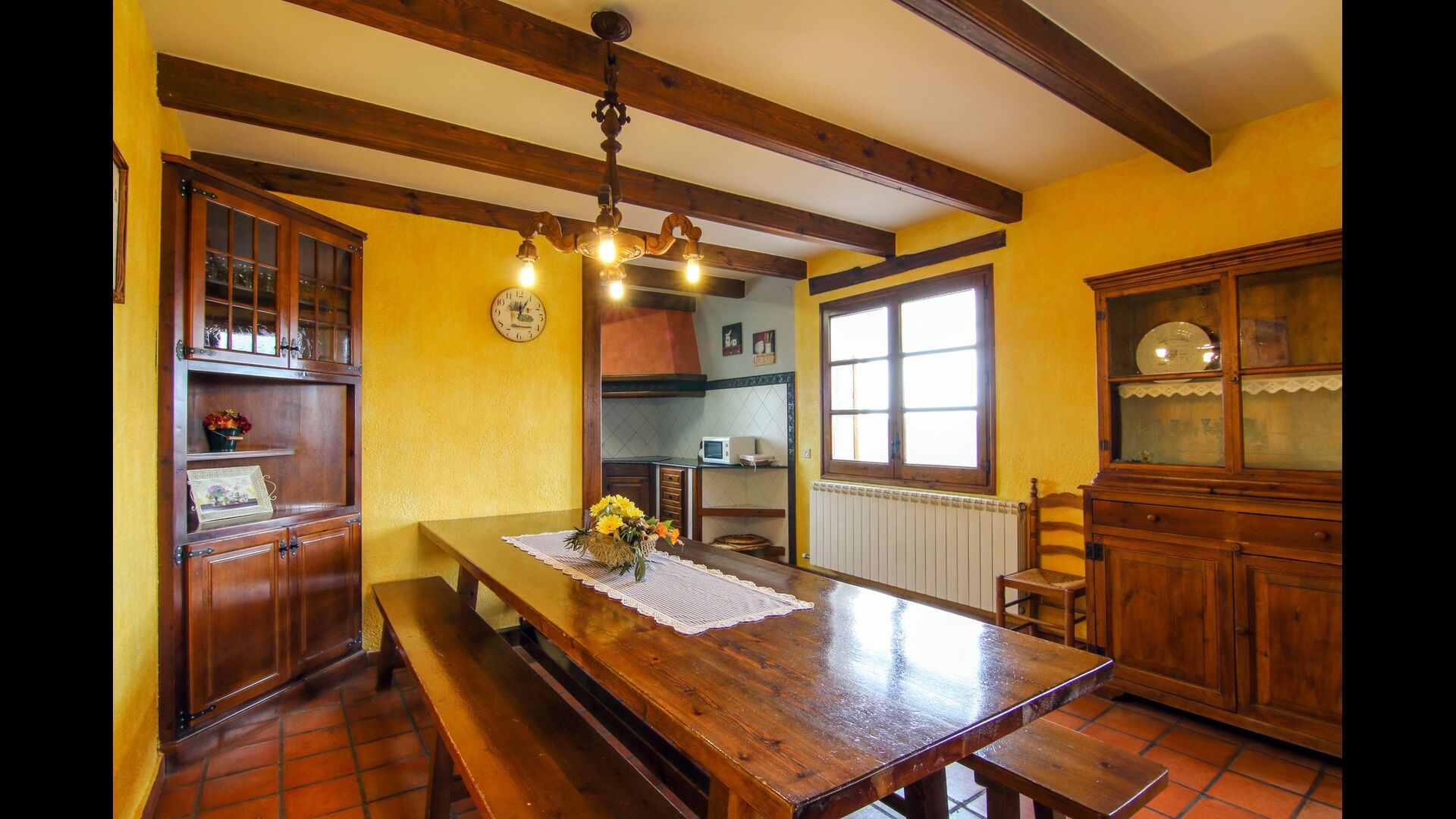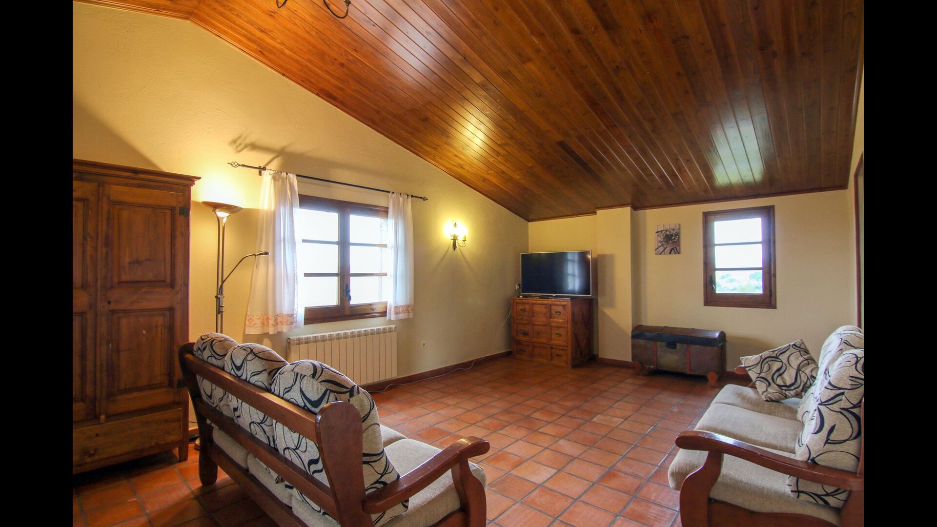 The outdoor areas are very fine, as there is a large swimming pool with sun loungers and a covered terrace with outdoor kitchen right next to. The pool can especially be enjoyed in the daytime, when the Catalan heat can be supplemented with a dive in the refreshing water. It is also fenced, which is a very nice when you have young children on holiday. The covered terrace has a sink, BBQ grills, firewood and tools - Here you can cook homemade food. It can then be enjoyed at the very long and beautiful wooden table next to. There are plenty of facilities in the garden: Swings, a basketball, table tennis, table football and plenty of space. Moreover, the old and large oak trees that grow around give many shady corners where you really can relax.