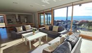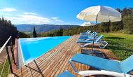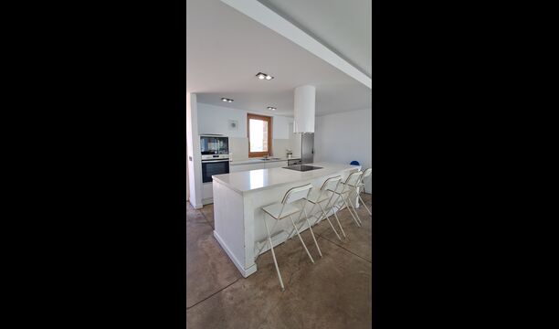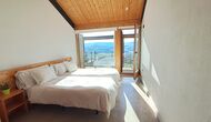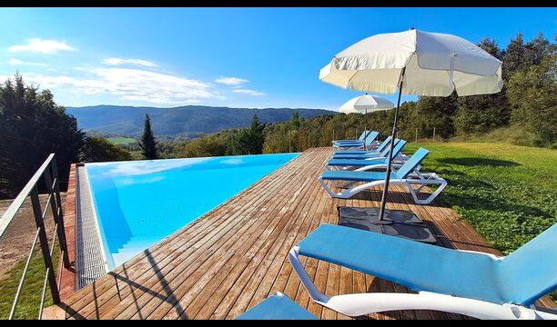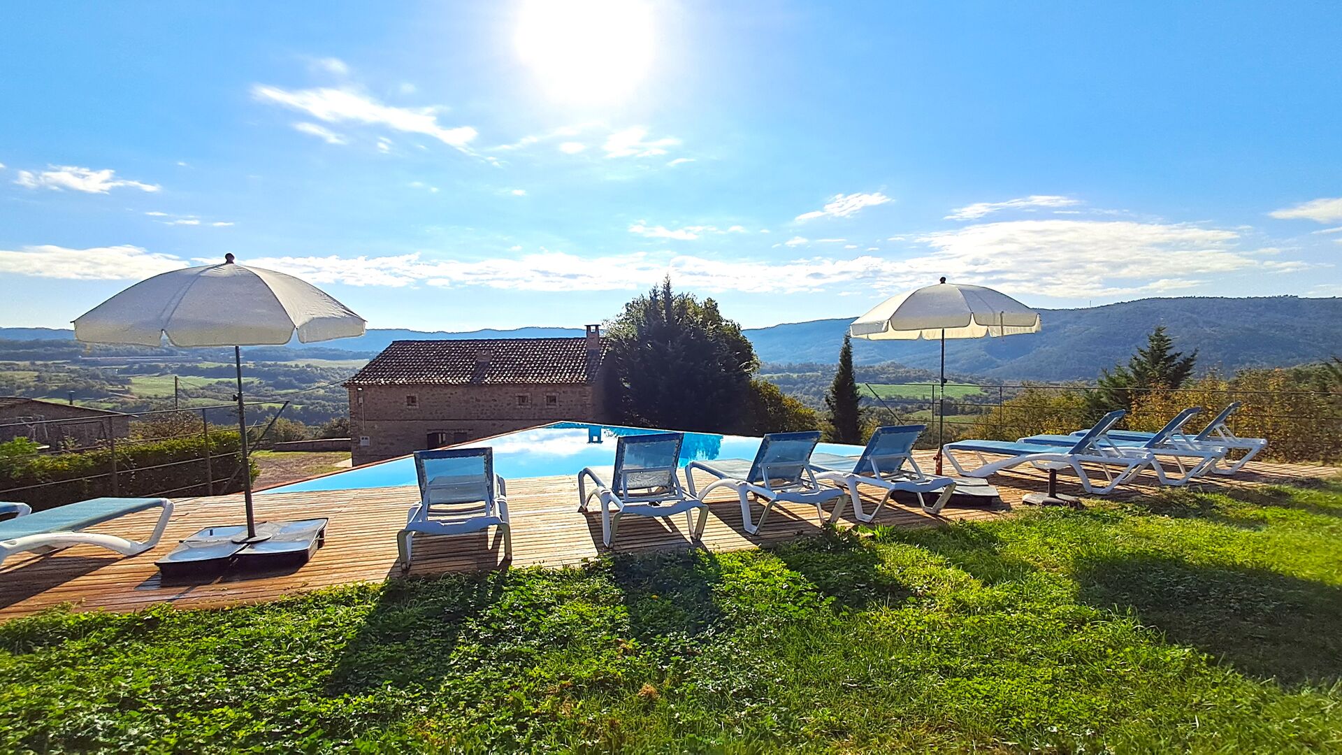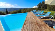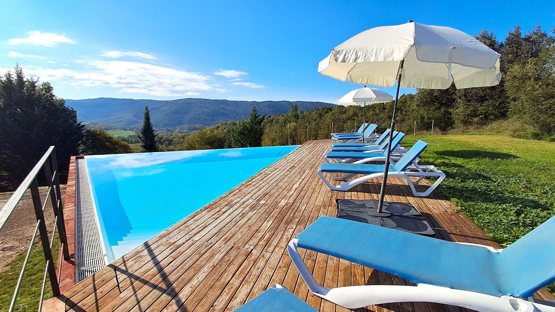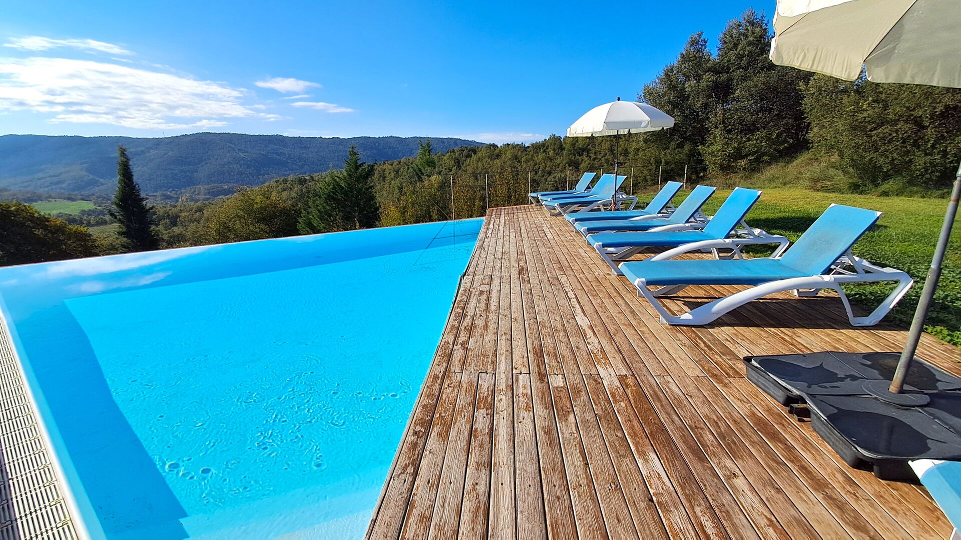 The second floor also has a large terrace, where all 4 bedrooms on the floor floor have direct access to. The house swimming pool area is something else. It must be the very best, to enjoy a holiday around the pool with friends or family in such unique surroundings. The pool is triangular and a mechanism allows the wate rto constantly moving down over the edges. The pool's edges will be fenced with a discreet fence. By the pool you will find loungers for everyone, as well as a little covered area and a large wooden terrace.