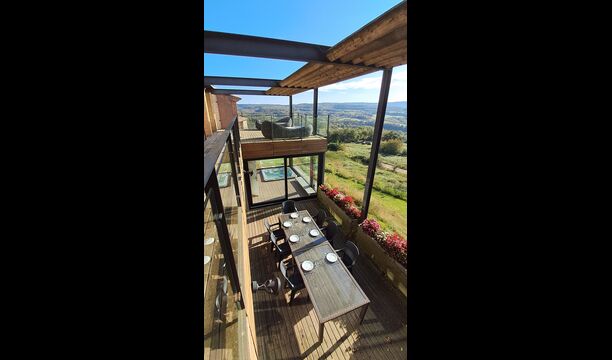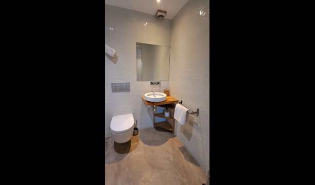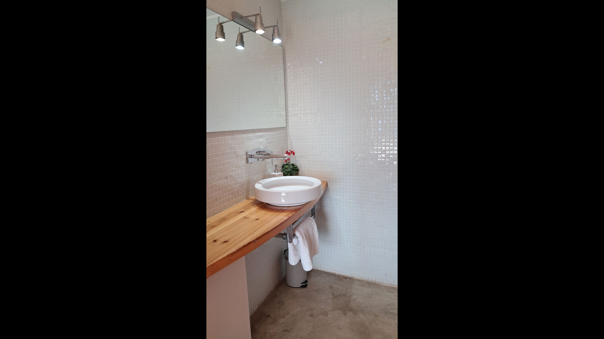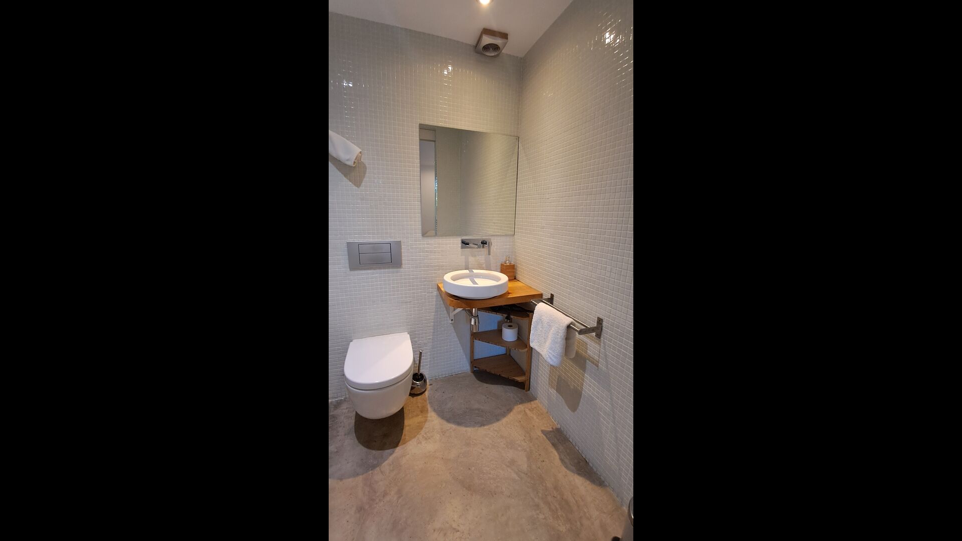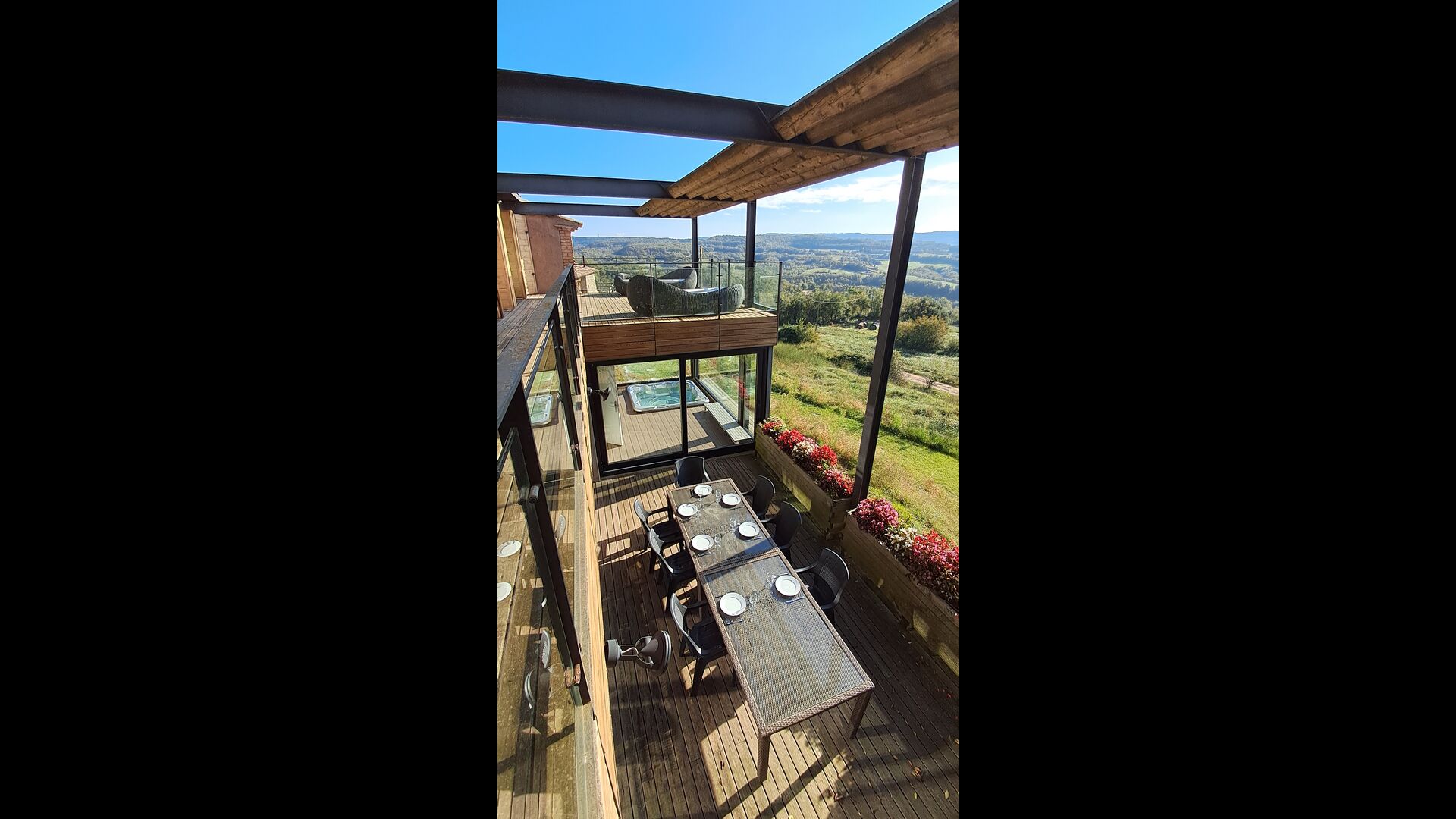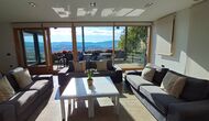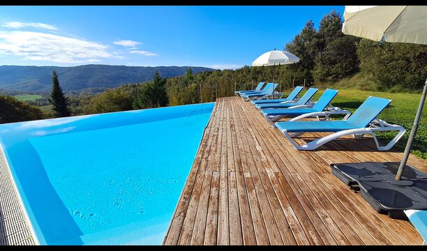 The second floor also has a large terrace, where all 4 bedrooms on the floor floor have direct access to. The house swimming pool area is something else. It must be the very best, to enjoy a holiday around the pool with friends or family in such unique surroundings. The pool is triangular and a mechanism allows the wate rto constantly moving down over the edges. The pool's edges will be fenced with a discreet fence. By the pool you will find loungers for everyone, as well as a little covered area and a large wooden terrace.