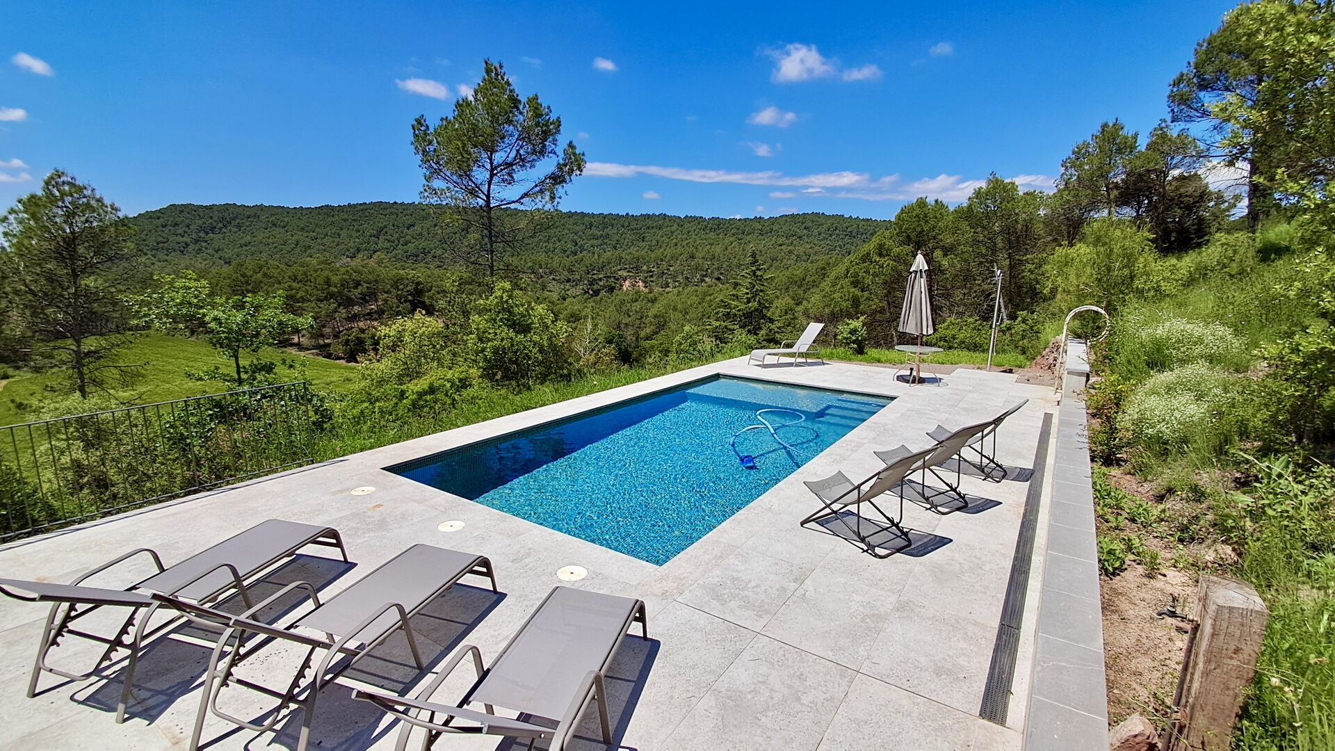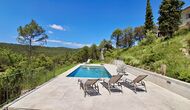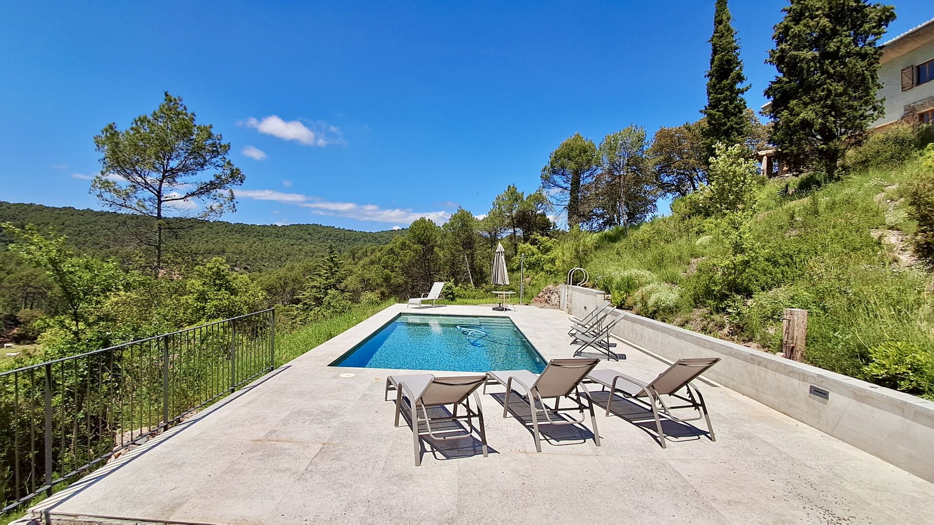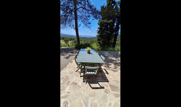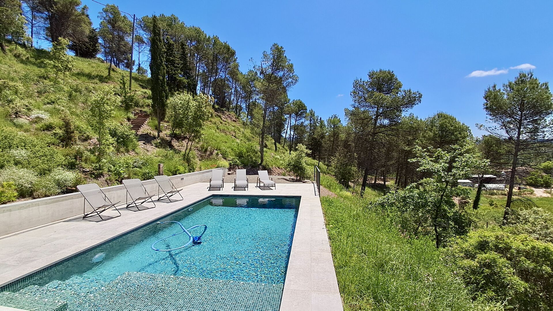 The property boasts a spacious garden with private forested areas, perfect for hikes or simply soaking up the beauty of the surroundings. The outdoor saltwater pool offers a refreshing way to cool off, while the terrace provides space to relax. Indoors, the fully equipped kitchen and cozy living spaces allow guests to enjoy meals and moments together.
