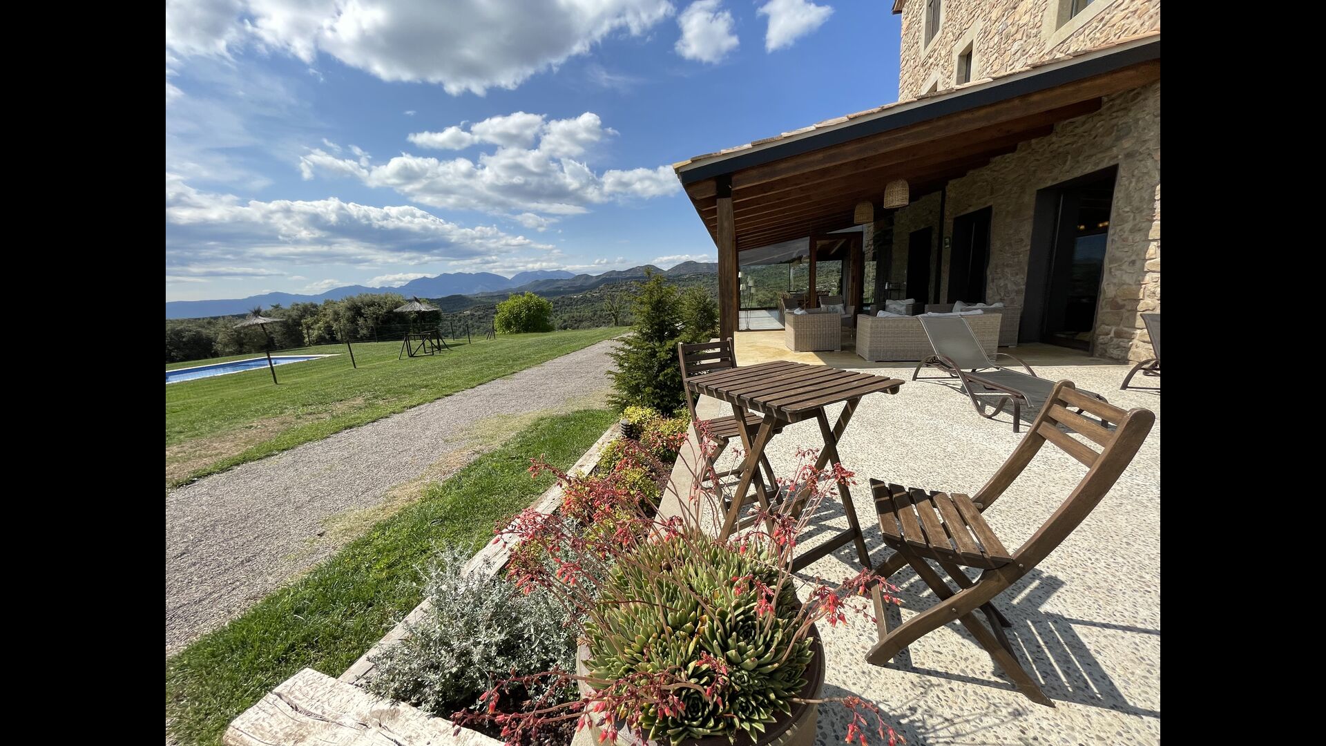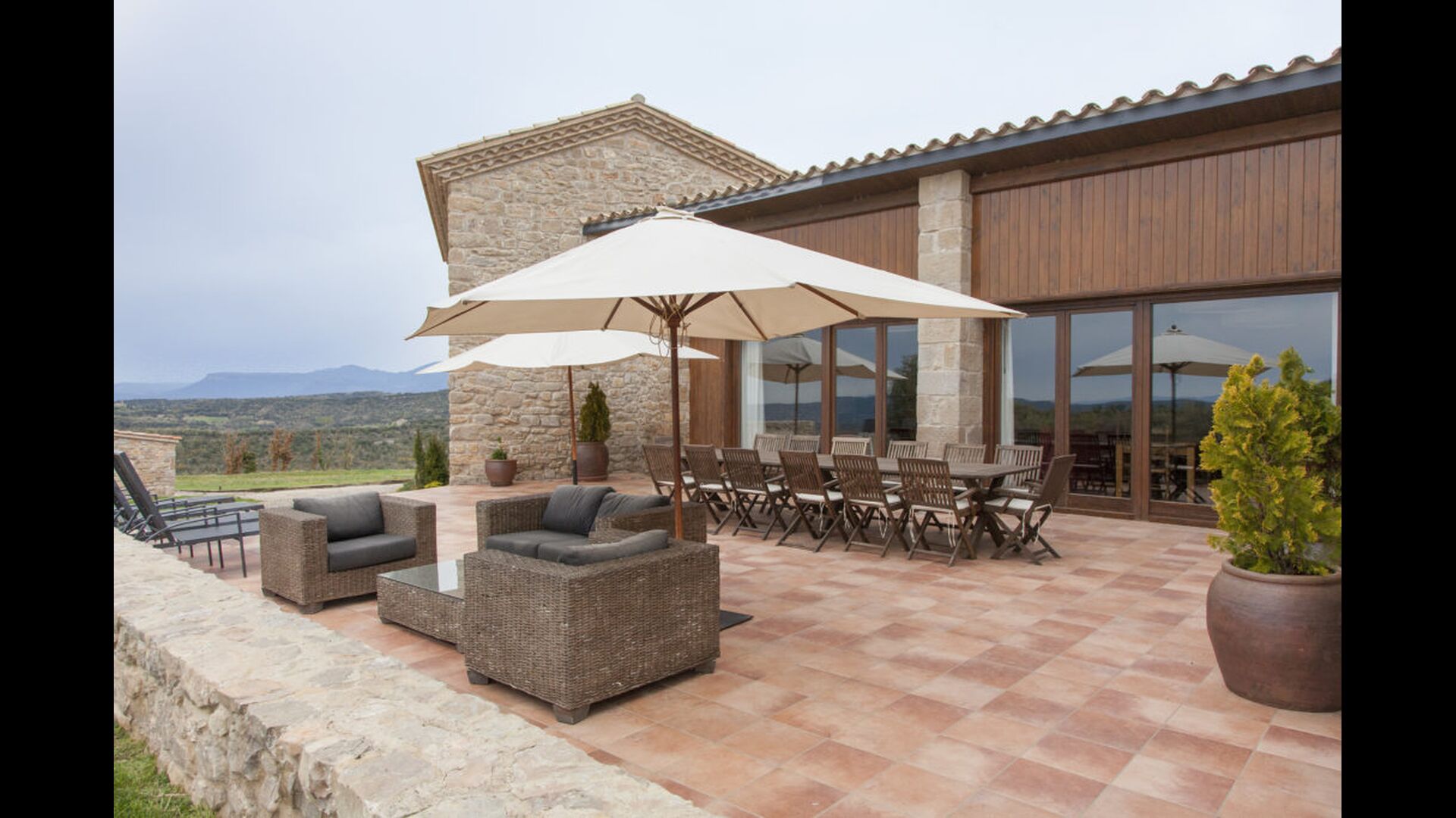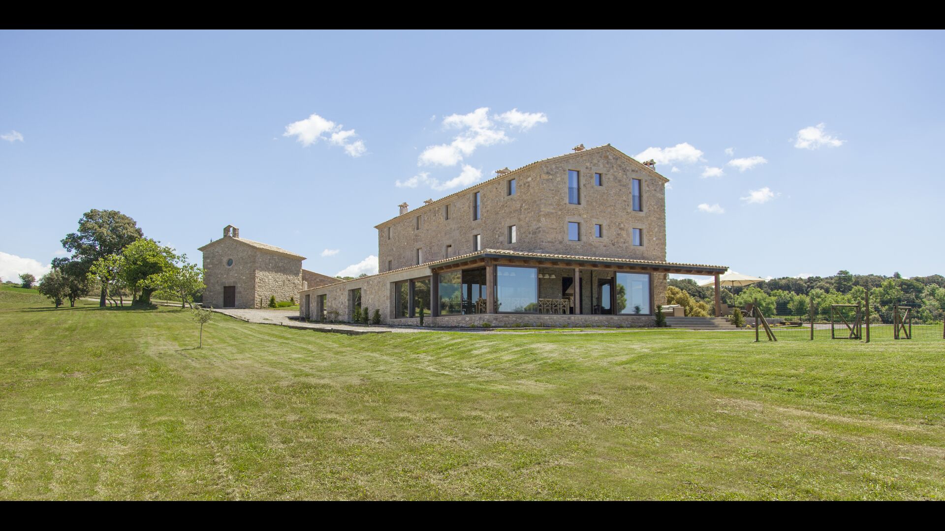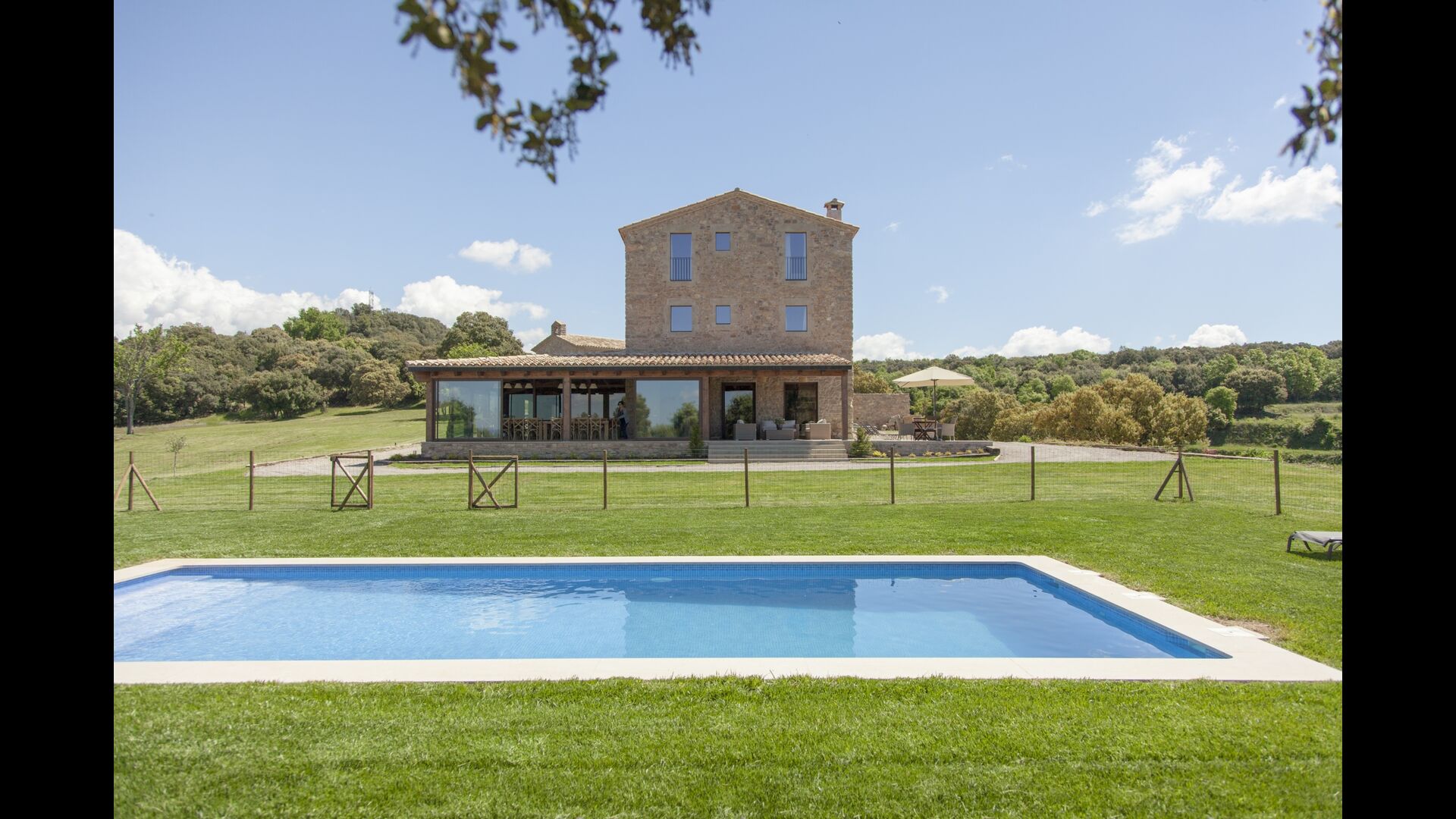 In Central Catalonia, on a hilltop, the three newly restored holiday homes, Las Casas de Mateo, has just been opened for guests, a combination of the three neighbor houses Can de Mateo, Masoveria de Mateo & La Mas de Mateo. The house has room for 46 + 7 guests in the three houses and the grand attraction is the unique location. In Las Masias de Mateo you have the opportunity to enjoy a 360 degree view of the Catalonian countryside, framed by the Pre-Pyrenees rising in the background. We represent many holiday homes in this region, all with stunning views, but Las Masias de Mateo beats almost everything in this regard.