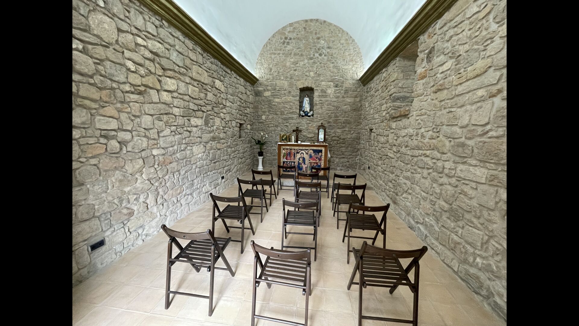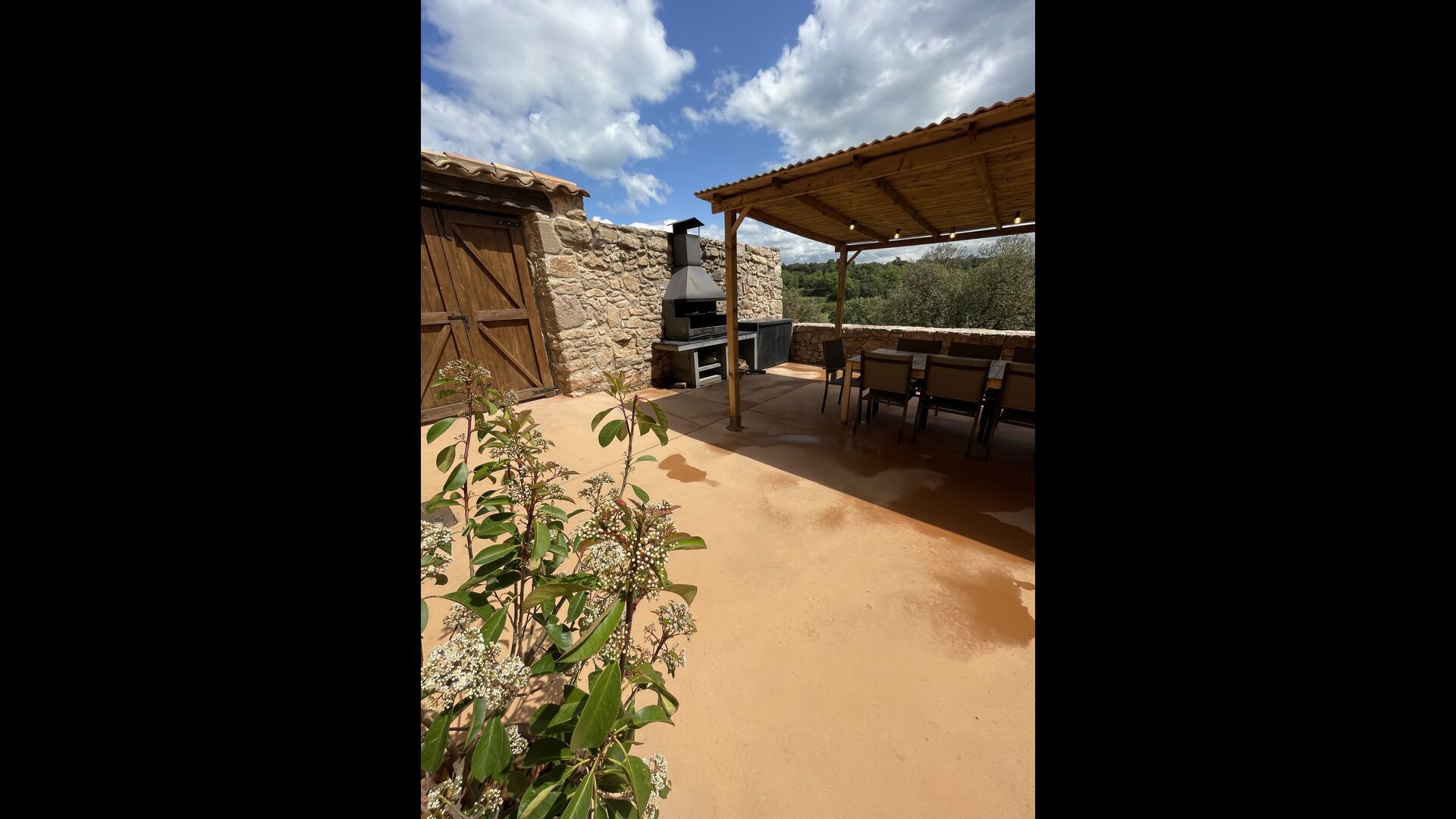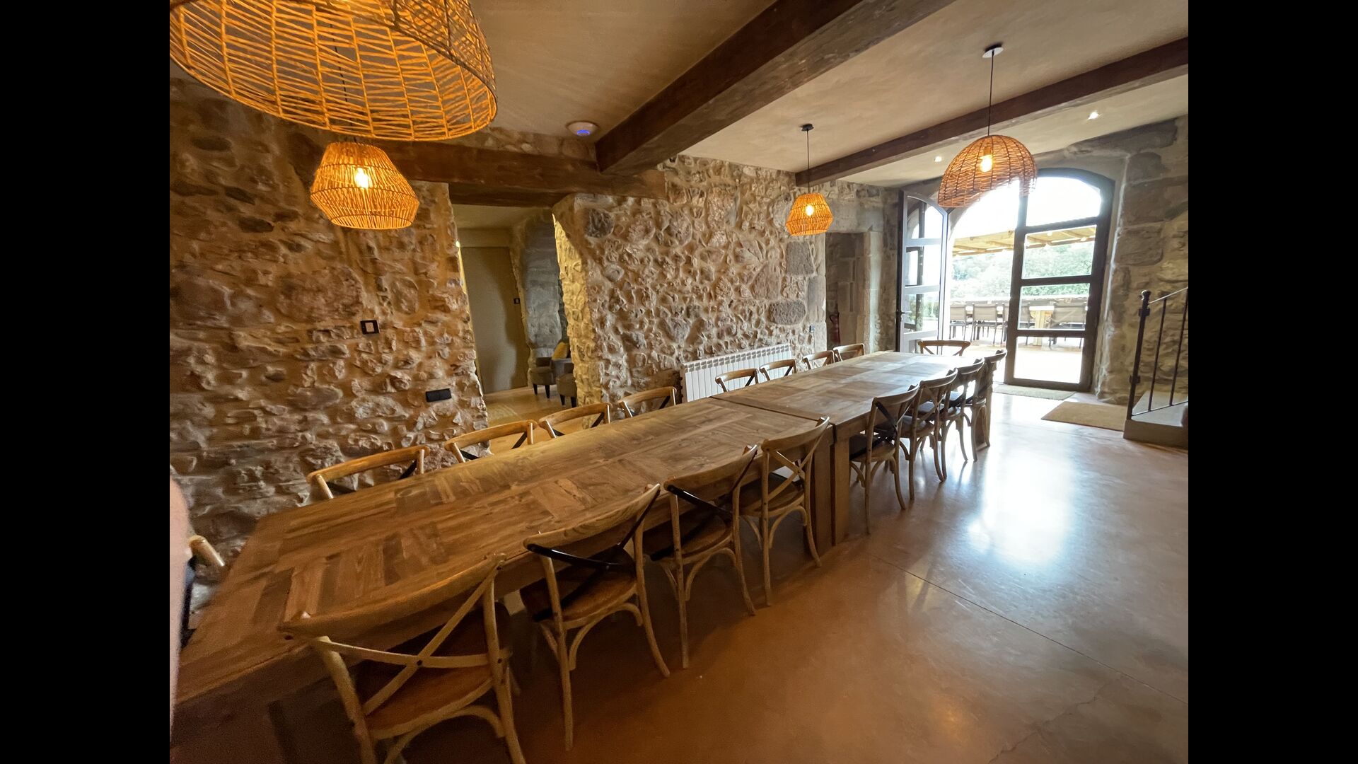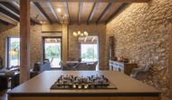 On the ground floor of the house, you enter a beautiful hall. To the left of the hall is the modern kitchen with freezer, oven, microwave, ceramic hob, dishwasher, espresso machine and even a draft beer tap. The kitchen has direct access to the large common room which has a beautiful Catalan refectory table (if you should want to eat in the shade for a day or two) and a cozy living room. From the common room's sliding doors you have direct access to the stone-paved terrace. The BBQ of the house is a bit further down in the garden. If you turn right from the kitchen you’ll meet the activity room, which probably will be the frame of some good hours, also for children in the group. Here are billiards, table tennis and darts.