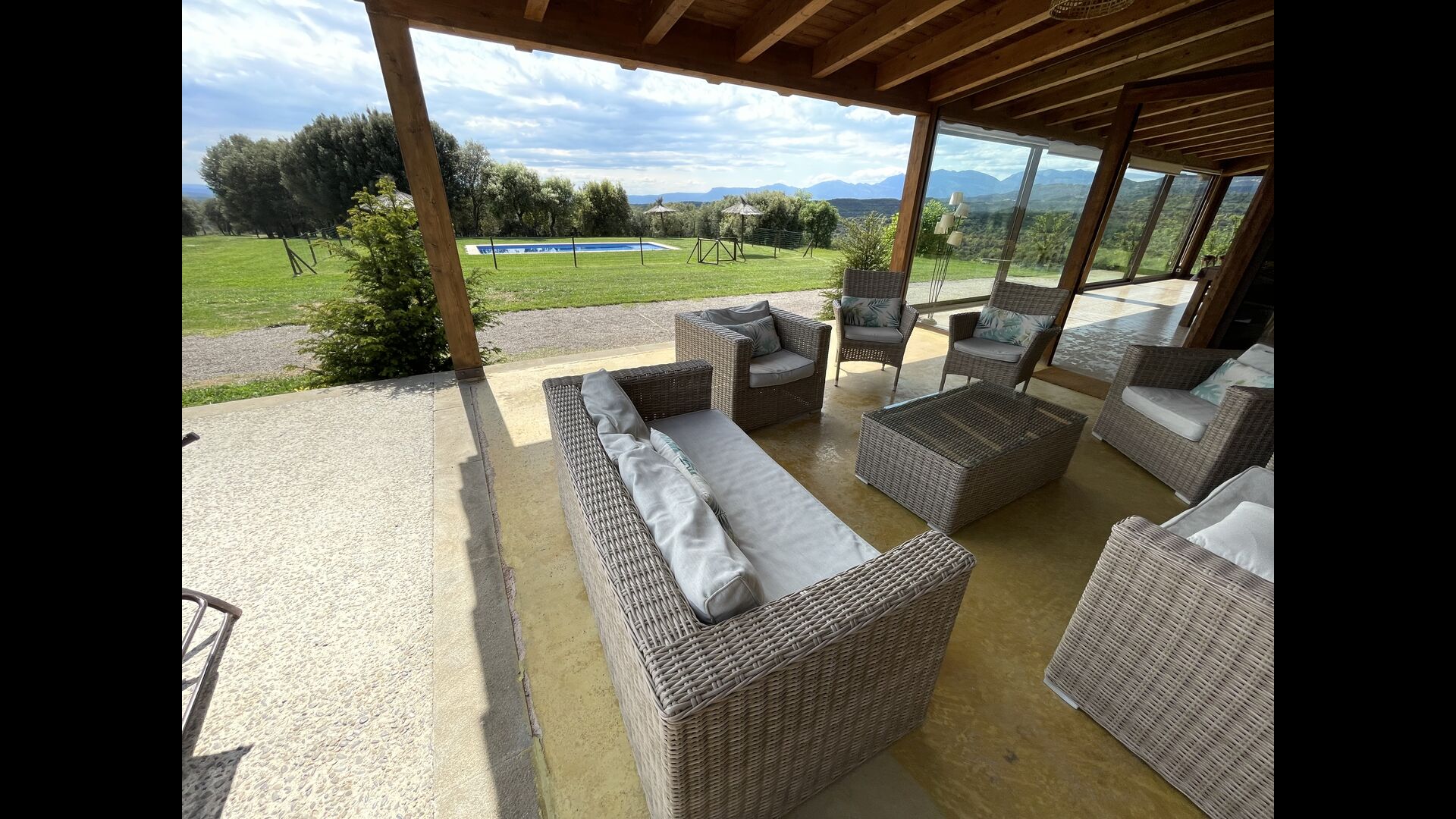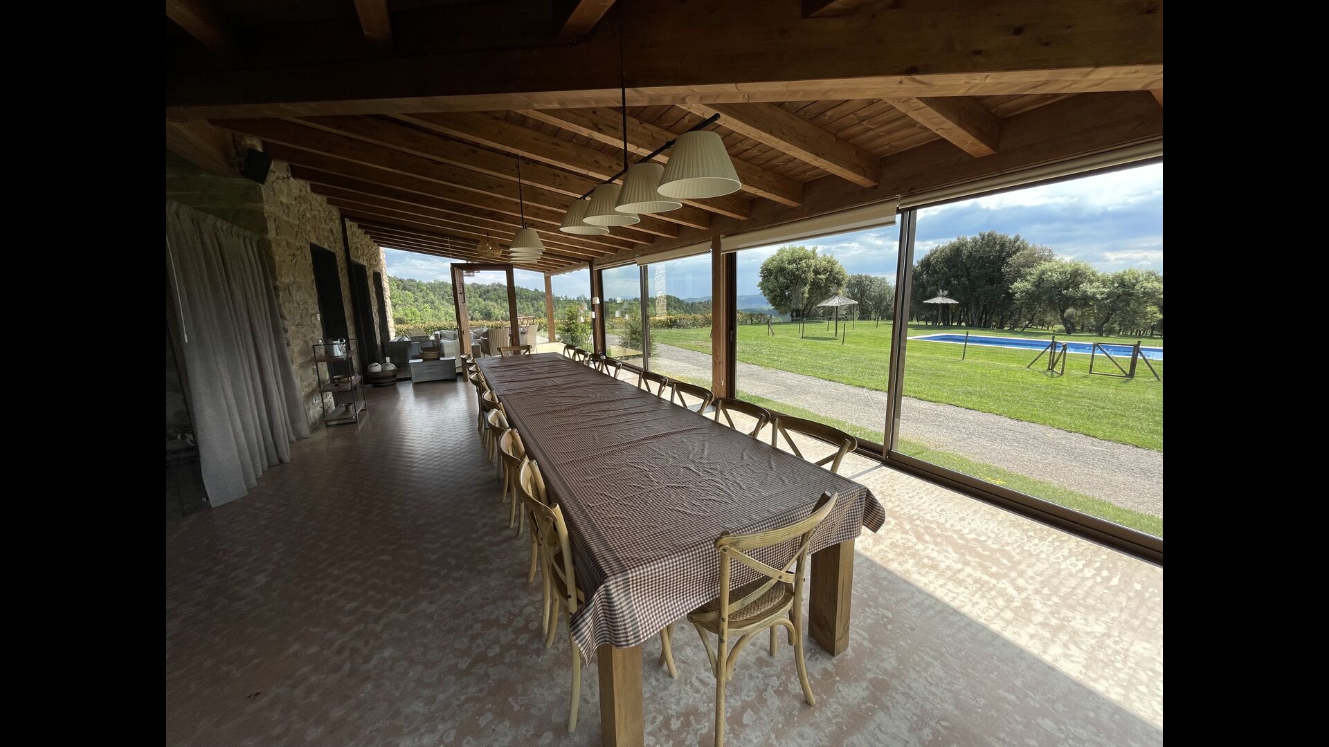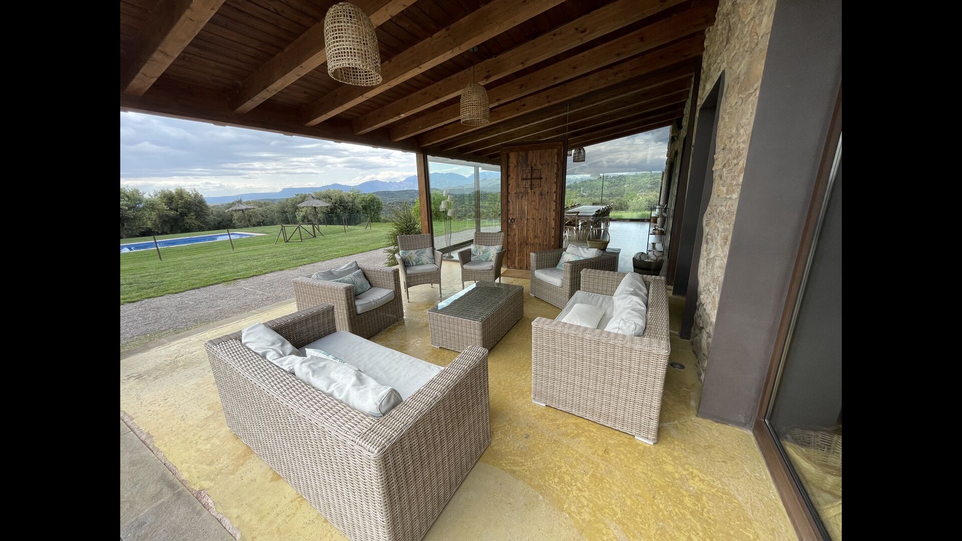 On the ground floor there is a porch located in front of the pool and with spectacular views of the mountains. From here, you can go into the dining room, which has views of the garden through the large windows.