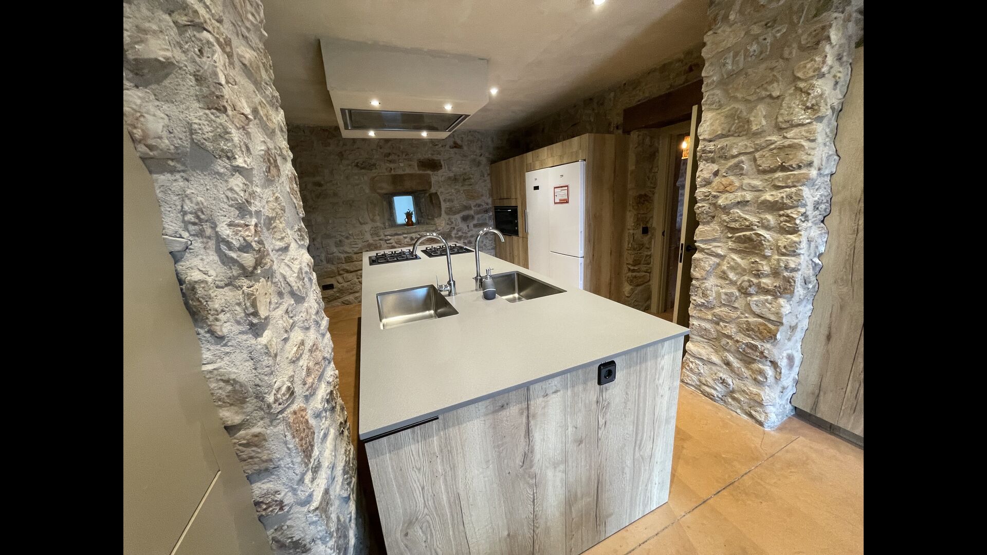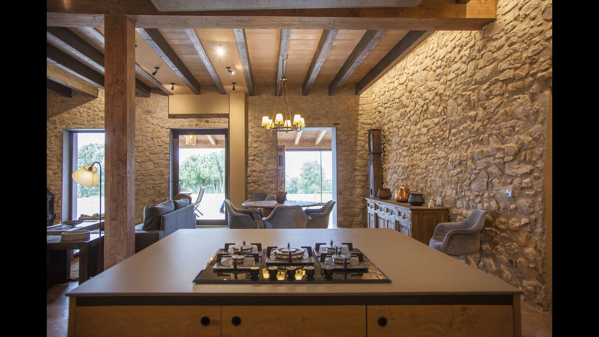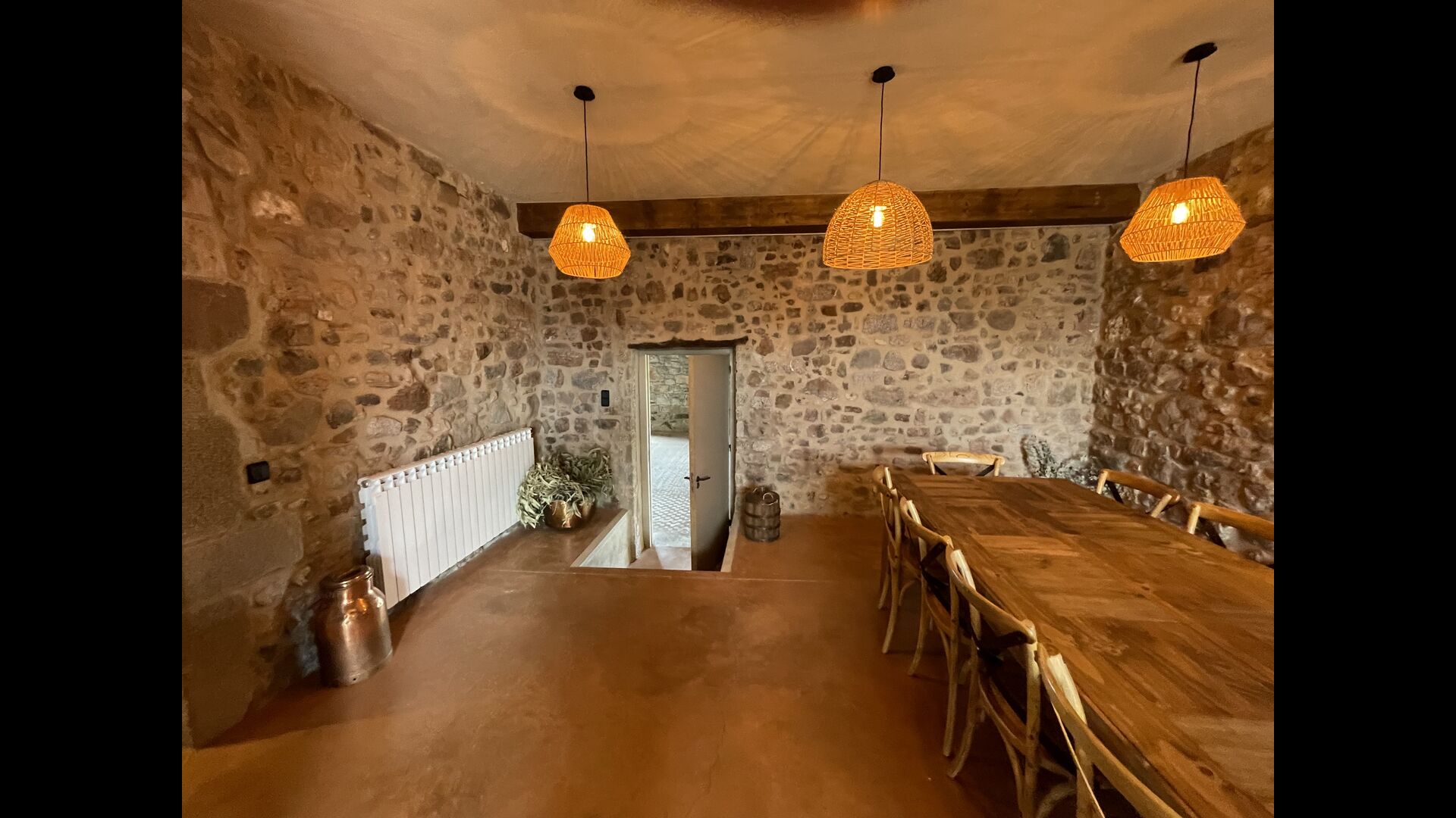 From the outdoor terrace, with a barbecue, a space to eat and loungers to relax, we enter directly into the Mas's large dining room. This acts as the heart of the house, connecting the two small living rooms on the ground floor with the large kitchen. The kitchen is fully equipped with 2 gas hobs, 2 dishwashers, 2 refrigerators with freezer, oven, microwave and coffee maker, as well as a small breakfast table.