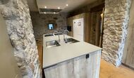 Connected to the dining room is the open kitchen with natural oak wood furniture, fully equipped with 2 fridges and 2 freezers, oven, microwave, gas hob, dishwasher, coffee machine and in the same room there is a relaxation area with comfortable sofas. On this floor there is also a small toilet with toilet and sink.