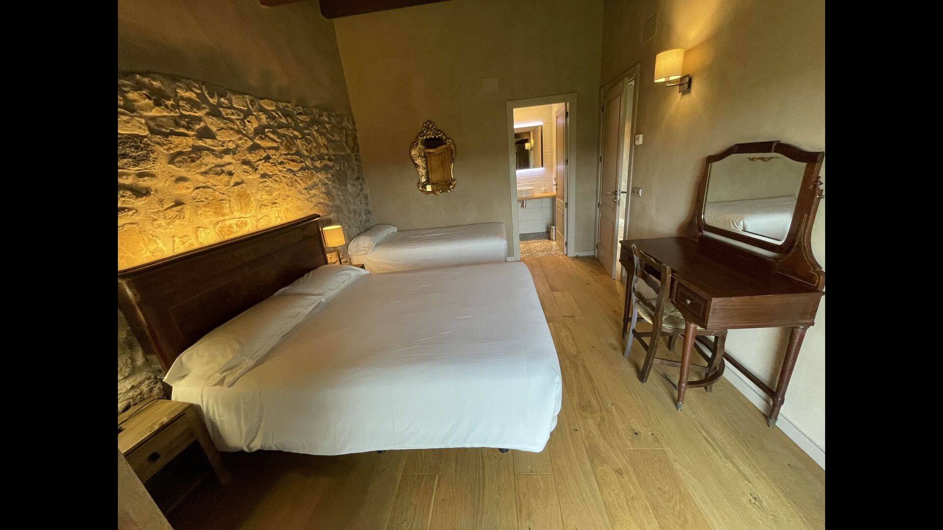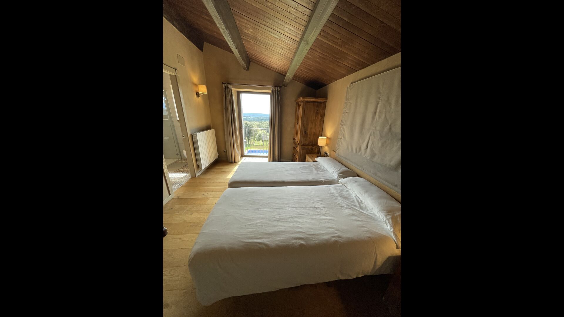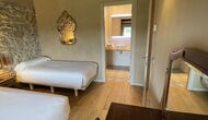 On the first floor you'll find 6 large double rooms with views of the nature, all with private bathrooms. On the second floor we find 2 more double rooms, and 2 quadruple rooms (with two single beds and a double bed, separated by a door). These also have all exterior windows and a private full bathroom.