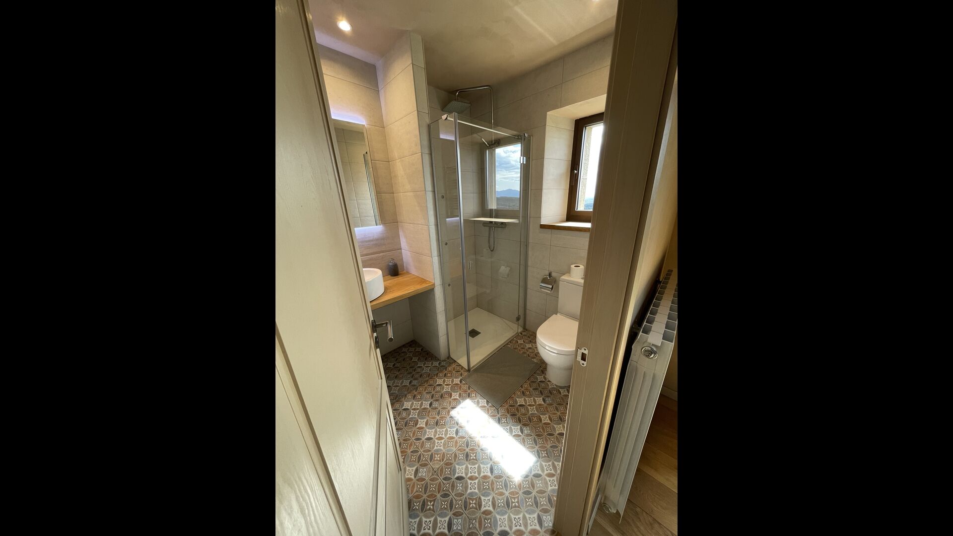 To the right of the hallway are four of the five beautiful bedrooms in Can de Mateo. The four bedrooms are all doubles, three of which have bath ensuite. One of the rooms has direct access to the terrace. This floor also contains a further bathroom which is shared with the last bedroom on the top floor of the house.