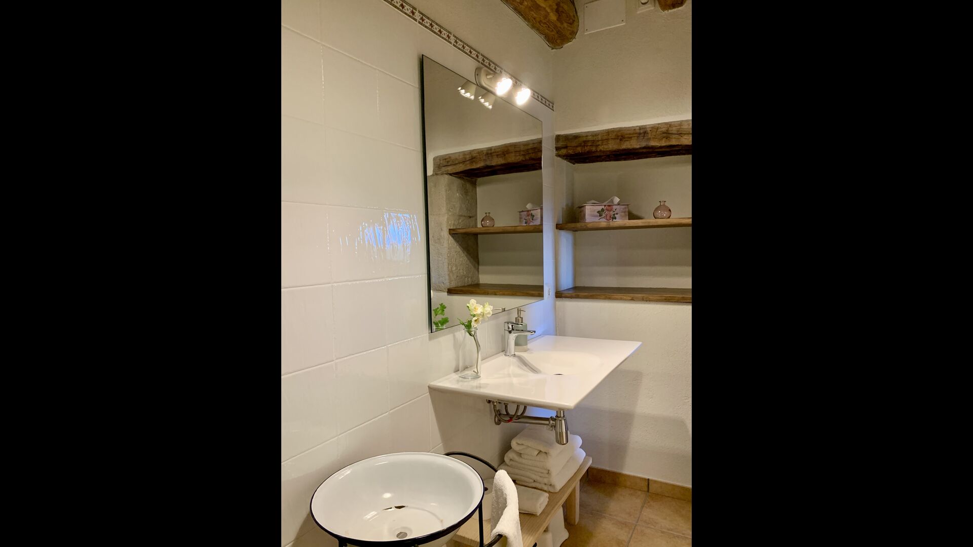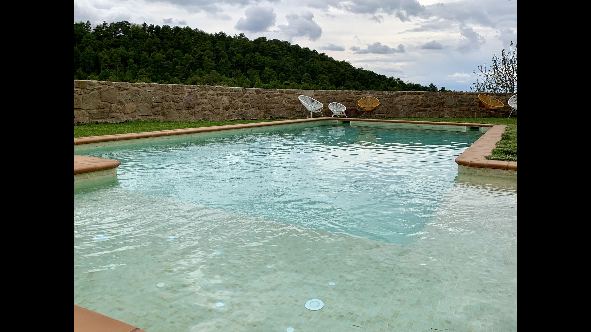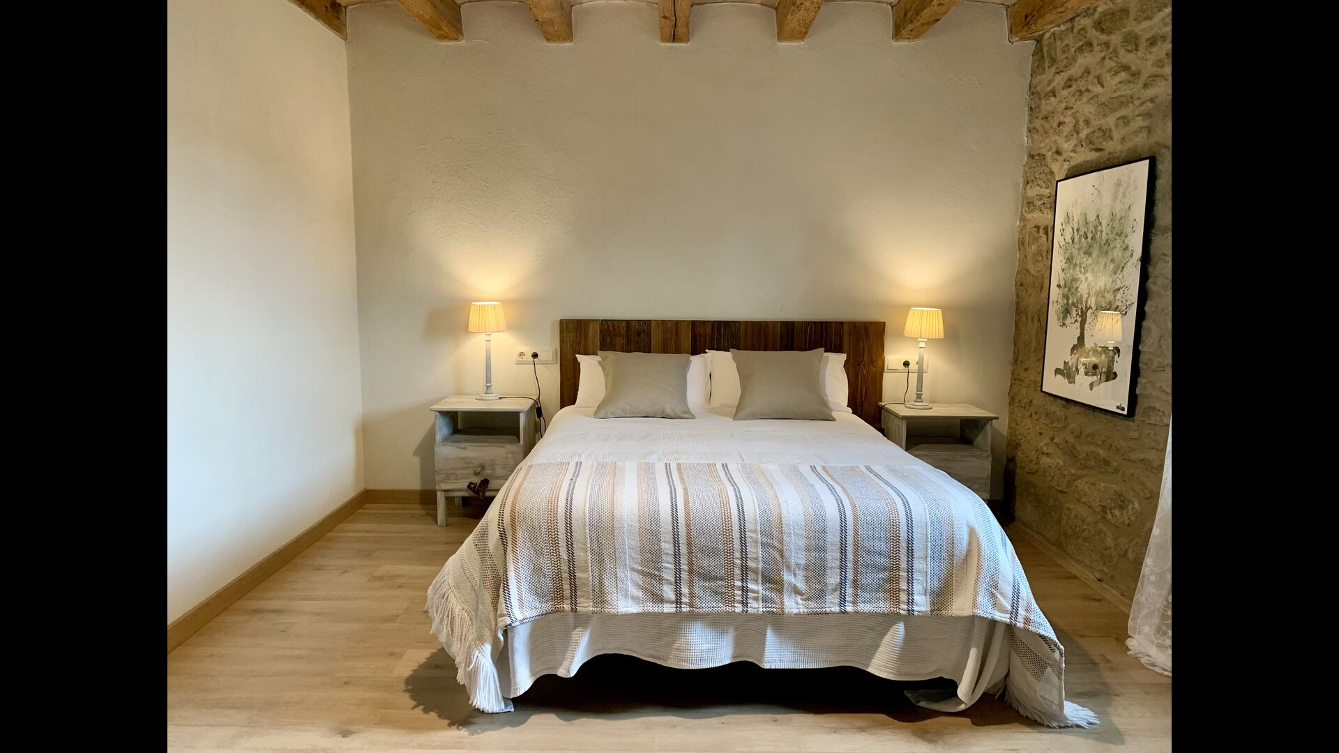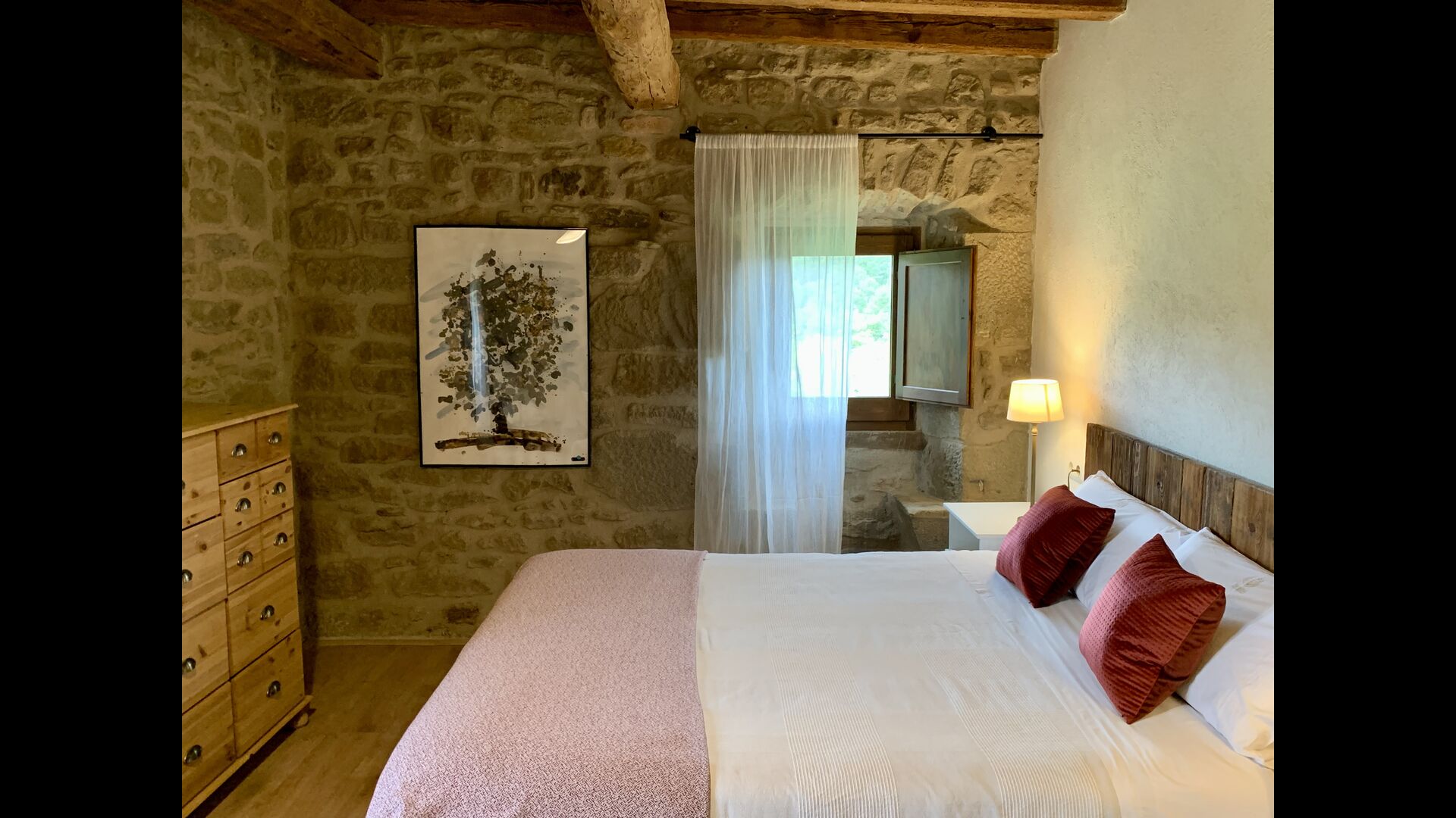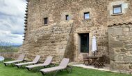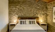 A gravel road winding through the forest takes you up through the greenery to the beautiful limestone house, which consists of a main building and a smaller budiling. Stepping out of the car, you are immediately struck by the beautiful nature surrounding the house. The swimming pool area is located in front of the house. It has a stunning view overlooking the valleys, and comfortable sun loungers are lined up along the pool. Truly the perfect spot to relax in the Catalan sun!