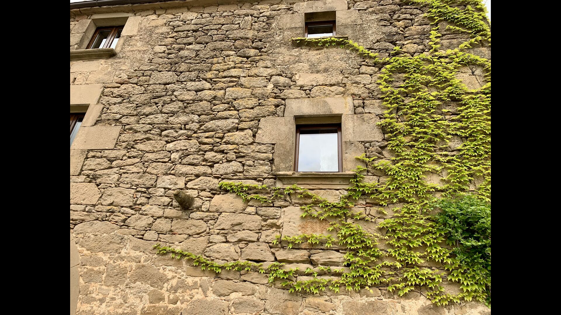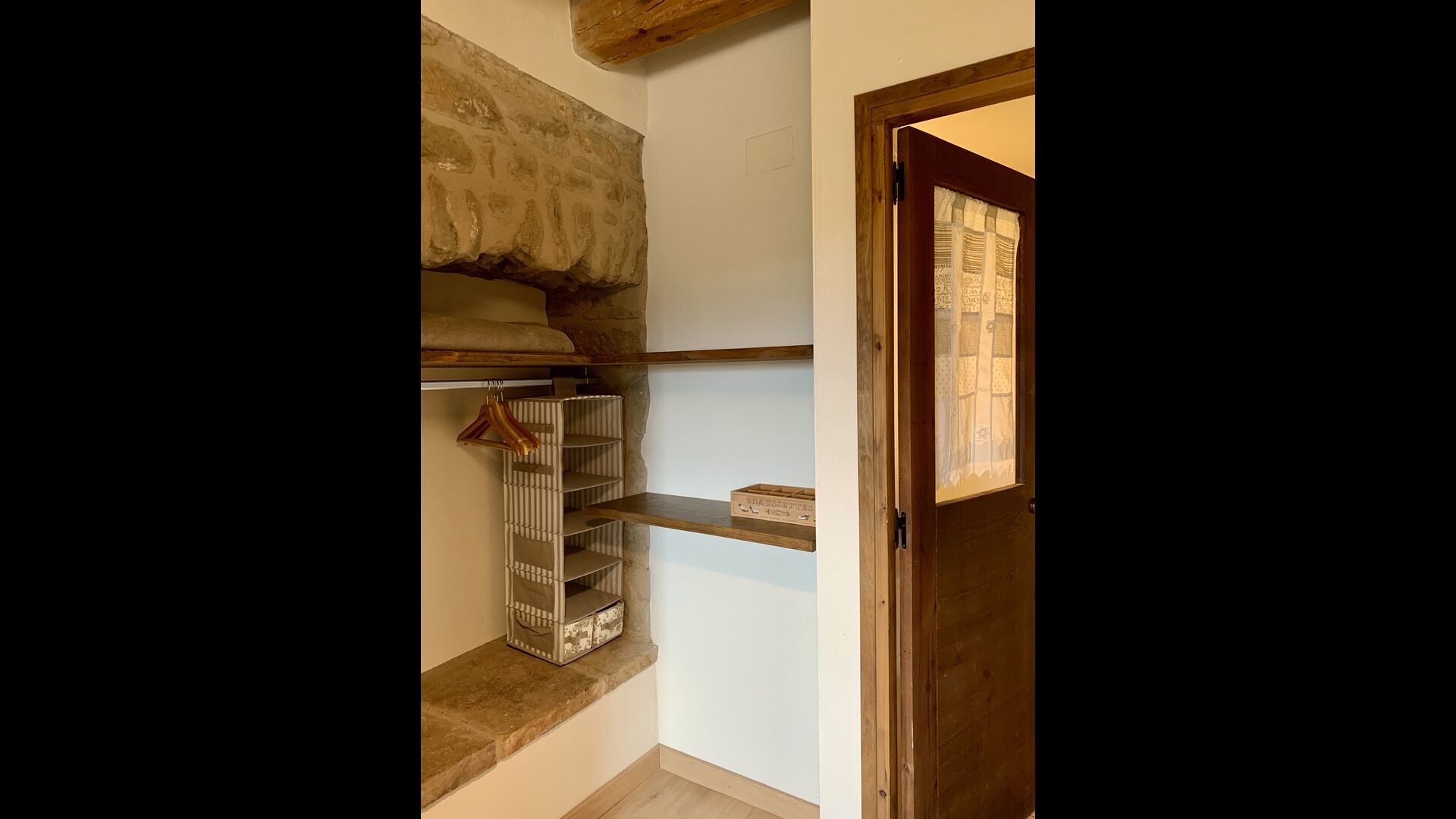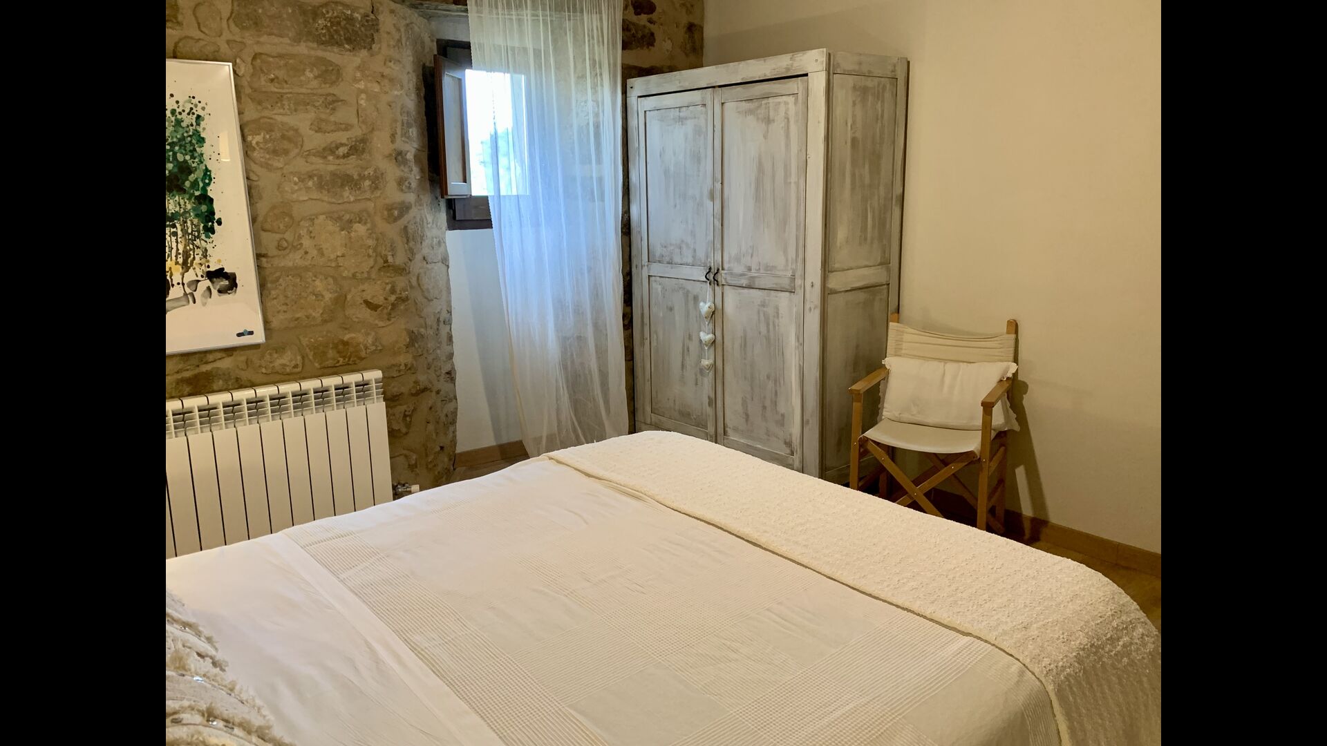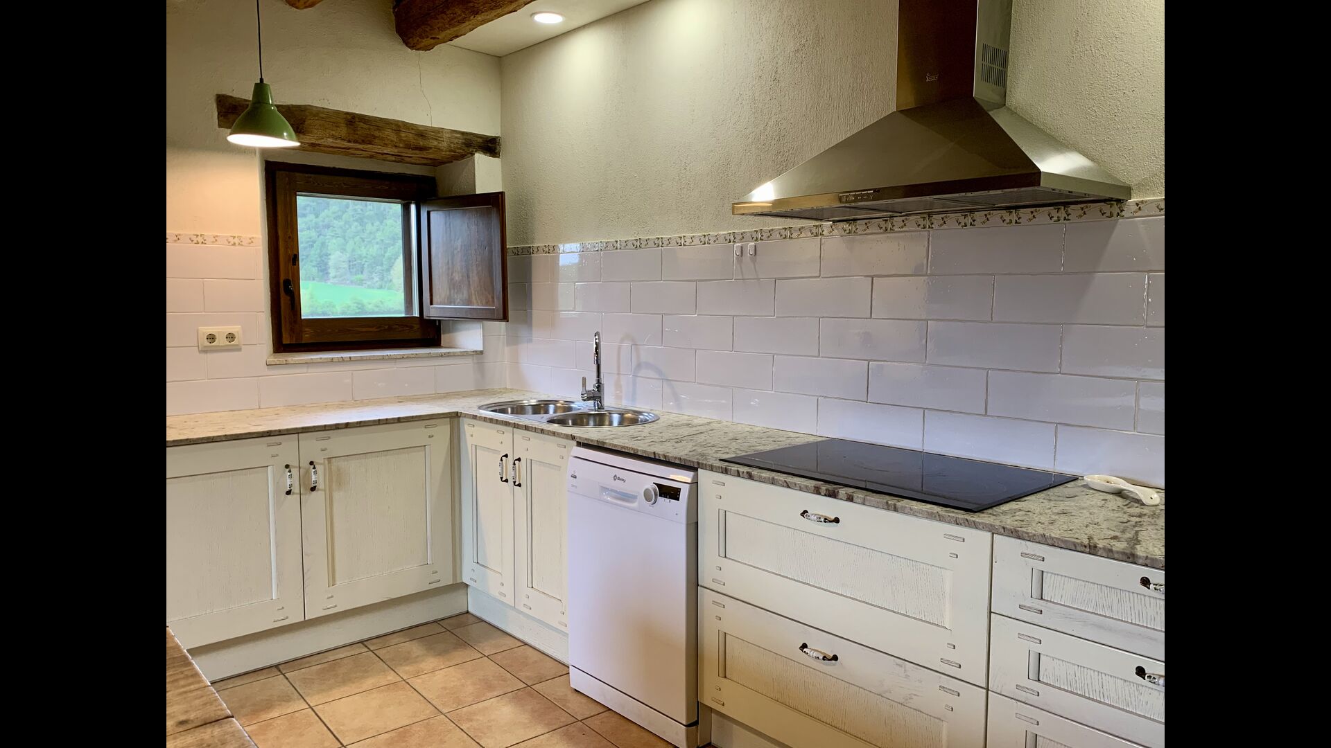 A gravel road winding through the forest takes you up through the greenery to the beautiful limestone house, which consists of a main building and a smaller budiling. Stepping out of the car, you are immediately struck by the beautiful nature surrounding the house. The swimming pool area is located in front of the house. It has a stunning view overlooking the valleys, and comfortable sun loungers are lined up along the pool. Truly the perfect spot to relax in the Catalan sun!