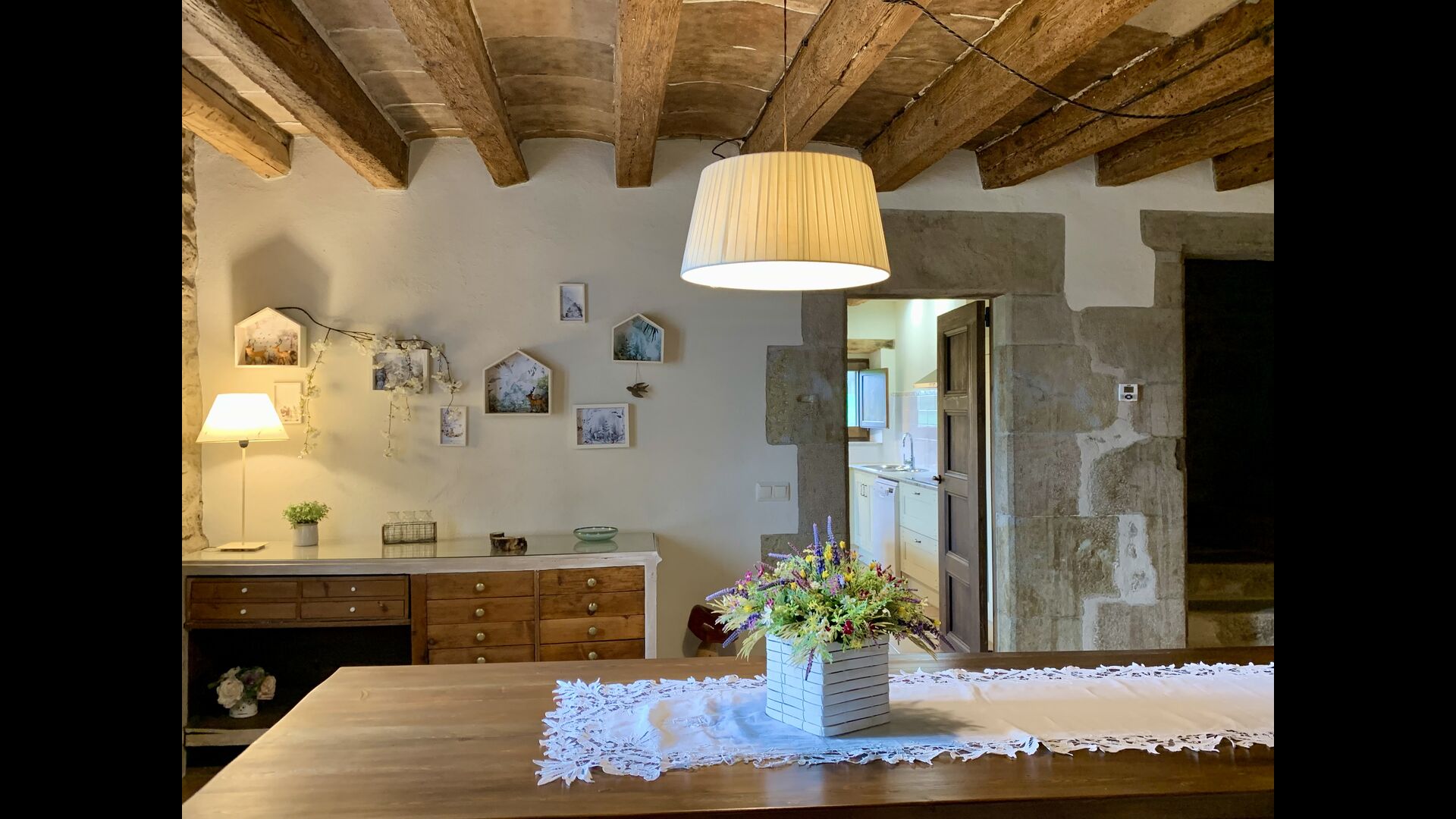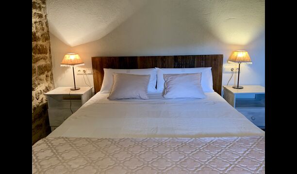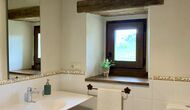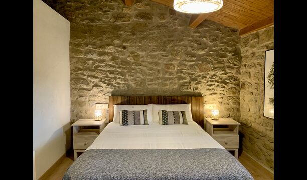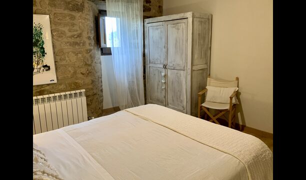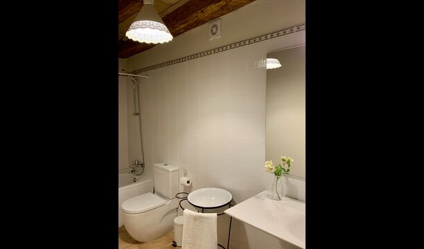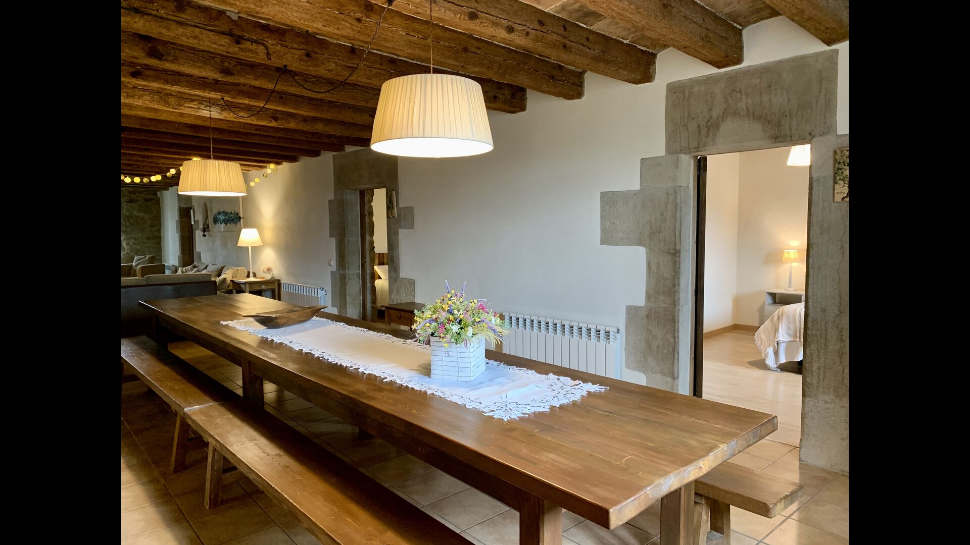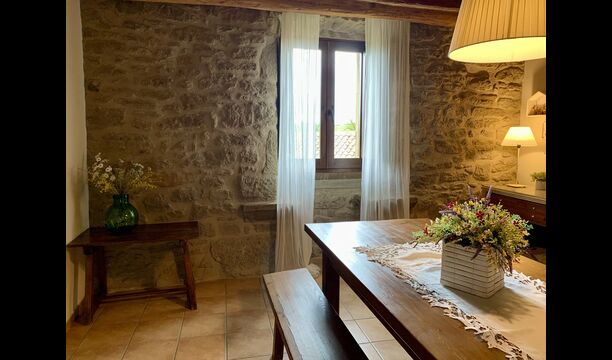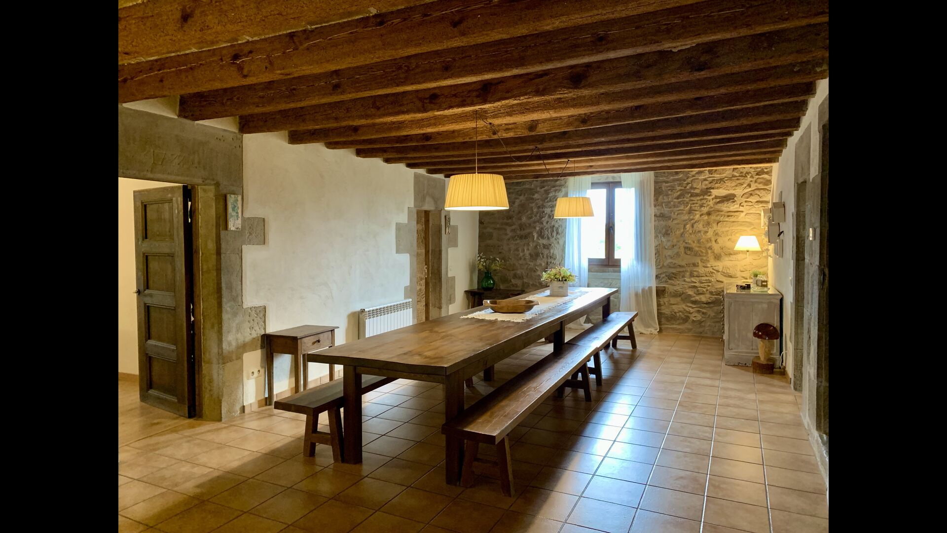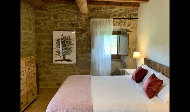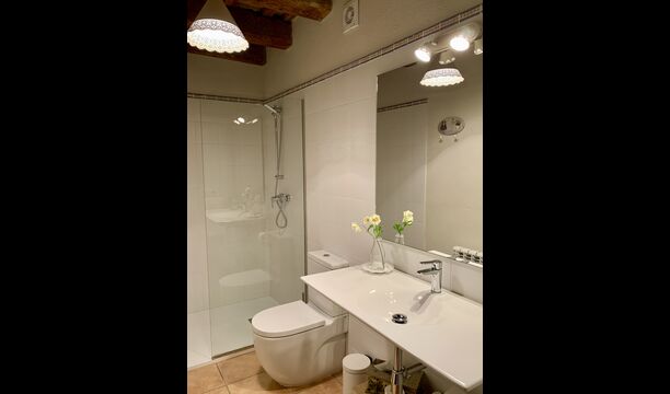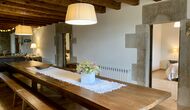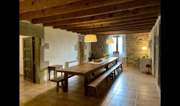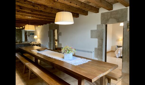 When entering the main building you step inside a grand welcoming hall, which is characterised by classic Catalan architecture and design, such as the big wooden double doors and limestone walls and floors. The staicase takes you up to the first floor of the house, where you will enter the big living and dining room, which is connected. The dining room has a long wooden table with room for the entire group, and is connected to the fully-equipped kitchen, and the lounge room has comfy lounges and a TV.