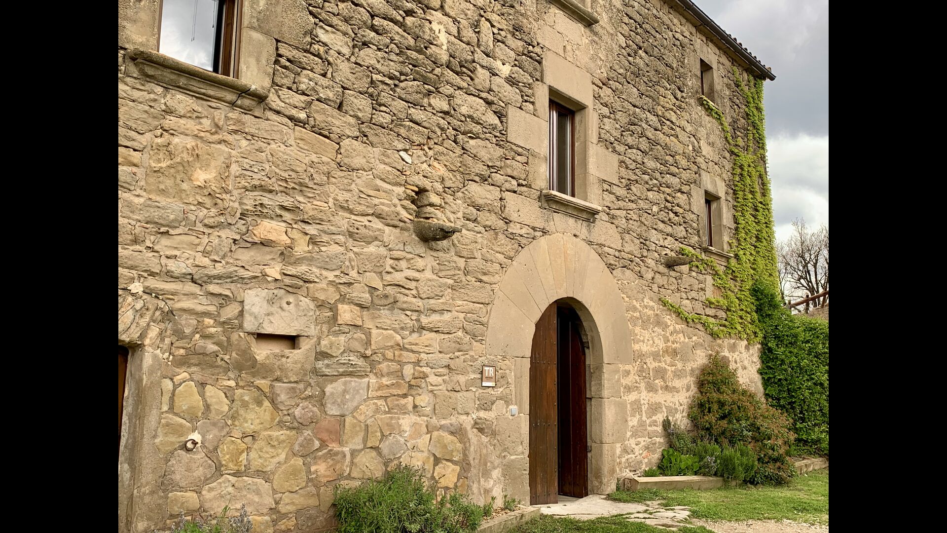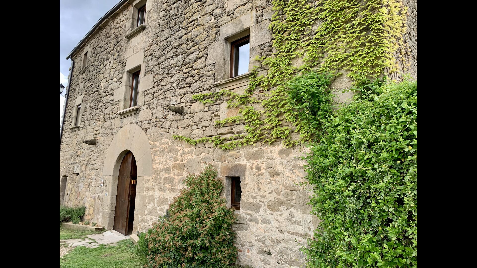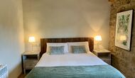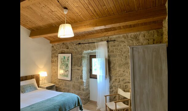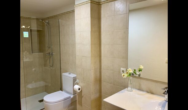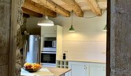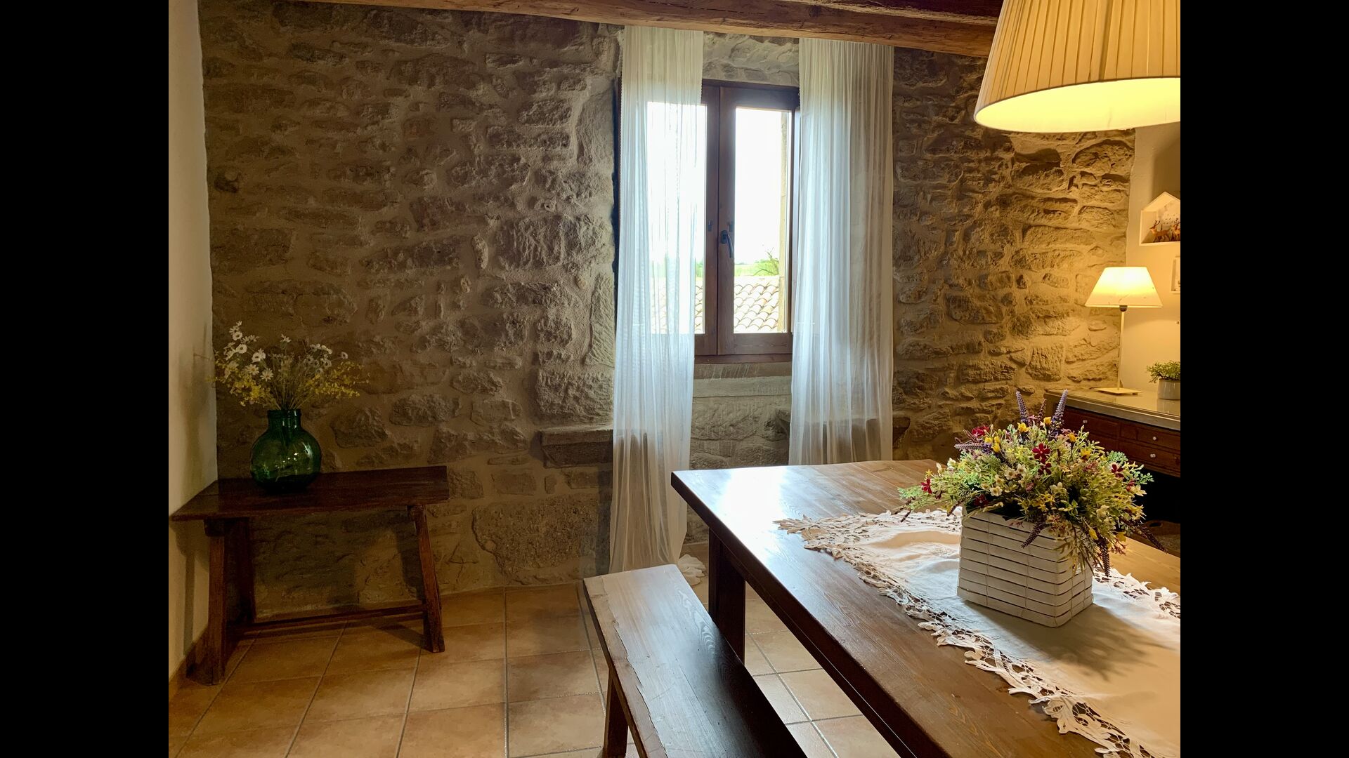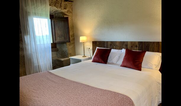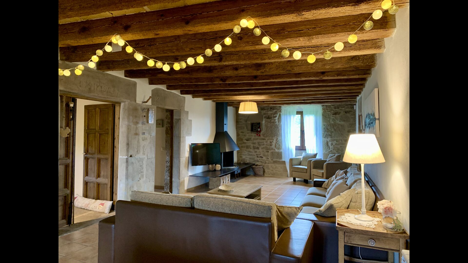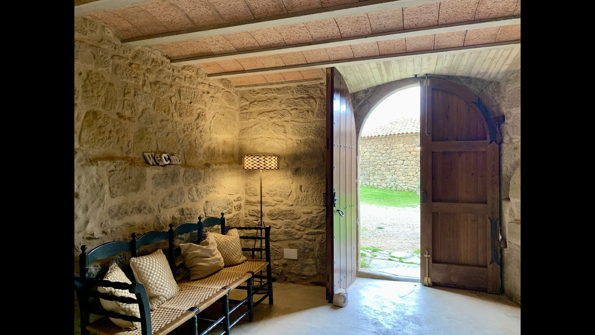When entering the main building you step inside a grand welcoming hall, which is characterised by classic Catalan architecture and design, such as the big wooden double doors and limestone walls and floors. The staicase takes you up to the first floor of the house, where you will enter the big living and dining room, which is connected. The dining room has a long wooden table with room for the entire group, and is connected to the fully-equipped kitchen, and the lounge room has comfy lounges and a TV.