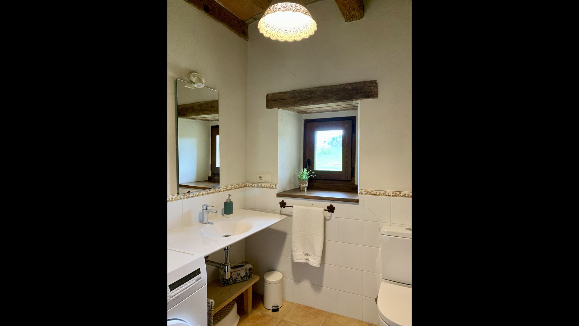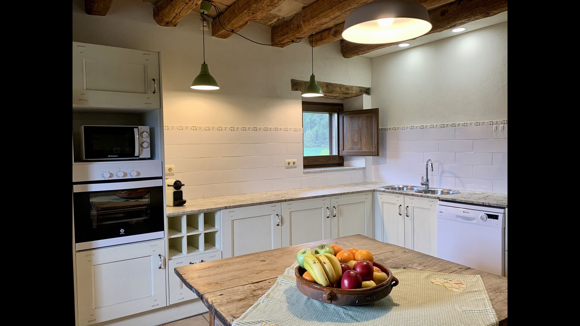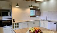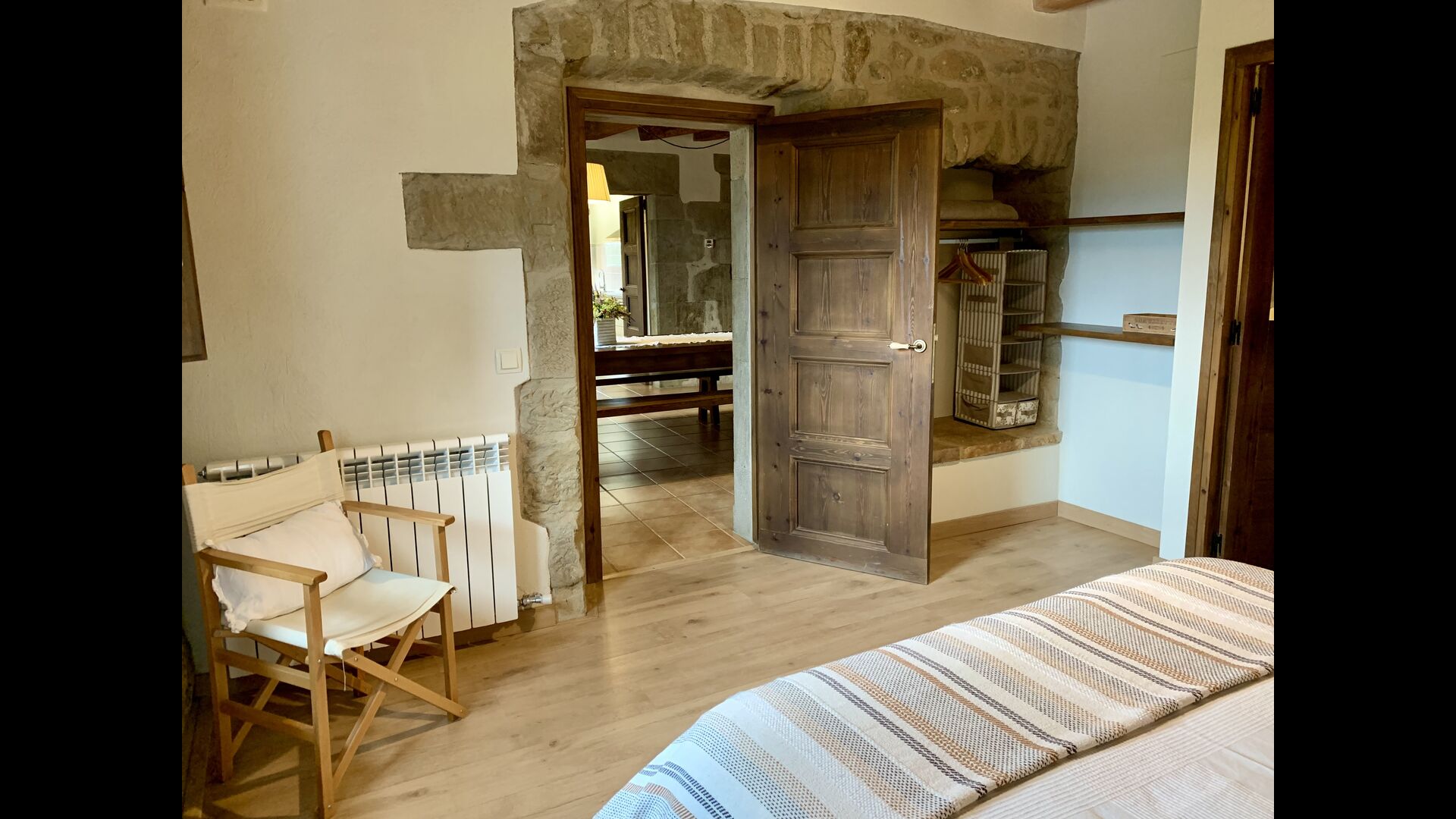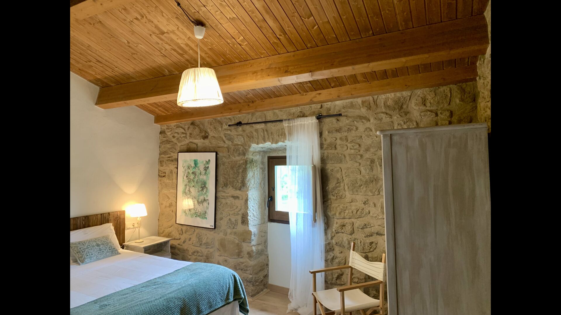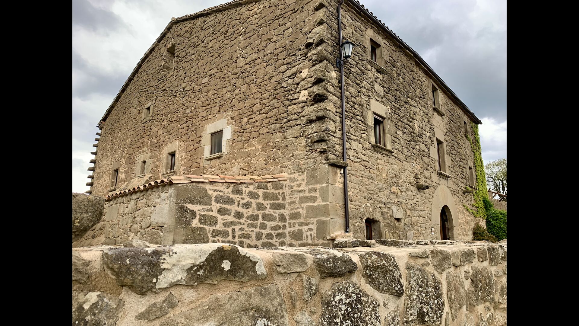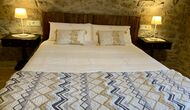 When entering the main building you step inside a grand welcoming hall, which is characterised by classic Catalan architecture and design, such as the big wooden double doors and limestone walls and floors. The staicase takes you up to the first floor of the house, where you will enter the big living and dining room, which is connected. The dining room has a long wooden table with room for the entire group, and is connected to the fully-equipped kitchen, and the lounge room has comfy lounges and a TV.