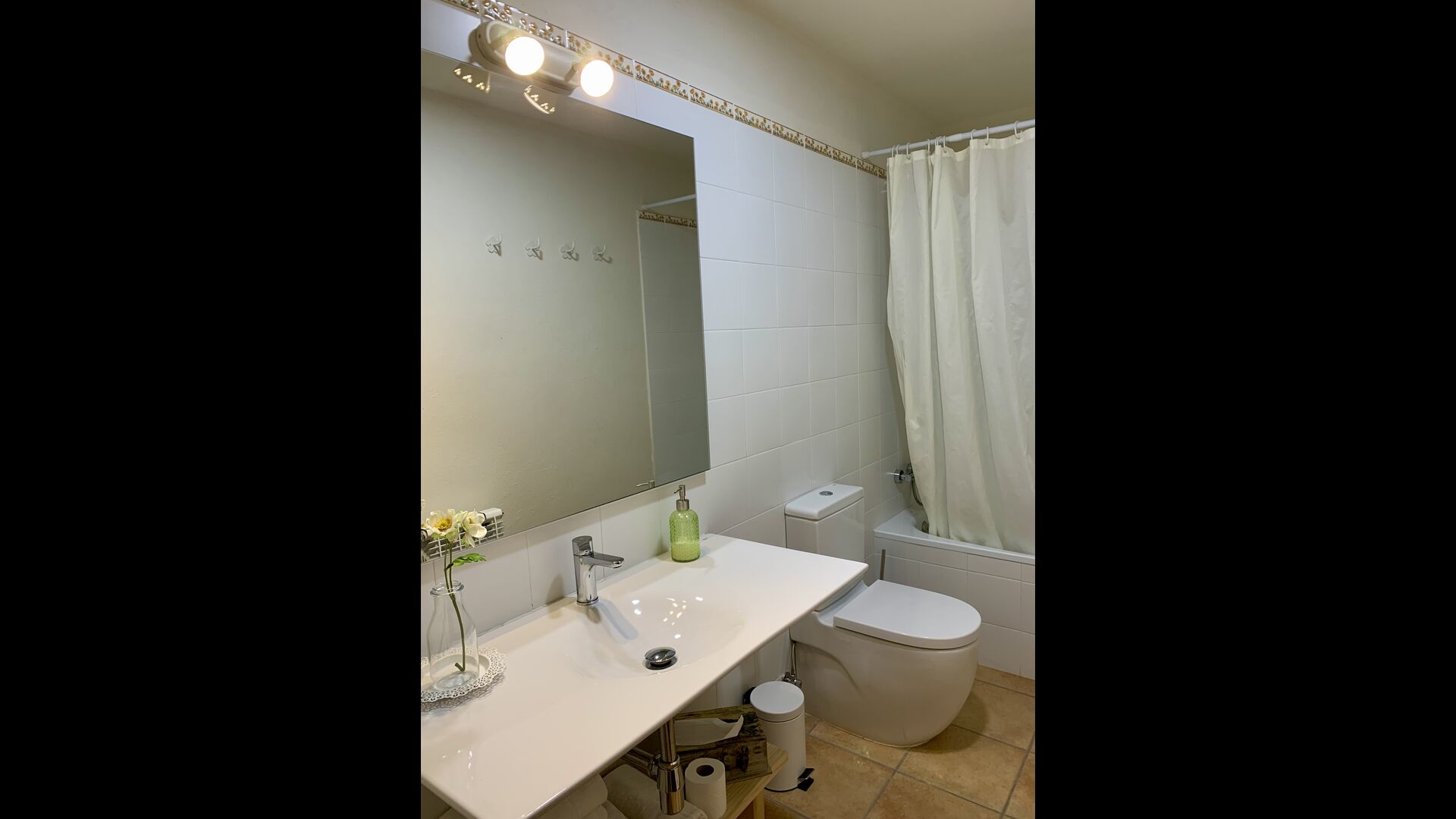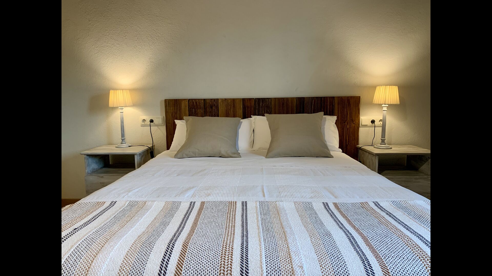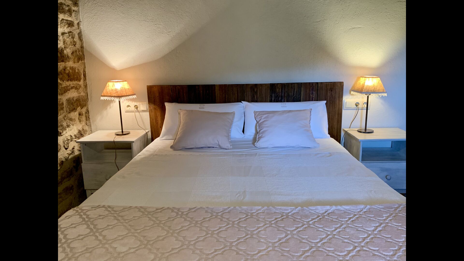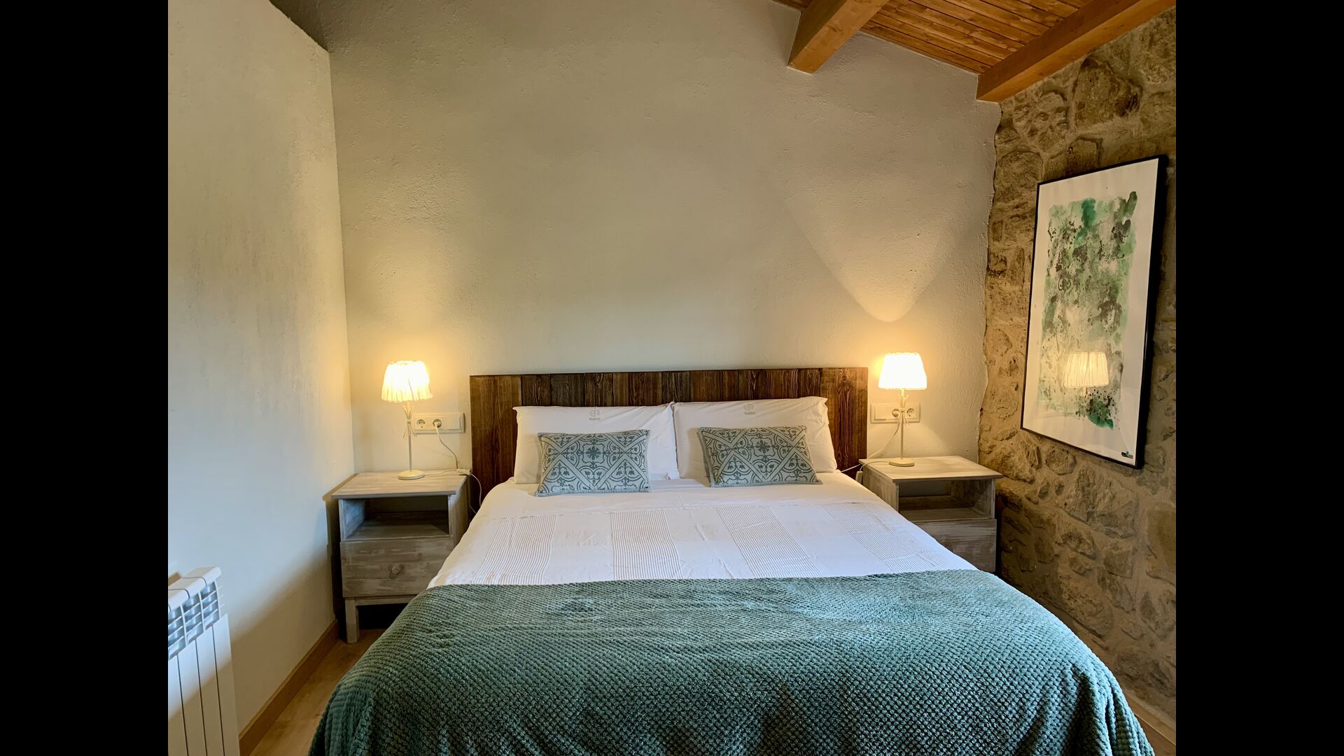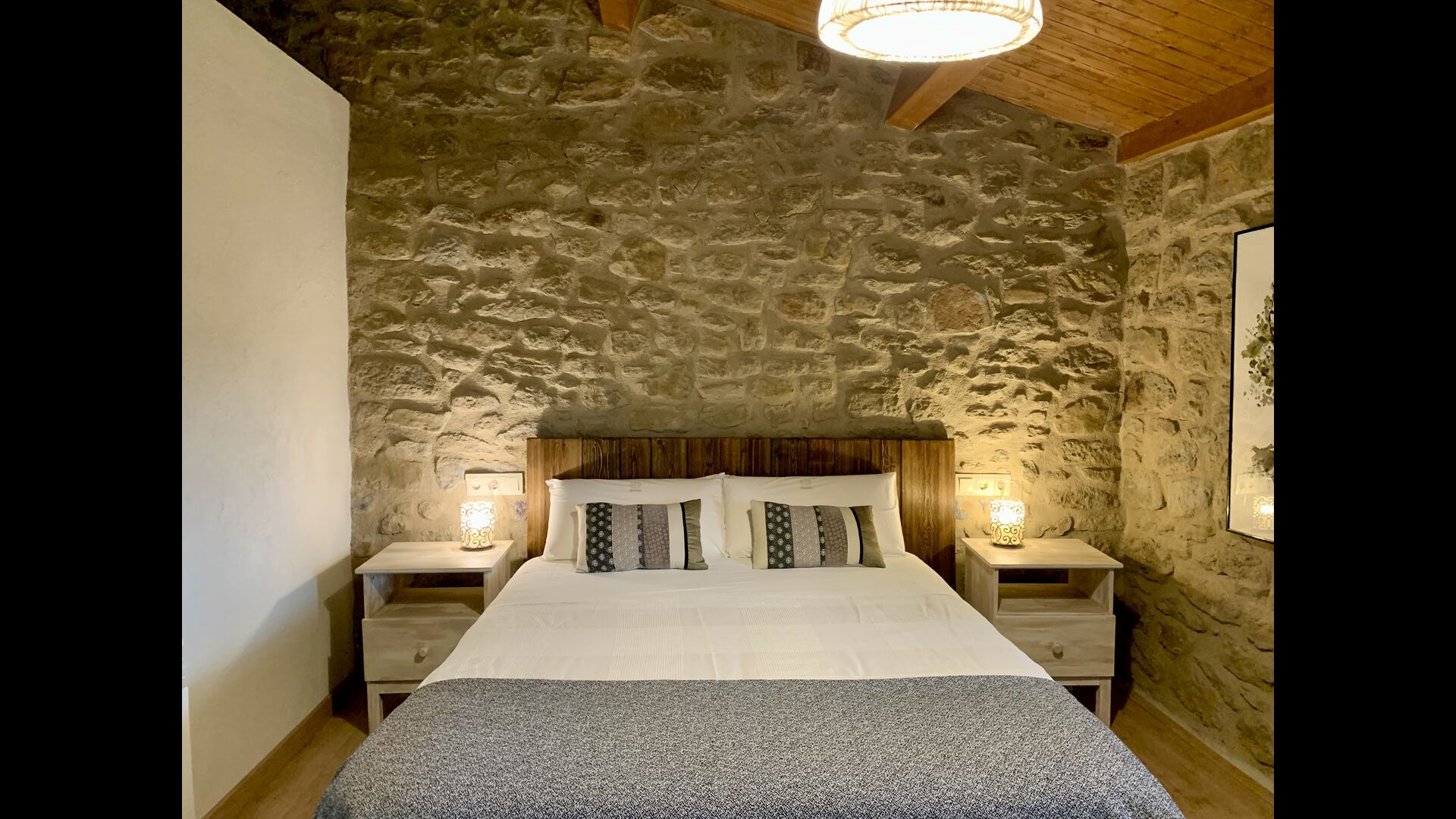 When entering the main building you step inside a grand welcoming hall, which is characterised by classic Catalan architecture and design, such as the big wooden double doors and limestone walls and floors. The staicase takes you up to the first floor of the house, where you will enter the big living and dining room, which is connected. The dining room has a long wooden table with room for the entire group, and is connected to the fully-equipped kitchen, and the lounge room has comfy lounges and a TV.