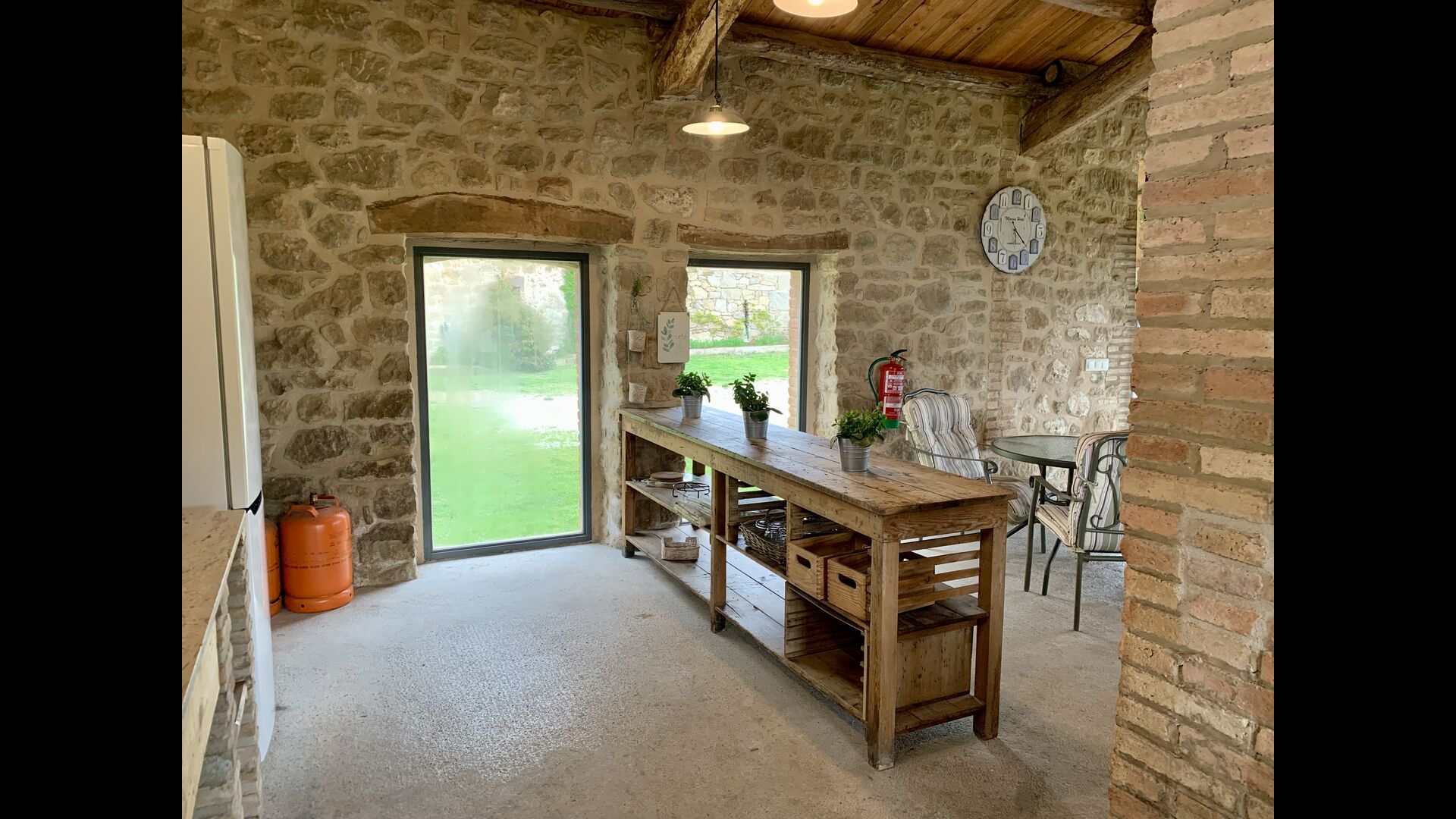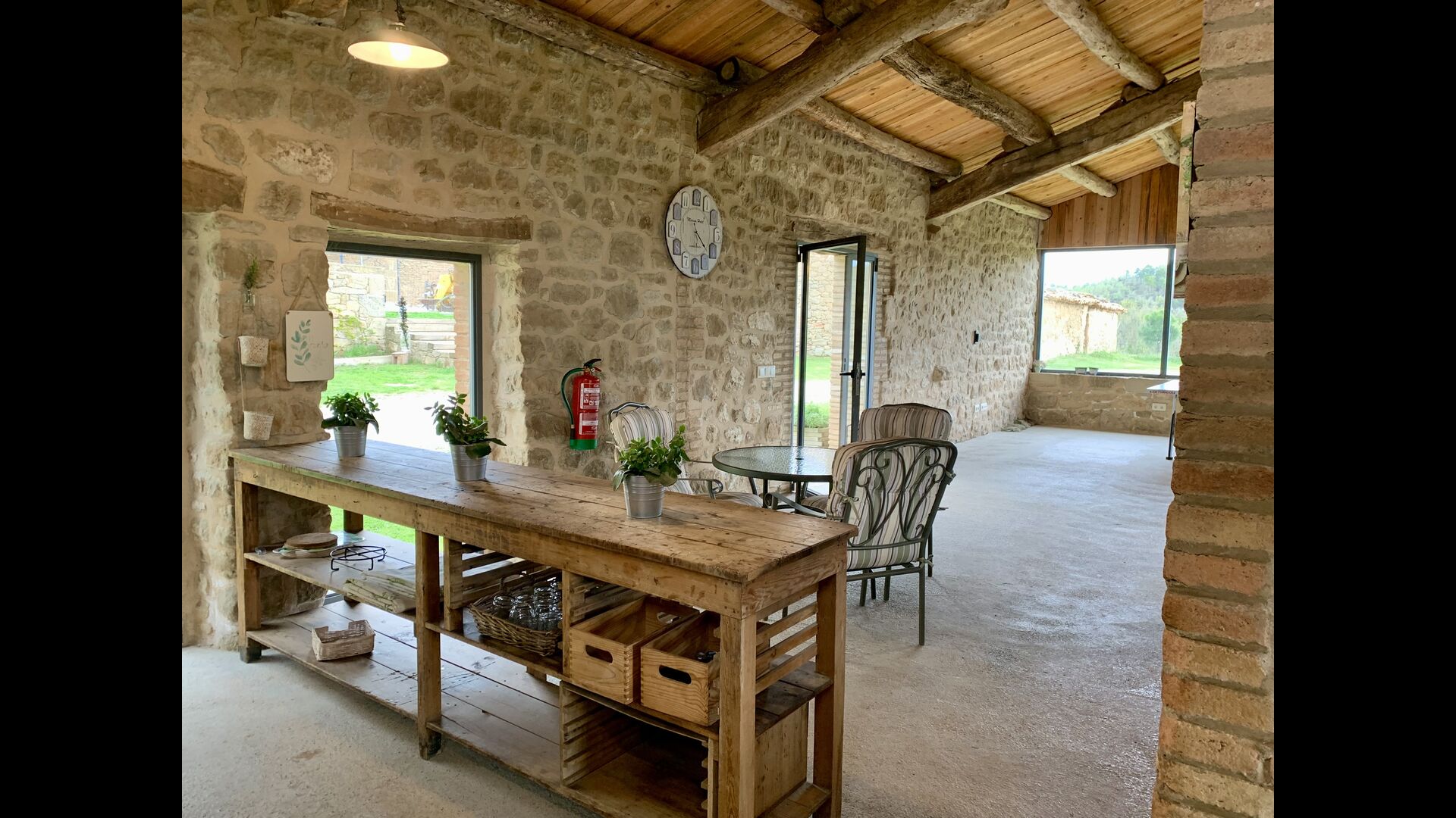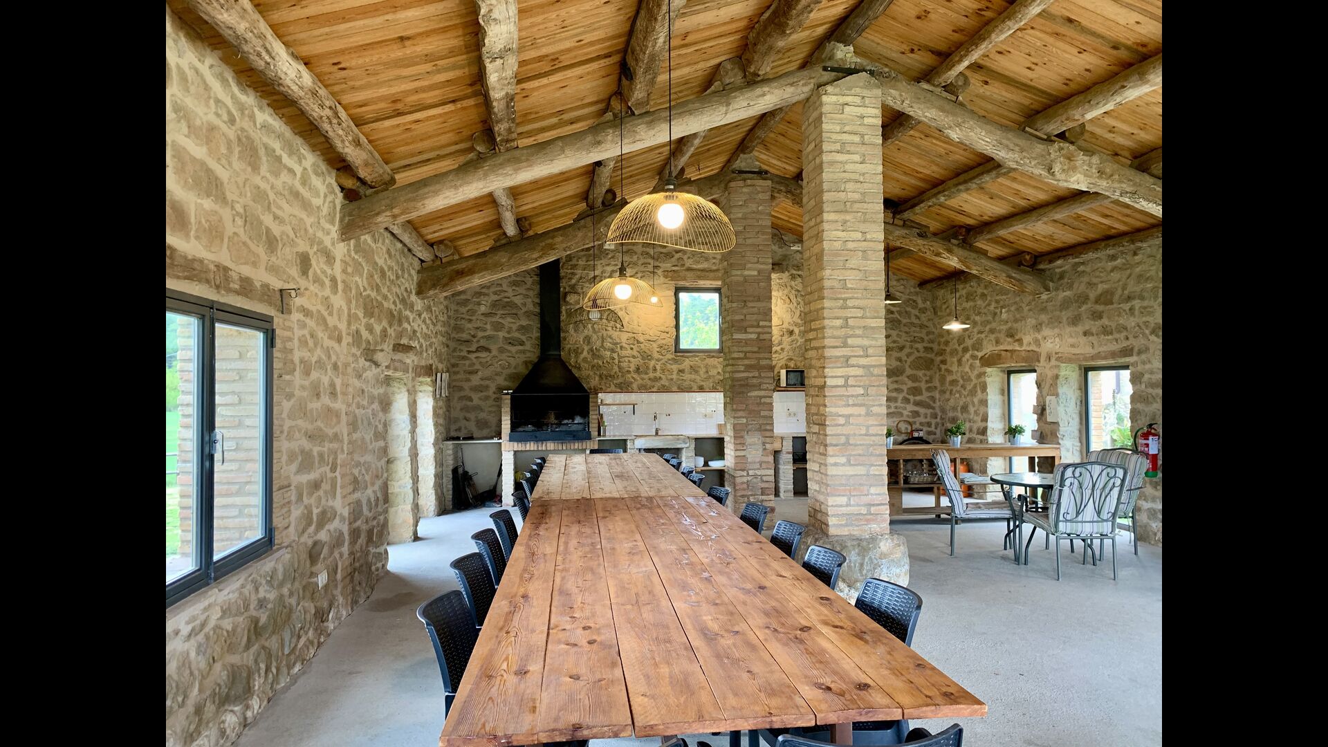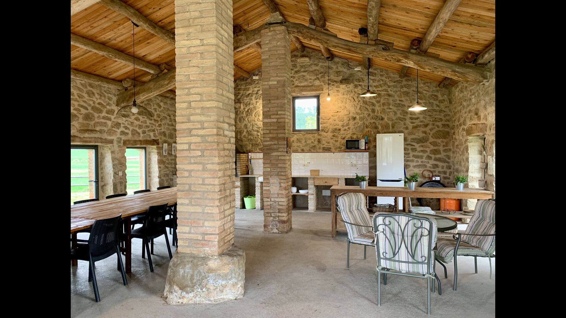 The smaller, separate limestone building is located next to the swimming pool area. Inside there is a large table tennis, a long wooden dining table and a BBQ area with simple kitchen facilities. The location is superb, as it is easy to get from the pool area. We imagine the children of the group will have a a blast running back and forth from the game room and the swimming pool.