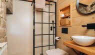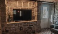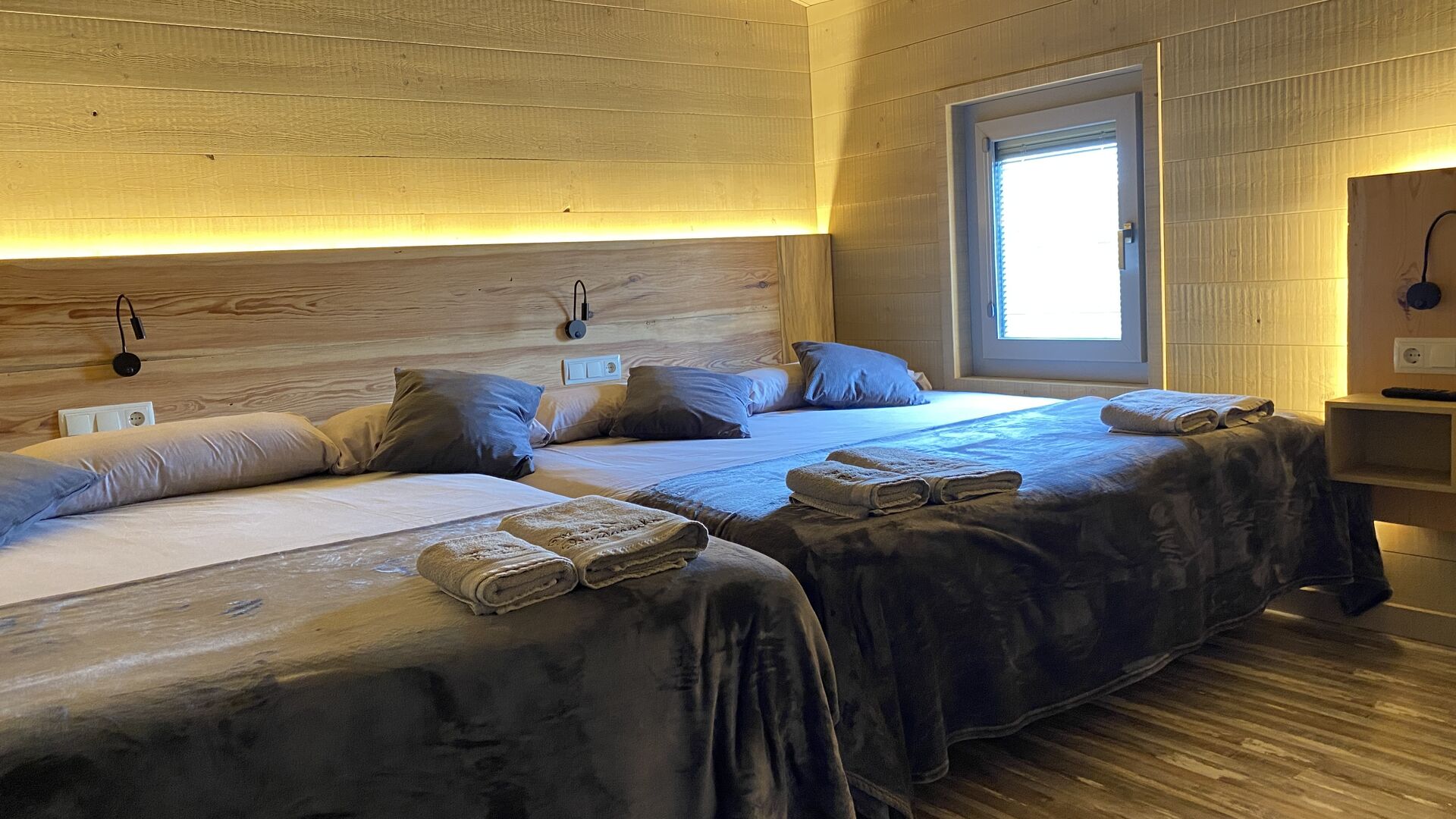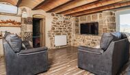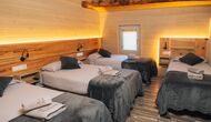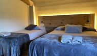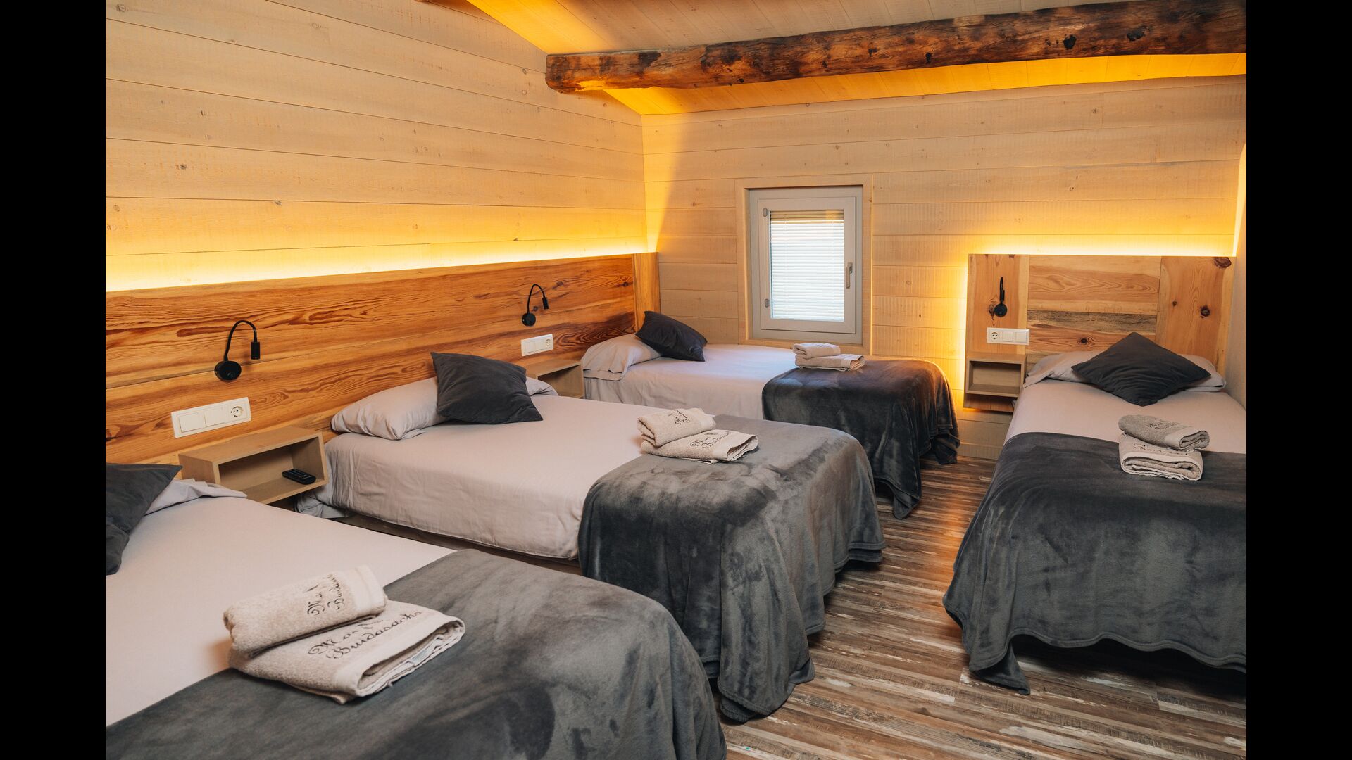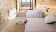 On the upper floor, there is a cosy sitting room with sofas, TV, Air conditioning and then there are four more bedrooms. One is a four-bedroom with 4 single beds and bathroom ensuite. Then there are 3 double rooms with double beds, own bathrooms and TV. All of them have room for 1 extra bed.