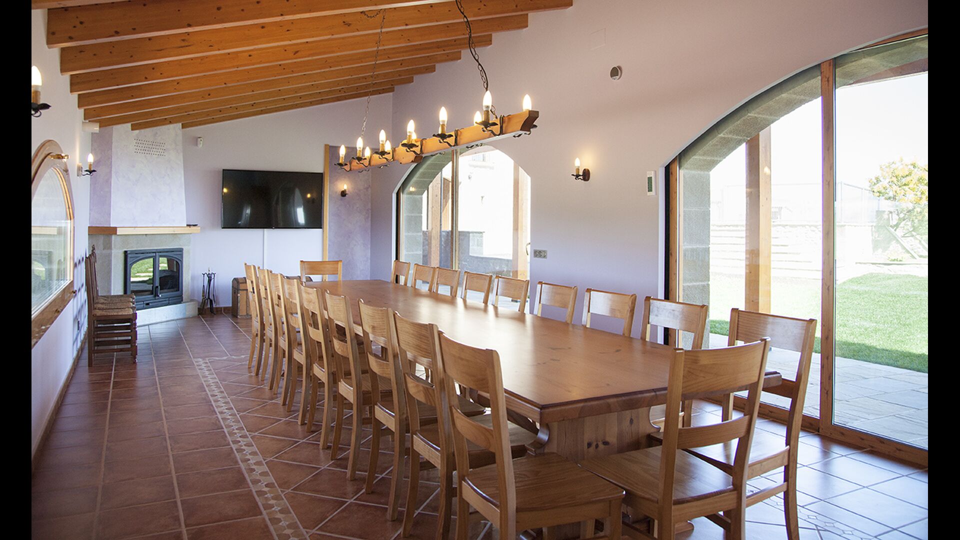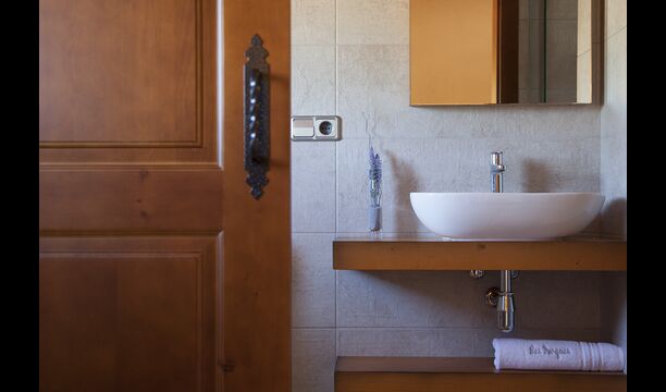 Lastly, you’ll have the main building, of course. The house sleeps maximum 24 persons in 9 bedrooms across 7 double rooms and 2 quadruple rooms. The bedrooms are all spacious and very modernly furnished, all of them with high quality beds, linen and mattresses. There are also 7 bathrooms in the house. At the first floor, you will find the lovely, big family room with a large sofa arrangement as well as a wooden dining table and a very well equipped kitchen. Furthermore, you will have two flat screen televisions.