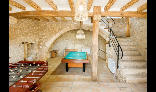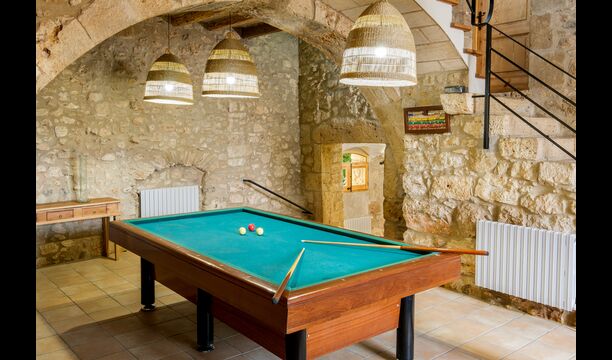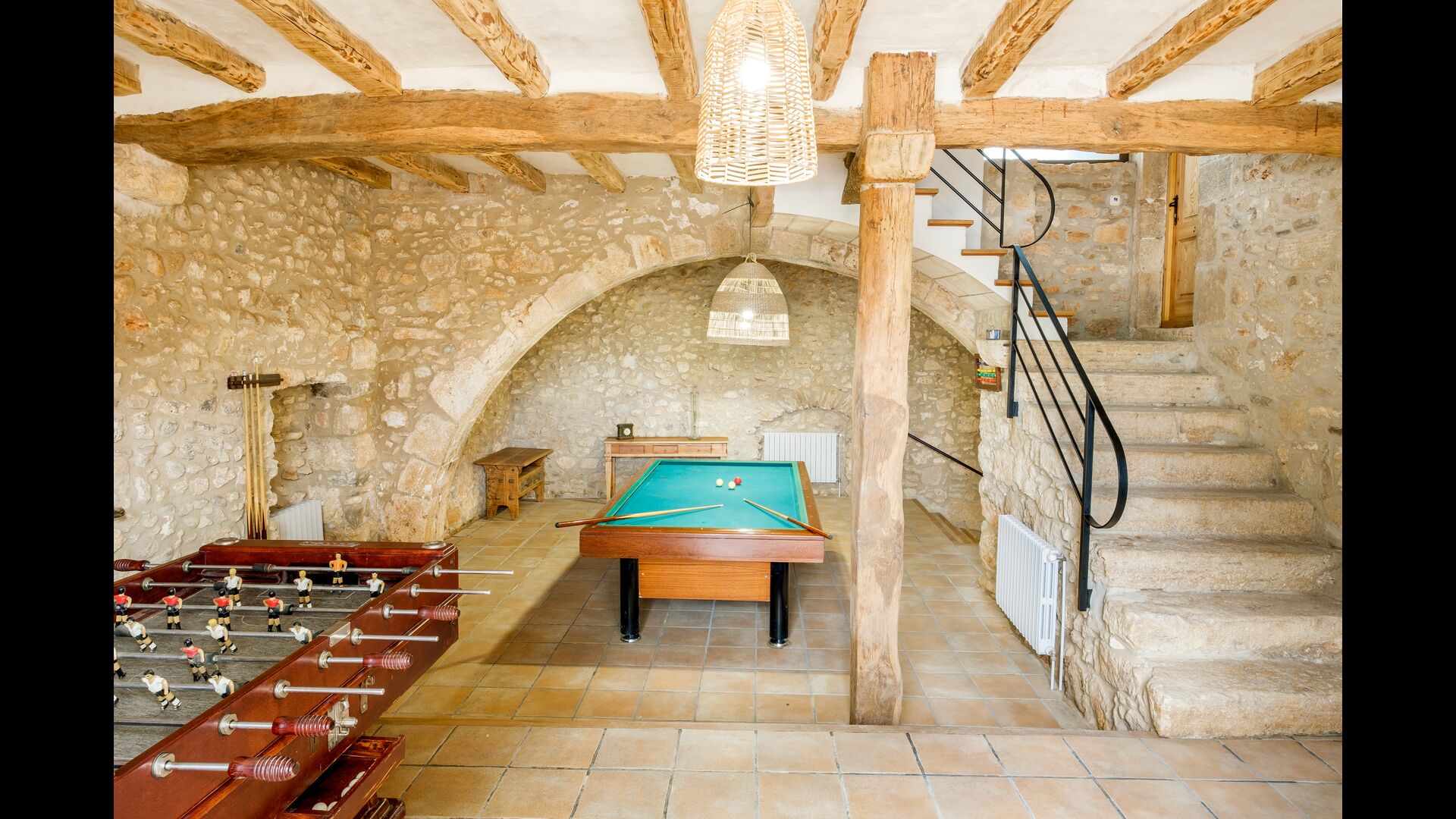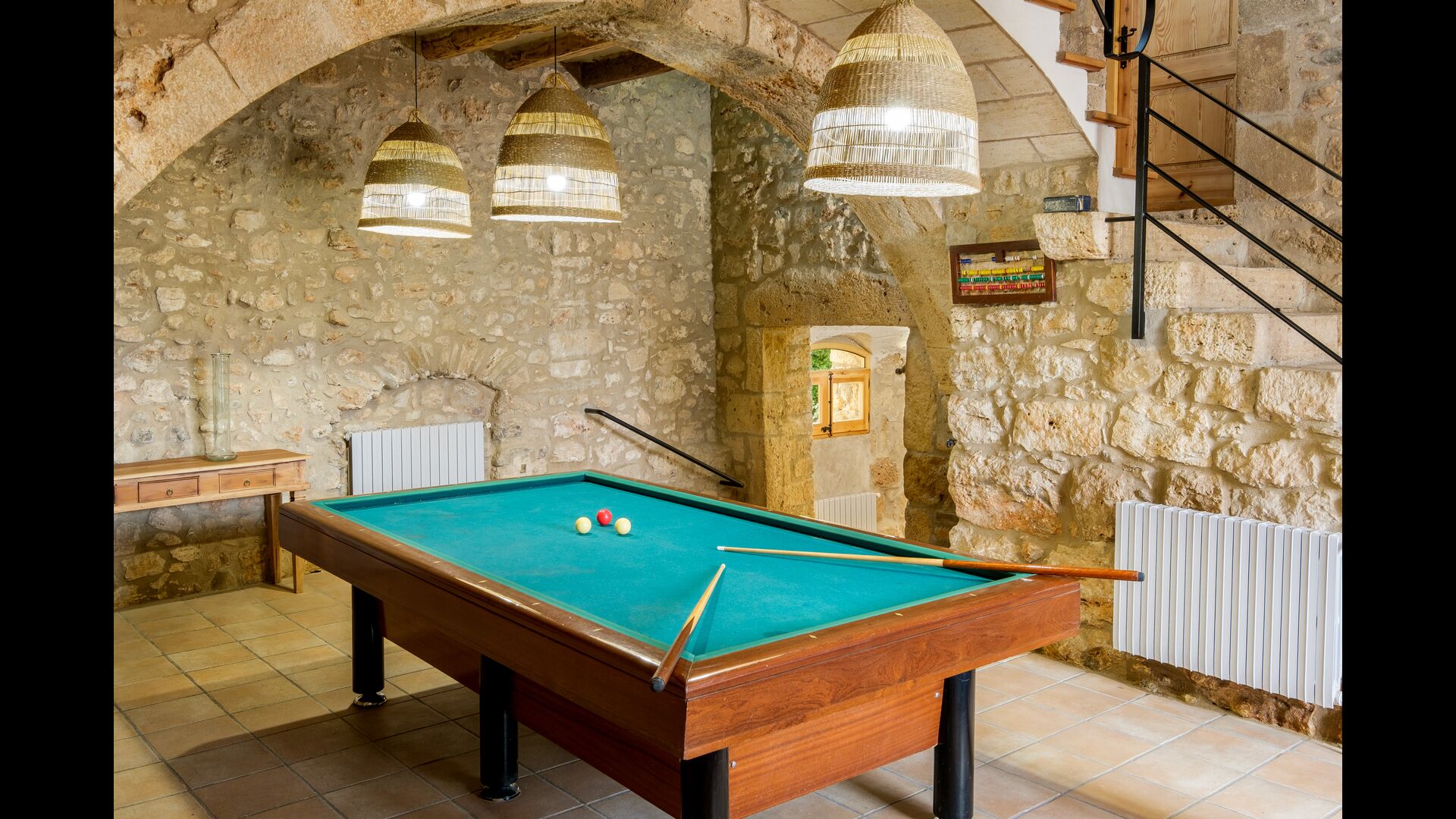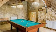 Entering from house’s main entrance at the back of the building, on the ground floor you will enter a big hall. Only a few steps away you will find a billiard table and table football – perfect for game nights with friends or family! Down to the right is another hall, coming with several medium-sized tables and benches, as well as two medium-sized sofas and a wide coffee table. In addition, you can directly access the garden from here, and is a great place to retreat indoors when you want a break from the warm sun.