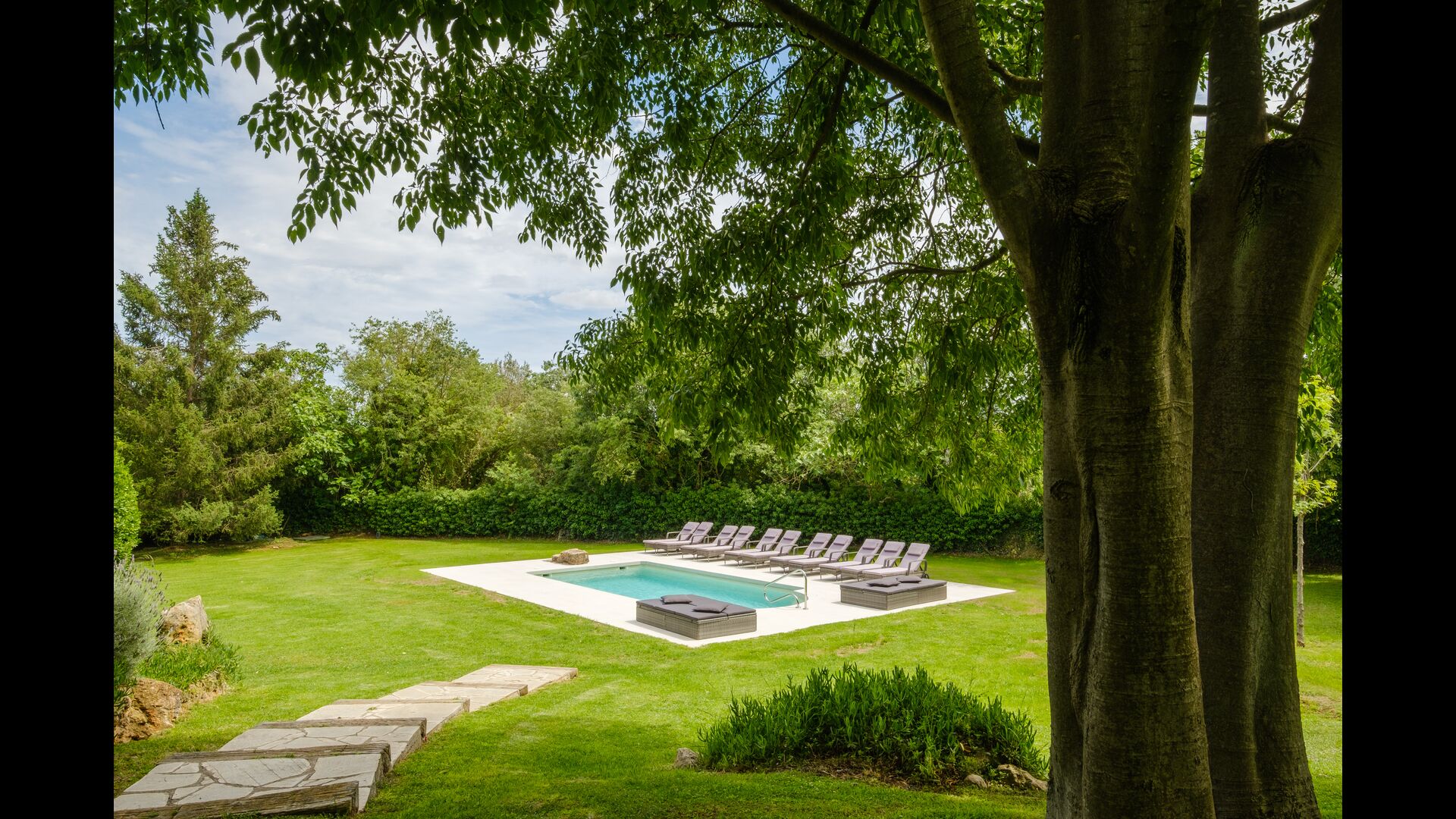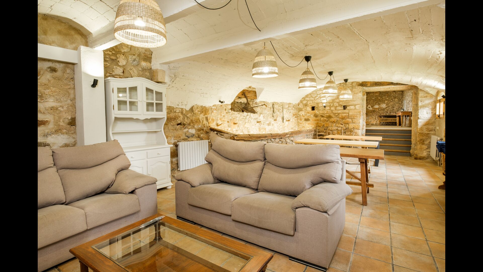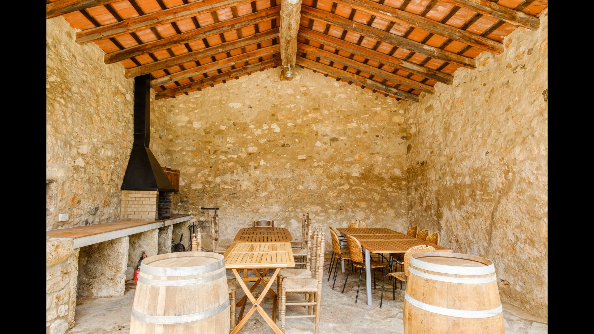 Entering from house’s main entrance at the back of the building, on the ground floor you will enter a big hall. Only a few steps away you will find a billiard table and table football – perfect for game nights with friends or family! Down to the right is another hall, coming with several medium-sized tables and benches, as well as two medium-sized sofas and a wide coffee table. In addition, you can directly access the garden from here, and is a great place to retreat indoors when you want a break from the warm sun.