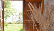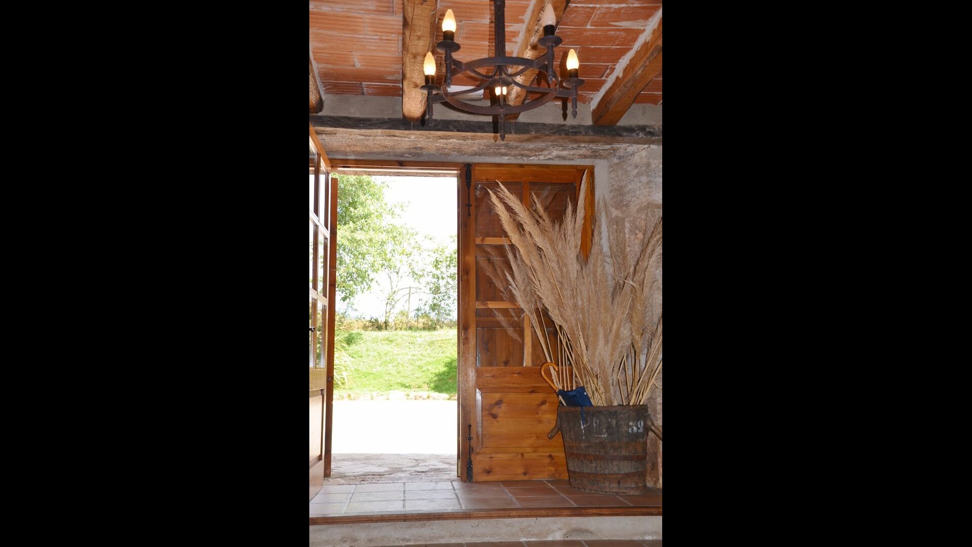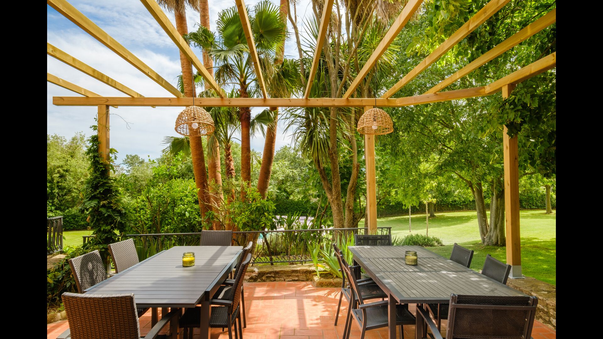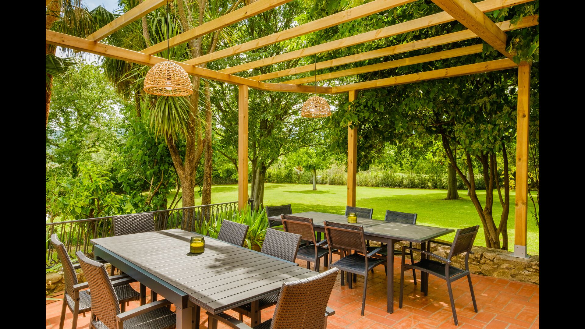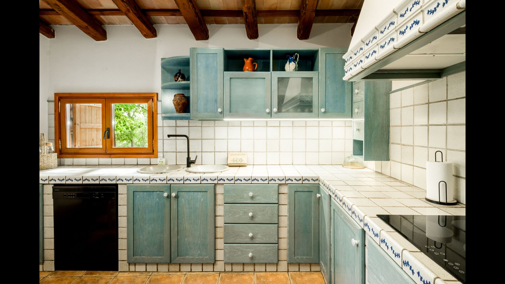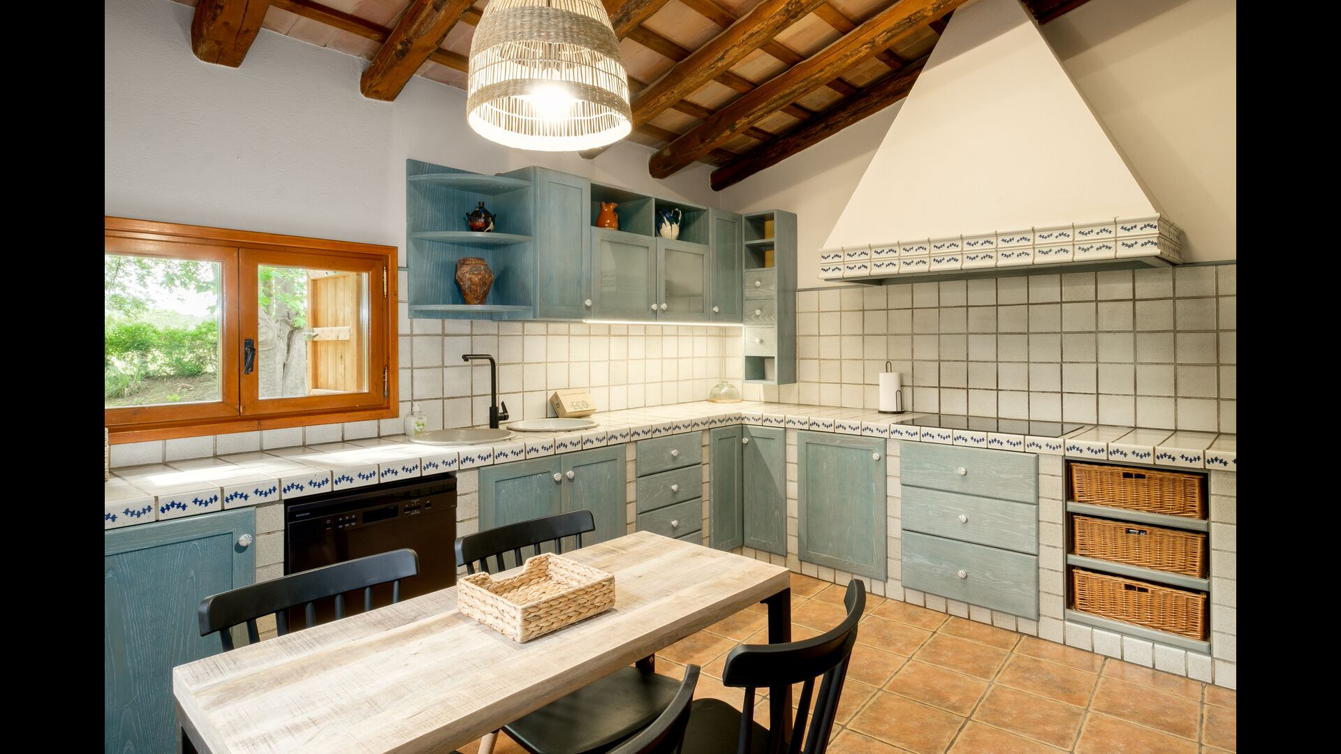 Also on the first floor is the kitchen, coming with all utilities expected of a modern-day holiday home (utensils, pots/pans, fridge, dishwasher, oven) – as well as a freezer, toaster, coffee machine, microwave, electric kettle, and rice cooker. The house’s terrace is accessible directly from the kitchen, easily allowing you to take your food outside to eat dinner at sunset, overlooking the setting sun, the garden, and the beautiful countryside further out (and if you’re hankering for a BBQ night, all the necessary equipment for grilling can be found on the other side of the house, under another covered terrace). You will also find 2 bedrooms and bathrooms on the first floor.