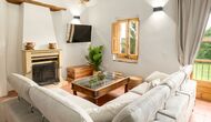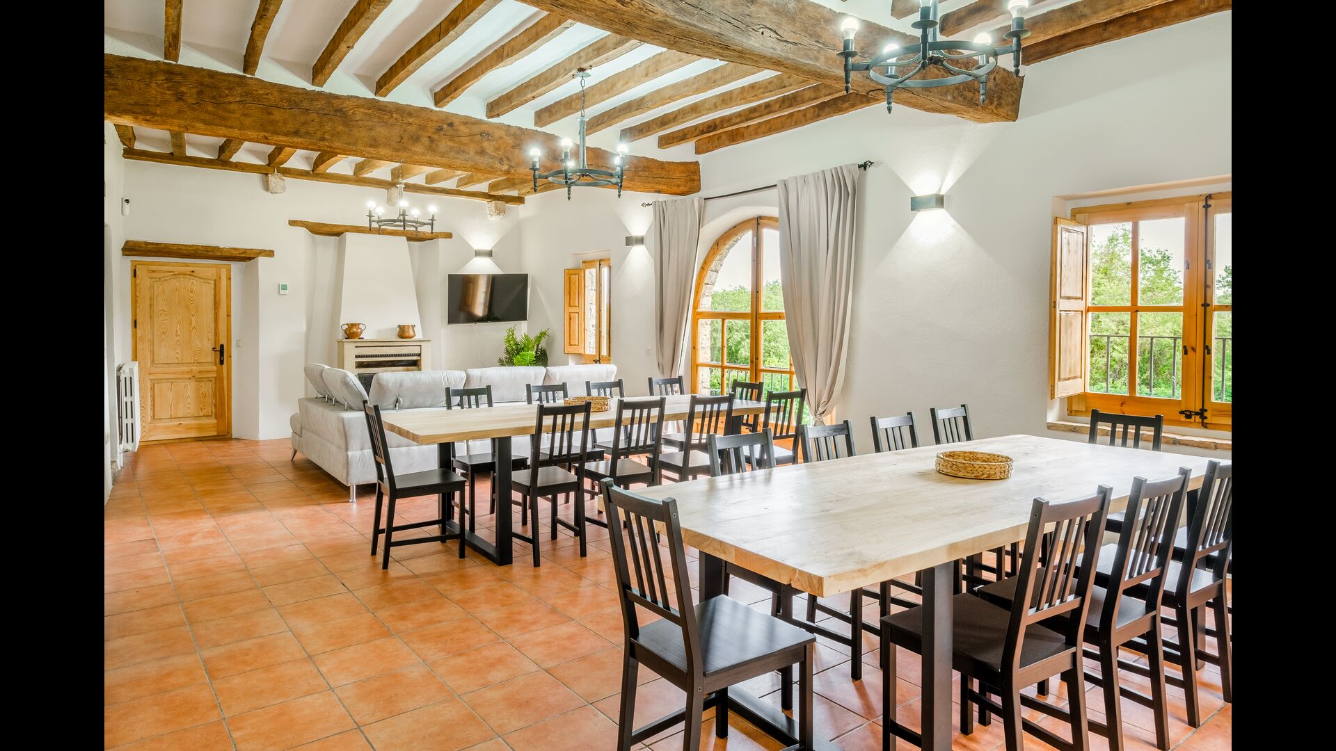 Heading upstairs from the entrance hall, you will find the house’s living room – coming with 2 large tables, each having 10 chairs respectively, perfectly suited for breakfast, lunch and dinner alike. Also in the living room, you will find a corner with a wall-mounted flatscreen TV and a medium-sized sofa, a coffee table, and a fireplace. From this area of the house, you have a great view of the surrounding areas on and close by Cubis.